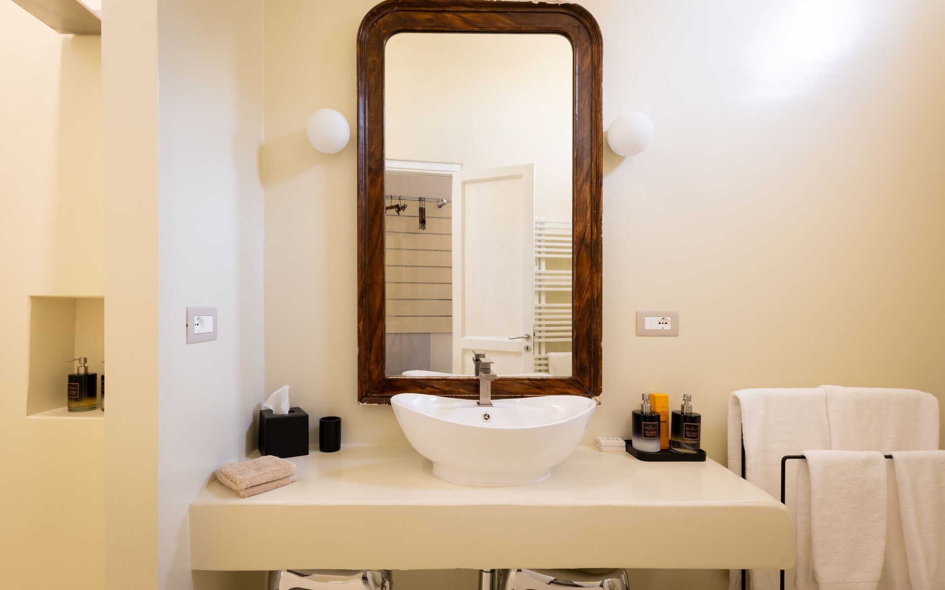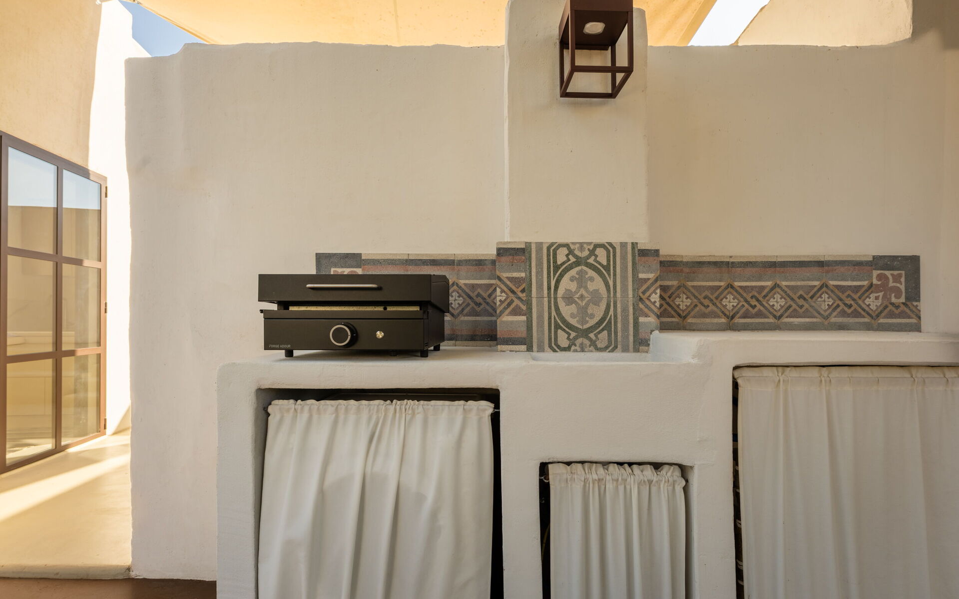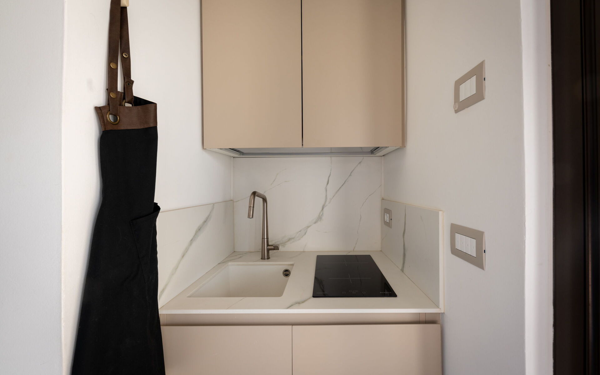 Casa Corte verfügt über ein Schlafzimmer, ein elegantes Badezimmer, einen kleinen Wohnbereich und eine Küchenzeile mit Kochplatte, Spülbecken, Kühlschrank und Mikrowelle sowie einem Toaster, Wasserkocher und einer Nespresso-Kaffeemaschine.