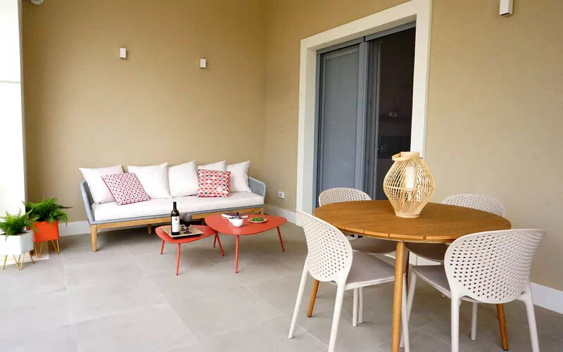 Jede Einheit verfügt über eine private Terrasse mit Essbereich und Außensofa, während der Garten und andere Außenbereiche mit anderen Gästen geteilt werden.