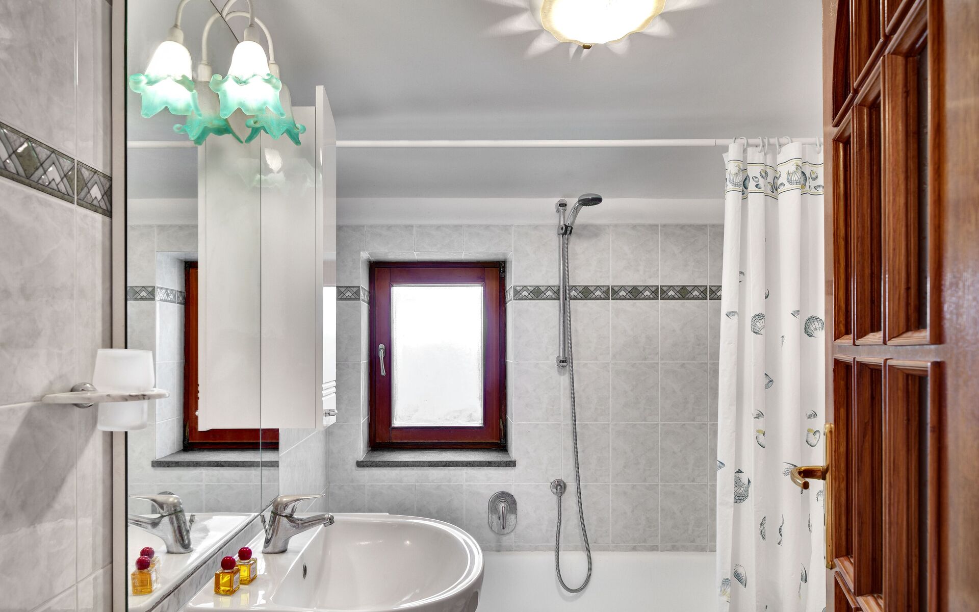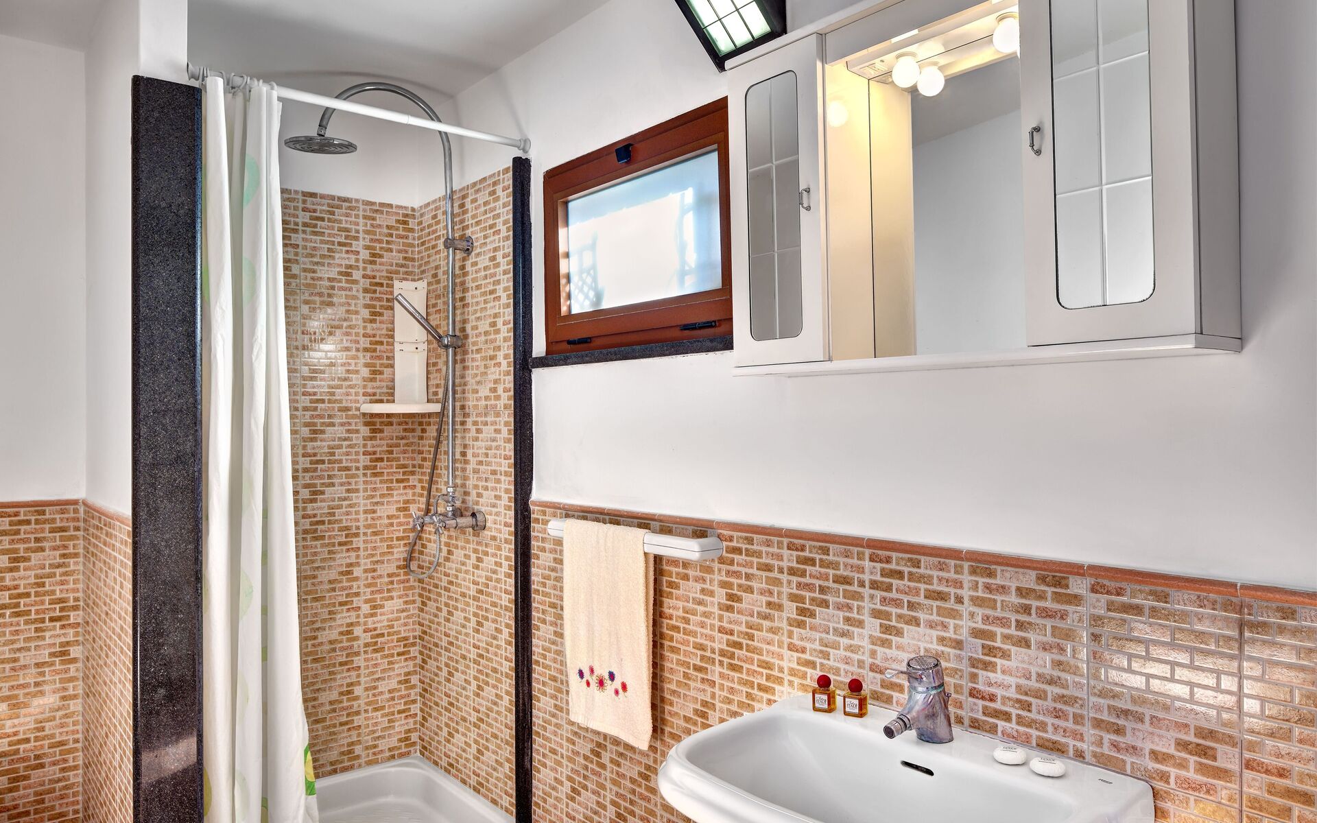 Erster Stock: drei geräumige Schlafzimmer: ein Doppelzimmer mit einem Doppelbett und ausreichend Platz im Kleiderschrank, ein Einzelzimmer mit Kingsize-Bett und ein drittes Schlafzimmer mit drei Einzelbetten, die auf eine große Panoramaterrasse führen. Auf dieser Ebene befindet sich auch das Hauptbadezimmer.