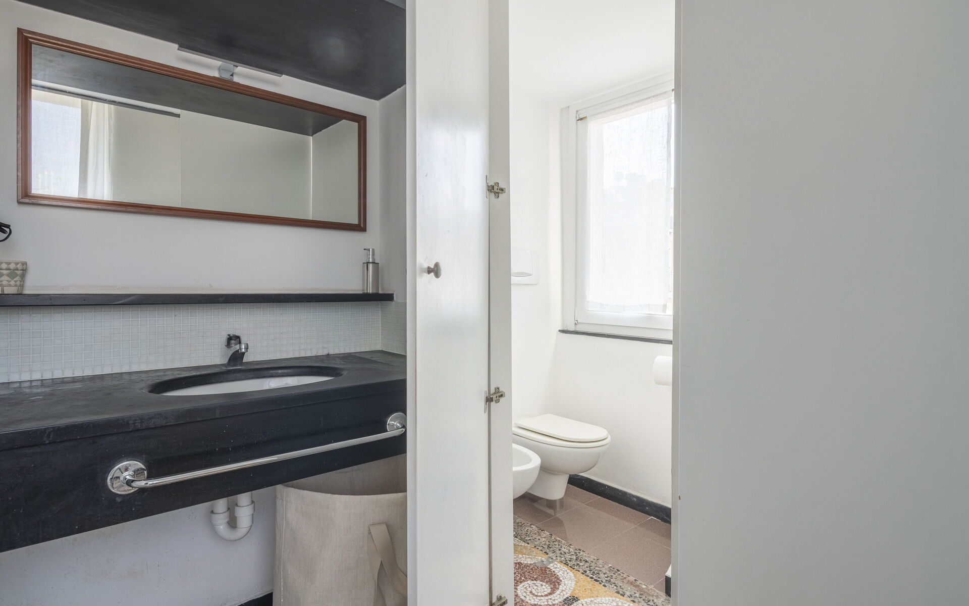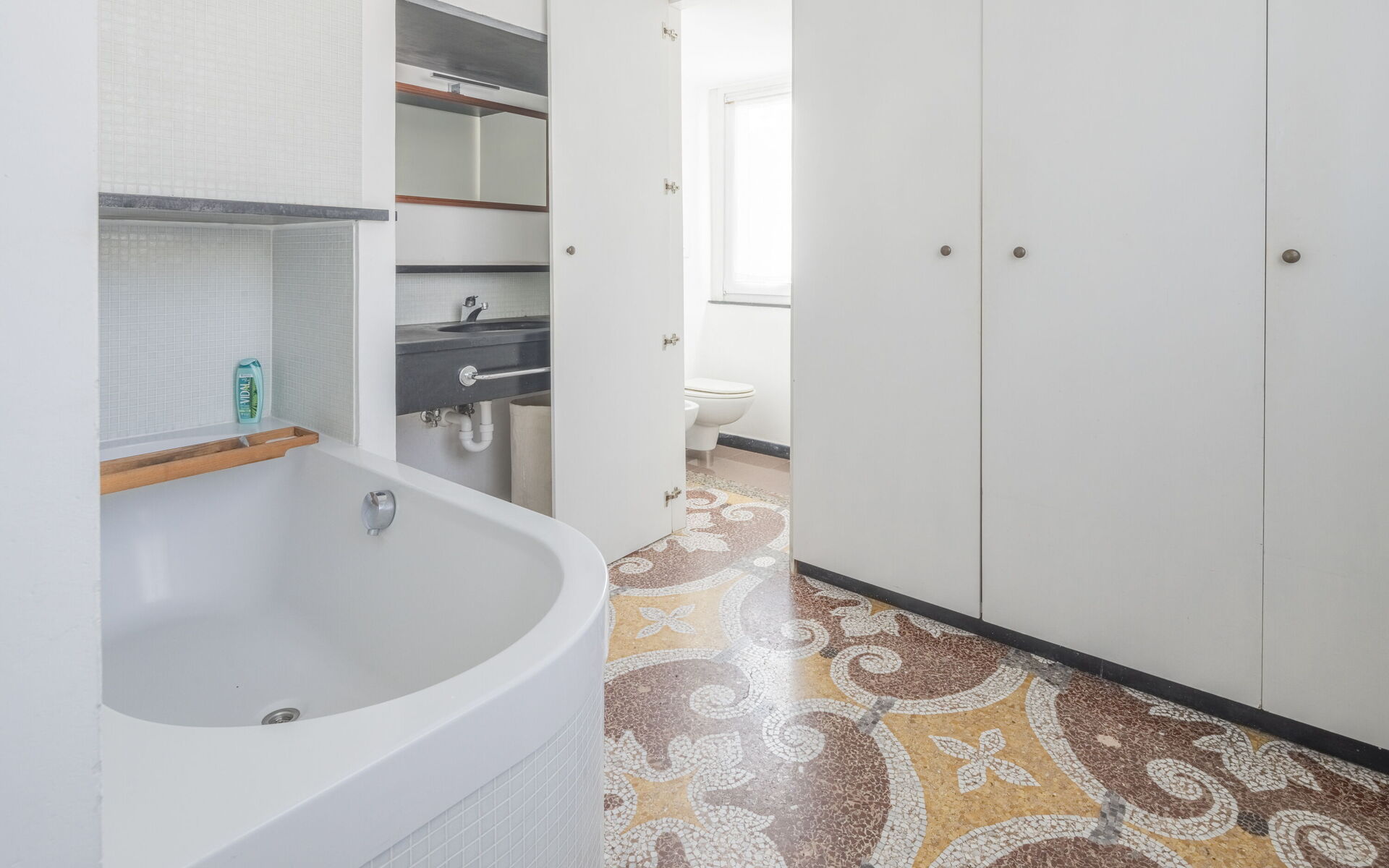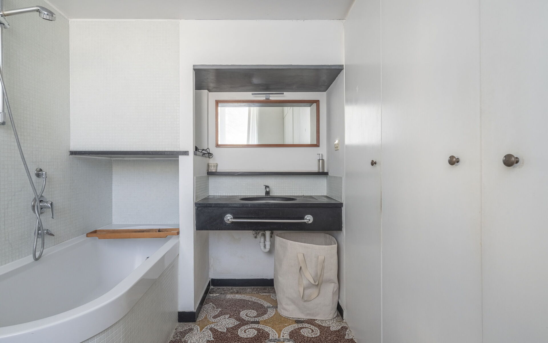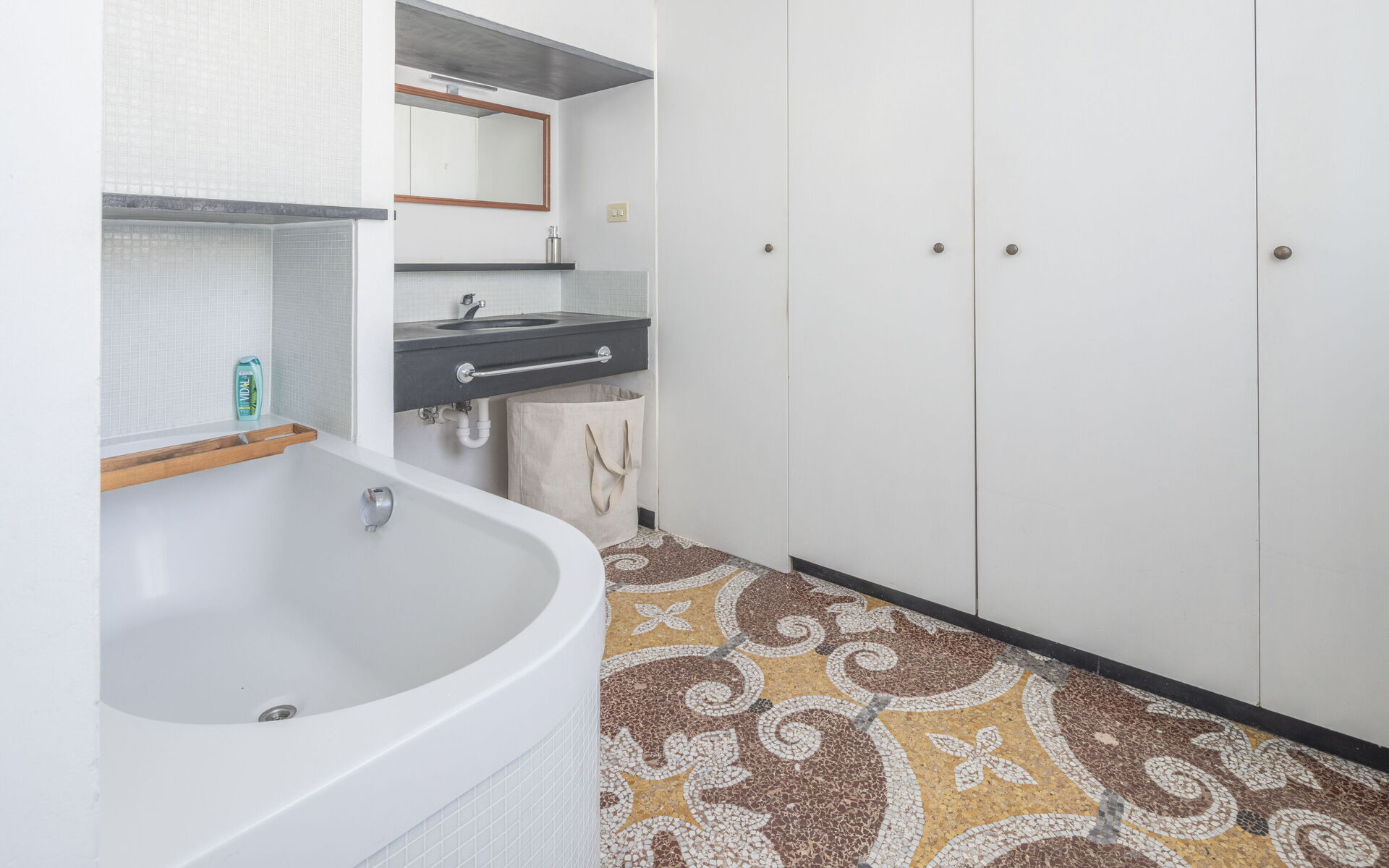 Im ersten Stock befindet sich ein elegantes „französisches“ Badezimmer mit separatem WC, einer Badewanne mit Dusche sowie einem geräumigen Kleiderschrank, der Platz und Funktionalität bietet.