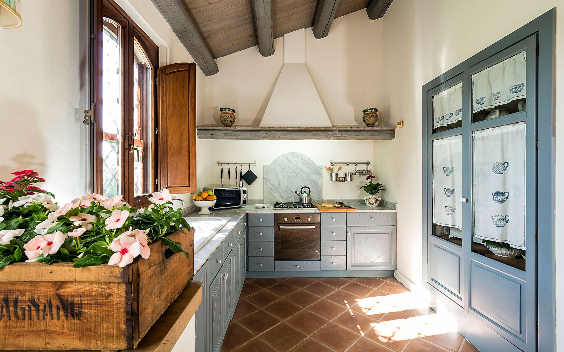 gut ausgestattete Küche, Bügeleisen, Ofen, Tiefkühler, Kühlschrank, Internet, WiFi Internet, Spülmaschine, Italienische Kaffeemaschine, Mikrowelle, Herd, Rauchmelder, Kinderhochstuhl, Esstisch, Toaster, Ausgang auf den Garten, Fliegengitter