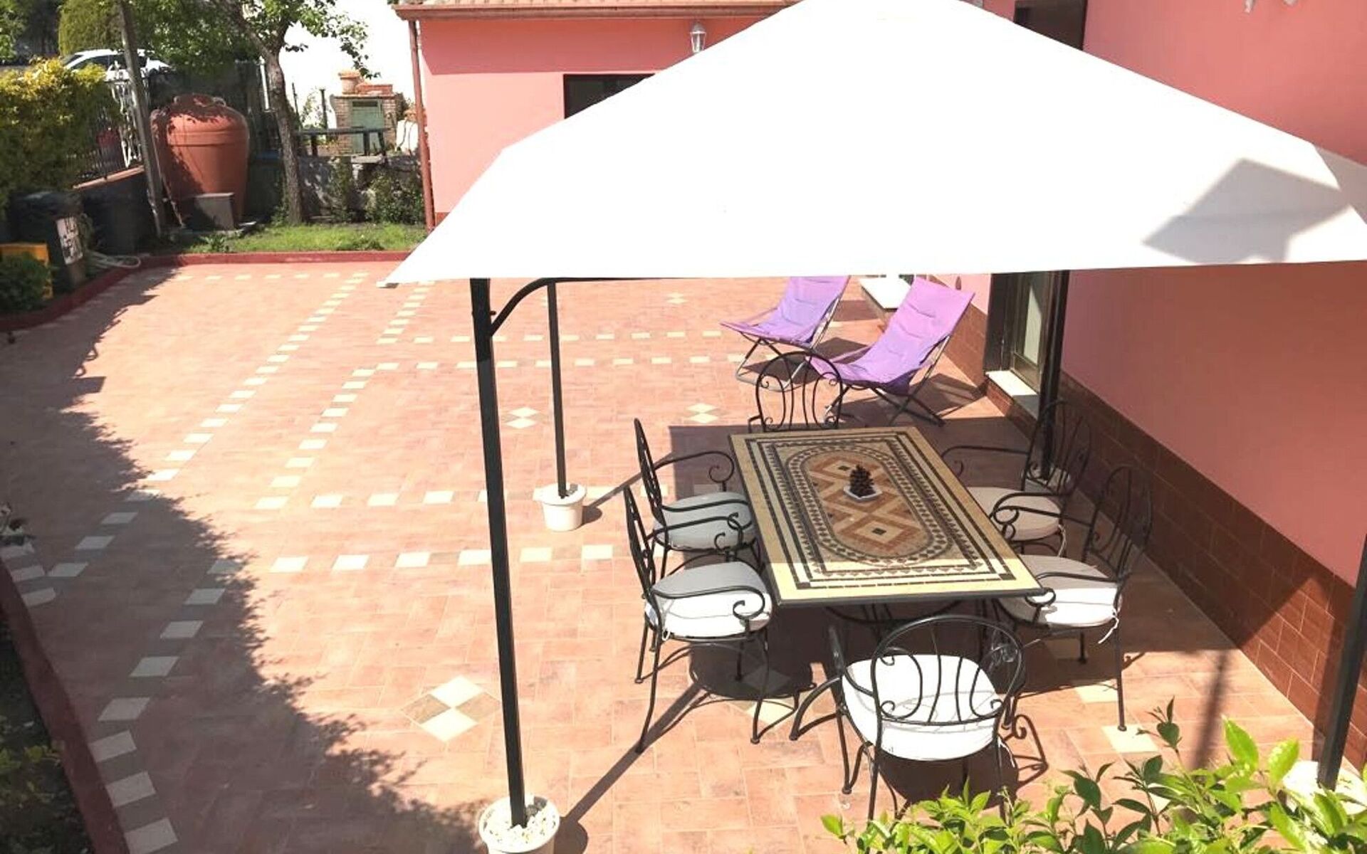 Außenbereich für das Essen im Freien, umzäuntes Grundstück, Sonnenliege, Esstisch