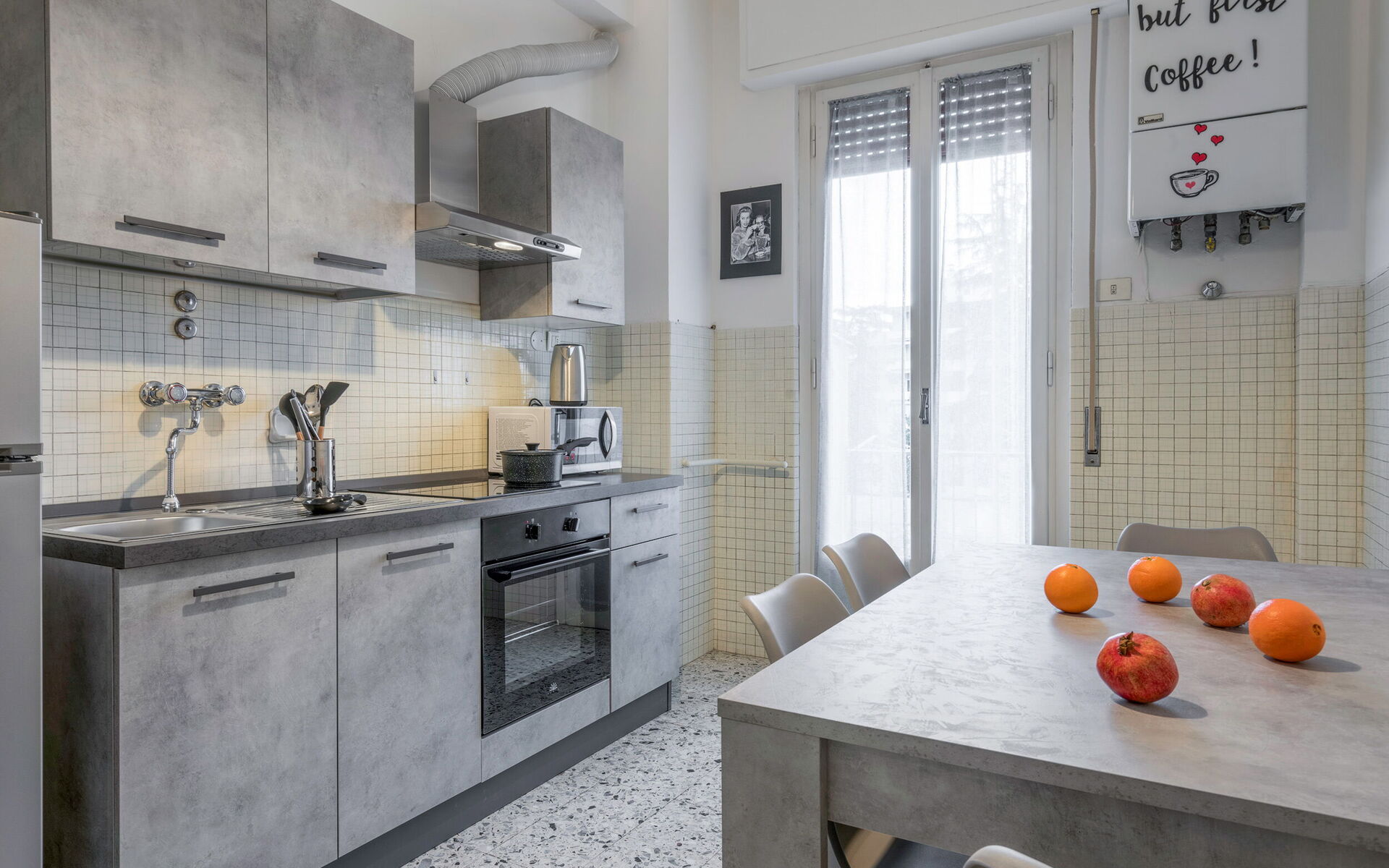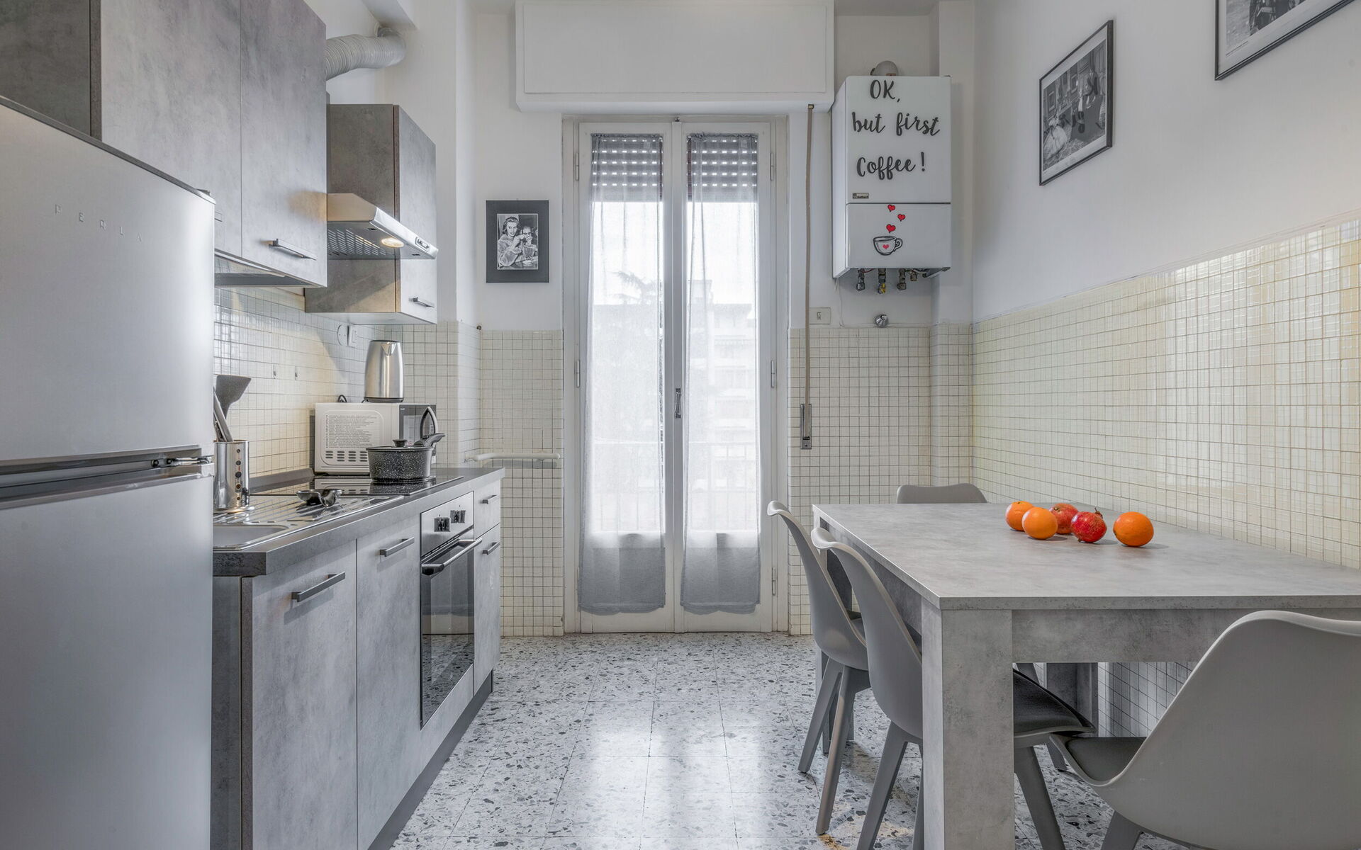 gut ausgestattete Küche, Tiefkühler, Kühlschrank, WiFi Internet, Italienische Kaffeemaschine, Mikrowelle, Herd, Esstisch, Ausgang auf den Balkon