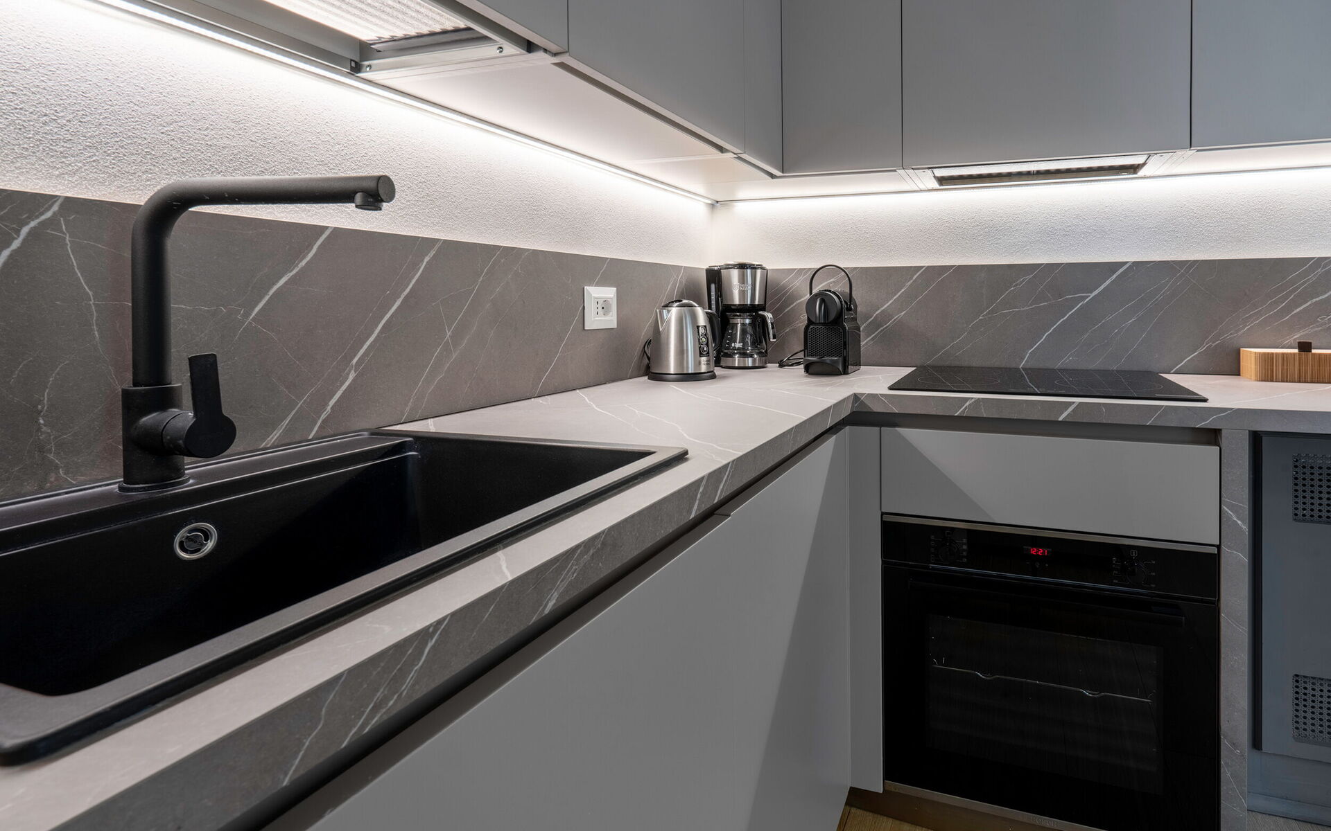 Wohnung auf zwei Ebenen, bestehend aus einem hellen Wohnzimmer mit kleinem Garten, Küche, Mezzanin mit Schlafsofa, Schlafzimmer mit Doppelbett, Bad
