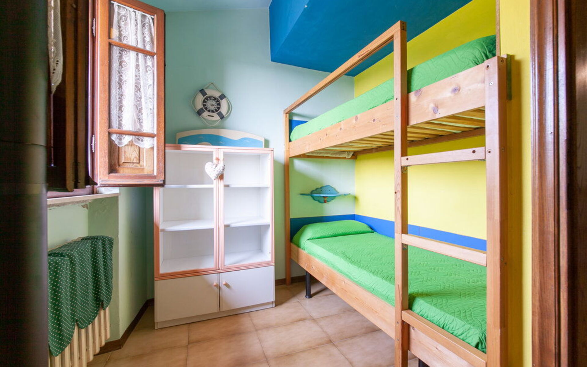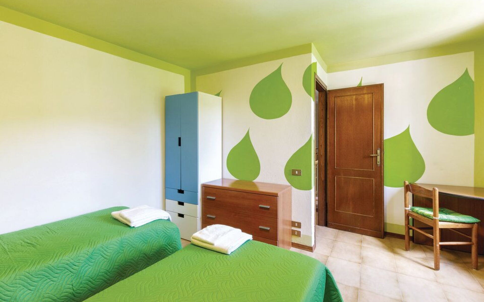 Im ersten Stock befinden sich die Schlafzimmer und Bäder. Der Schlafbereich besteht aus 4 Zimmern mit einem Bett: 1 Zimmer mit einem Doppelbett, 2 Zimmer mit einem Doppelbett und einem Einzelbett, 1 Zimmer mit einem Etagenbett.