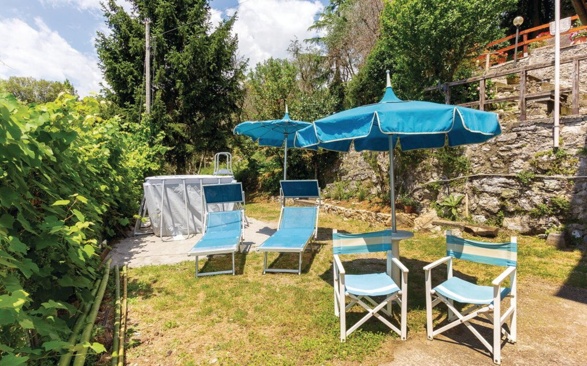 Gartenmöbel, Grill, Schwimmbad, Außenbereich für das Essen im Freien, eingezäunt, Sonnenliege, Esstisch