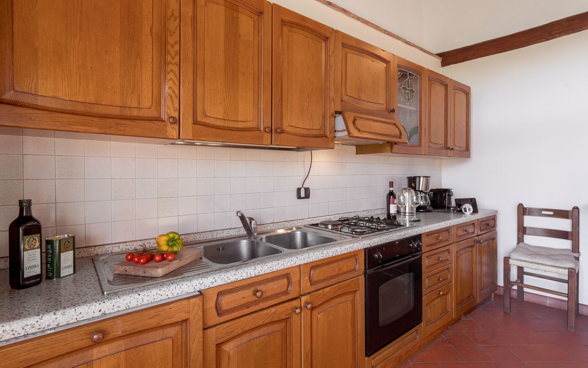gut ausgestattete Küche, Ofen, Tiefkühler, Kühlschrank, WiFi Internet, Spülmaschine, Amerikanische Kaffeemaschine, Herd, Kinderhochstuhl, Esstisch, Ausgang auf den Garten