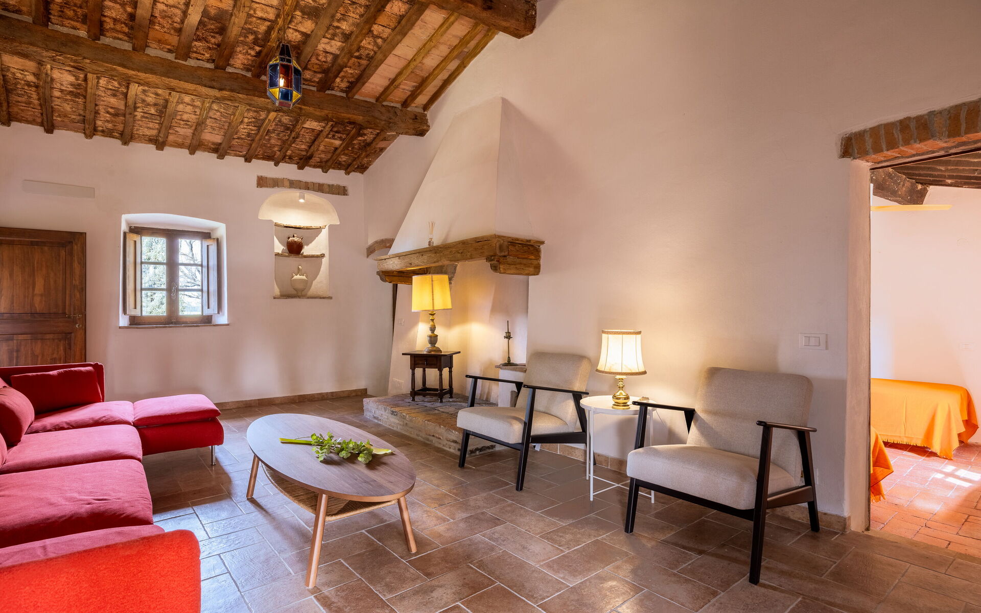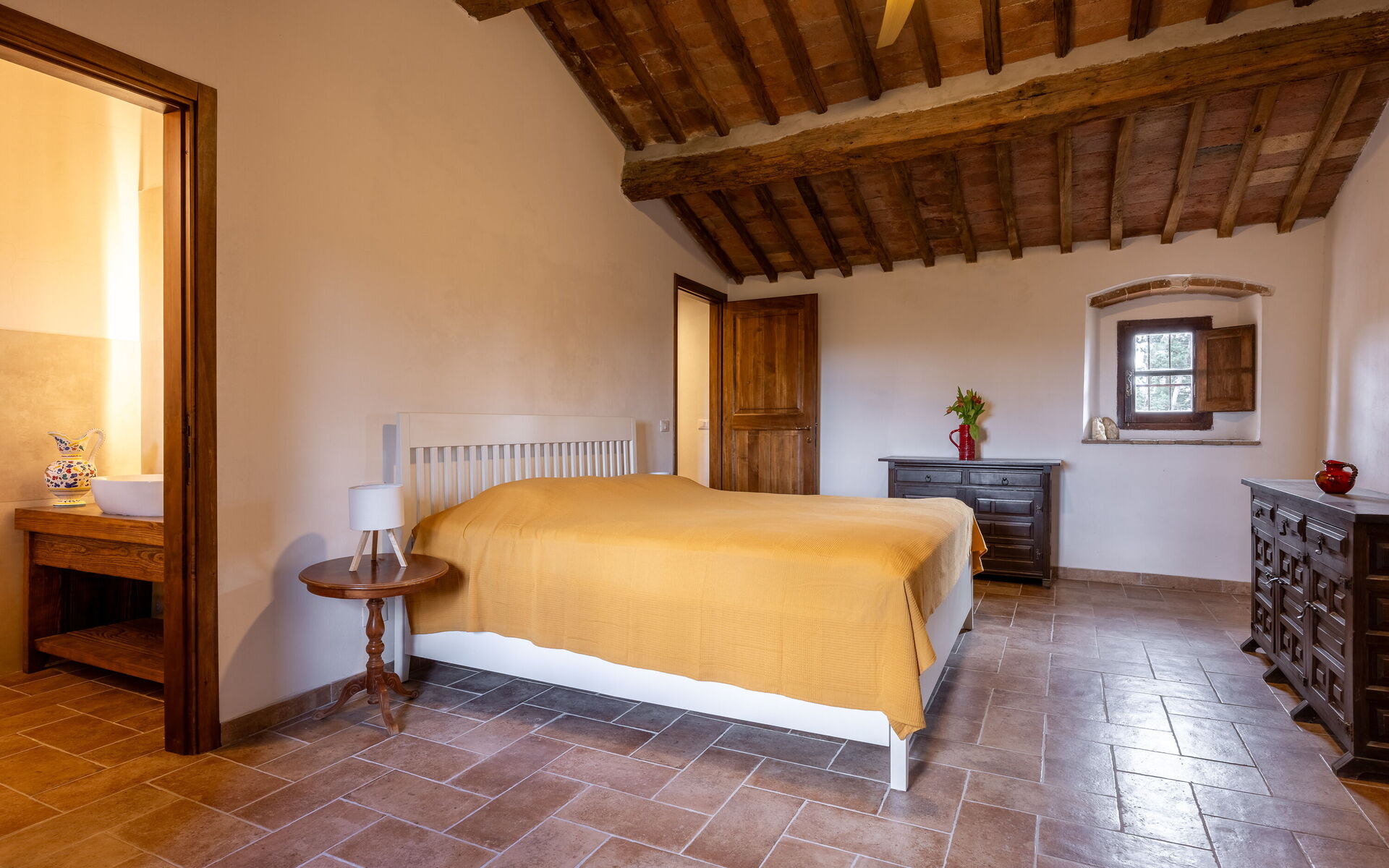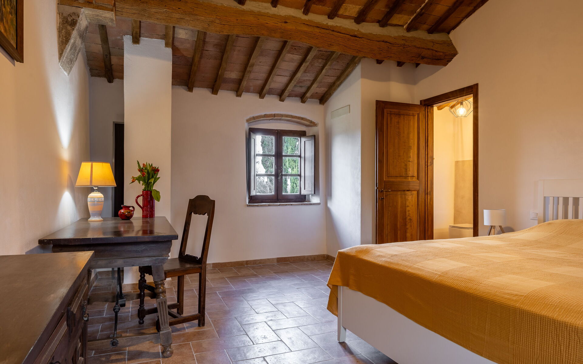 Die Lage ist ideal, um die Toskana zu erkunden: San Gimignano ist 30 Minuten entfernt, Siena 40 Minuten, Volterra 50 Minuten und Florenz etwa eine Stunde, ebenso wie die reizvollen Dörfer des Val d’Elsa. Der Panoramapool direkt vor dem Haupthaus lädt zu Momenten voller Ruhe und Wohlbefinden ein.