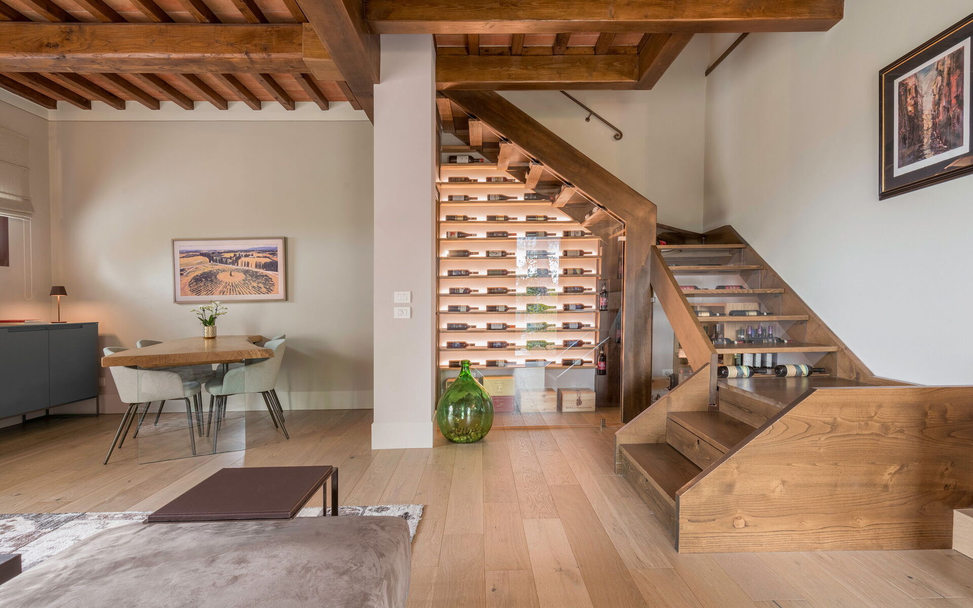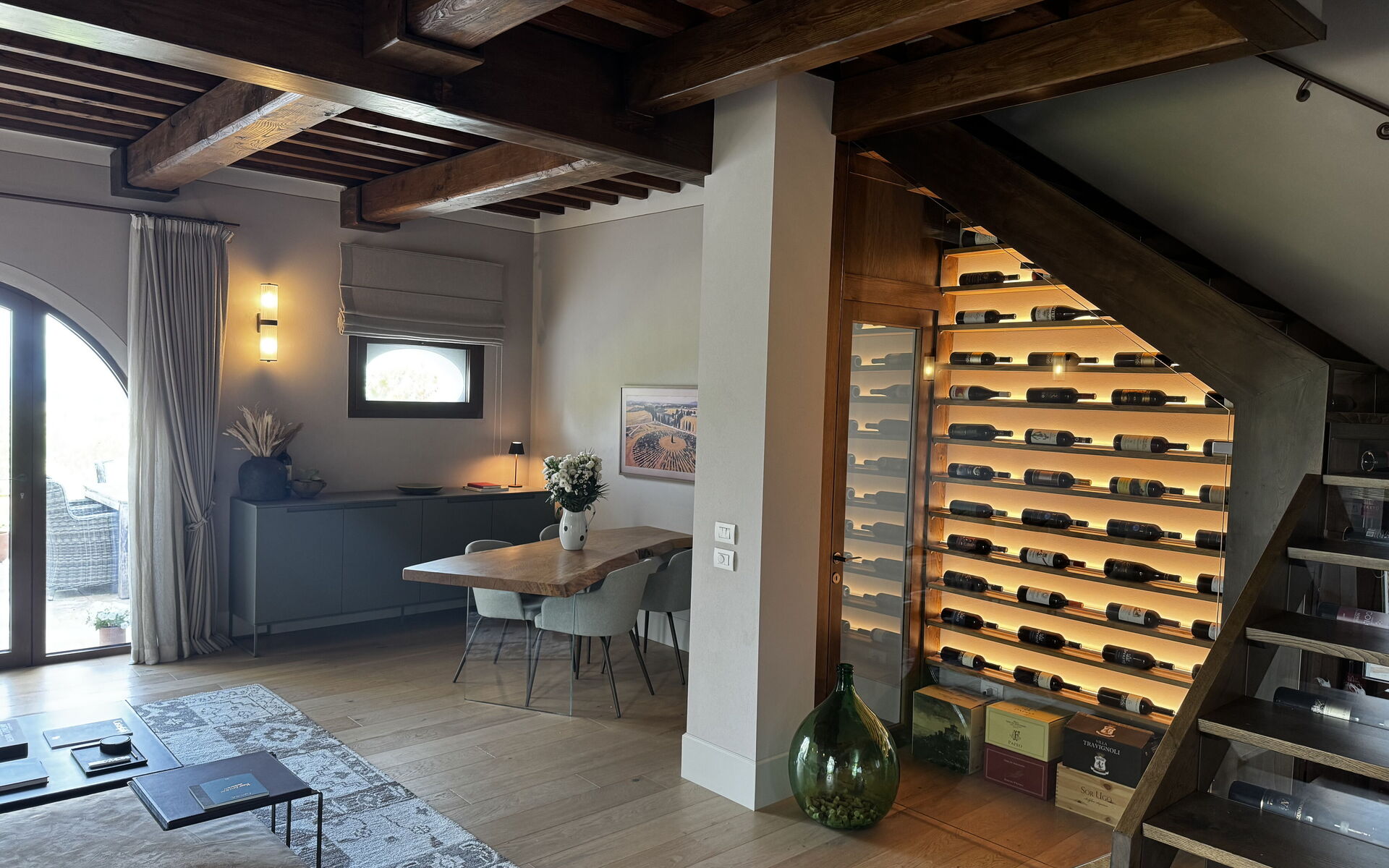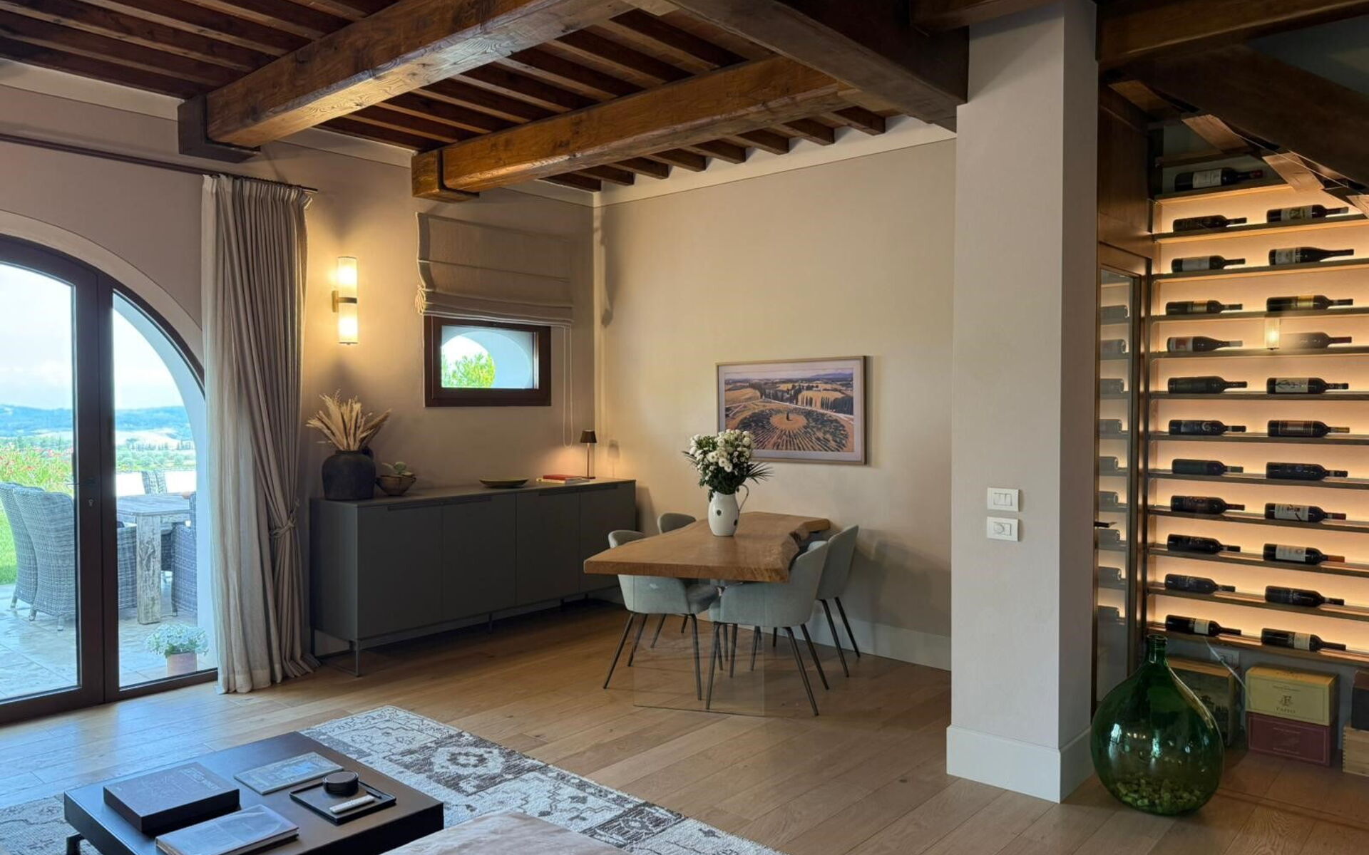 Moderne Eleganz trifft auf zeitlose toskanische Raffinesse. Betreten Sie dieses Traumhaus und lassen Sie sich sofort in eine andere Welt entführen. Hochwertige Möbel, modernste Geräte und edle Ausstattungen verleihen diesem Anwesen ein unvergleichliches Ambiente – ganz wie in einem 5-Sterne-Luxushotel. Hohe Decken mit Holzbalken auf beiden Etagen und atemberaubende Panoramablicke über die Hügellandschaft und Weinberge verkörpern das authentische Flair der Toskana.