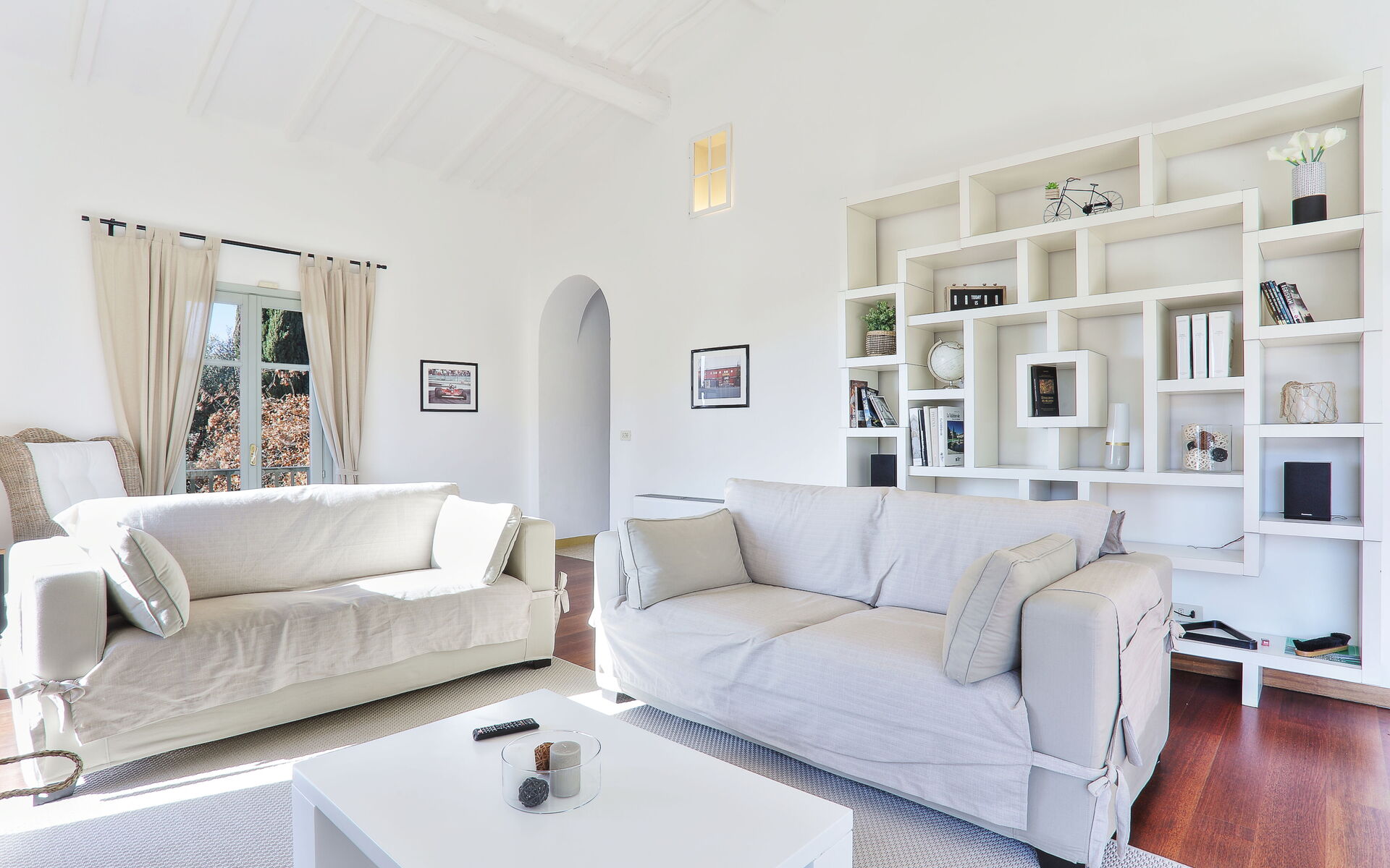 Das große Wohnzimmer ist wunderbar, mit einem Billardtisch, zwei großen Sofas, Sat-TV und großen Öffnungen, die nach draußen schauen. Das Weiß der Wände, die hohe Decke mit sichtbaren Balken machen die ganze Umgebung besonders eindrucksvoll und einladend.