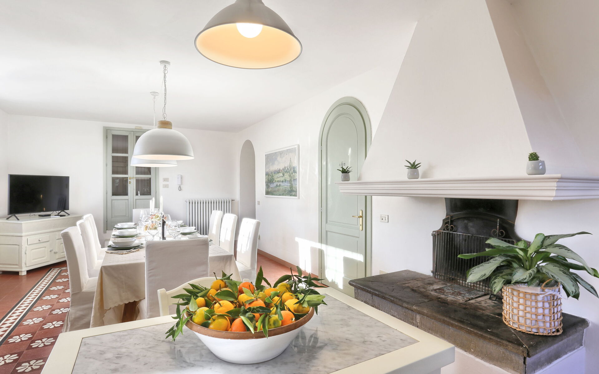 5-Flammen-Kochfeld, Umluftbackofen, Mikrowelle, Kaffeemaschine, Wasserkocher, Orzier, Spüle mit Doppelbecken und Einzelbeckenspüle beide aus Stein zusammen mit einem Beistelltisch vervollständigen die Ausstattung der Küche, die direkt mit dem Außenraum verbunden ist Französisches Fenster und ermöglicht es Ihnen, eine Terrasse zu erreichen, auf der ein Tisch für 10 Personen steht, an dem Sie bei Beleuchtung zu Mittag oder zu Abend essen können.