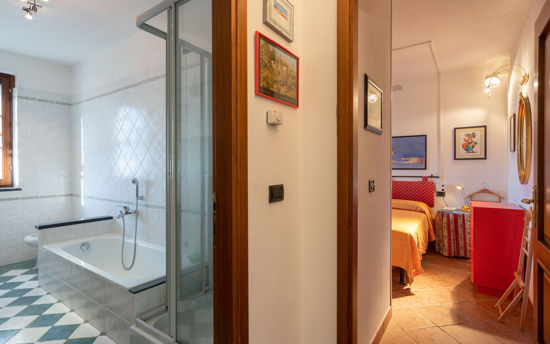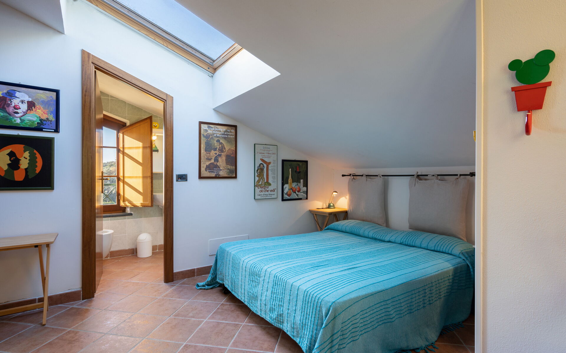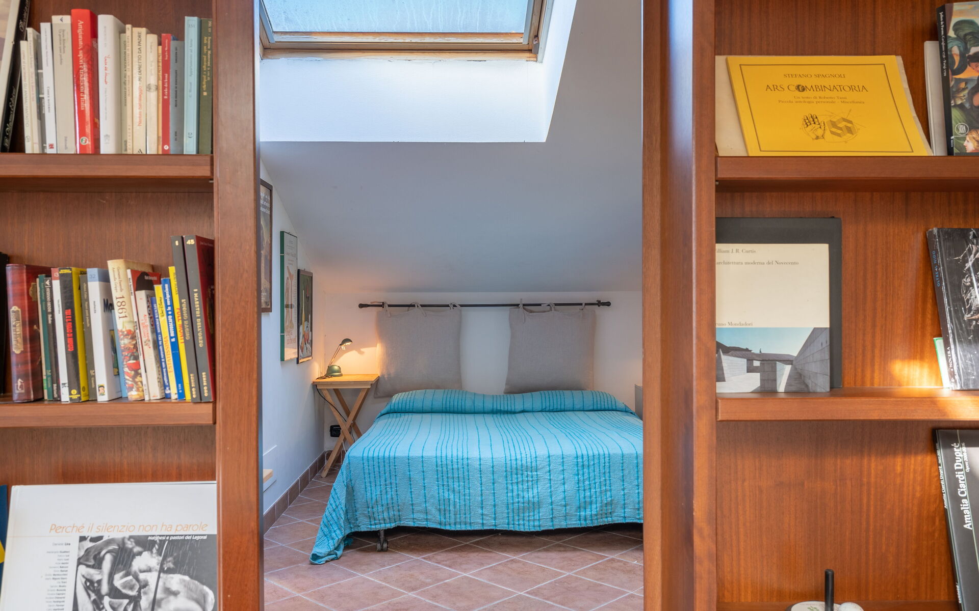 Open-plan double bedroom (library walls are sliding) and single sofa bed, bathroom (bidet, wc) with shower box.
