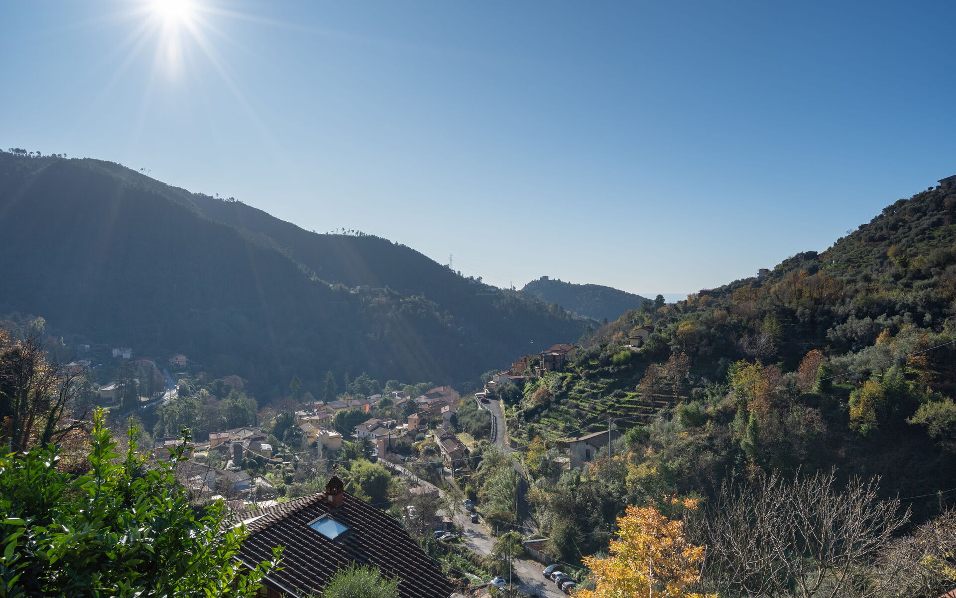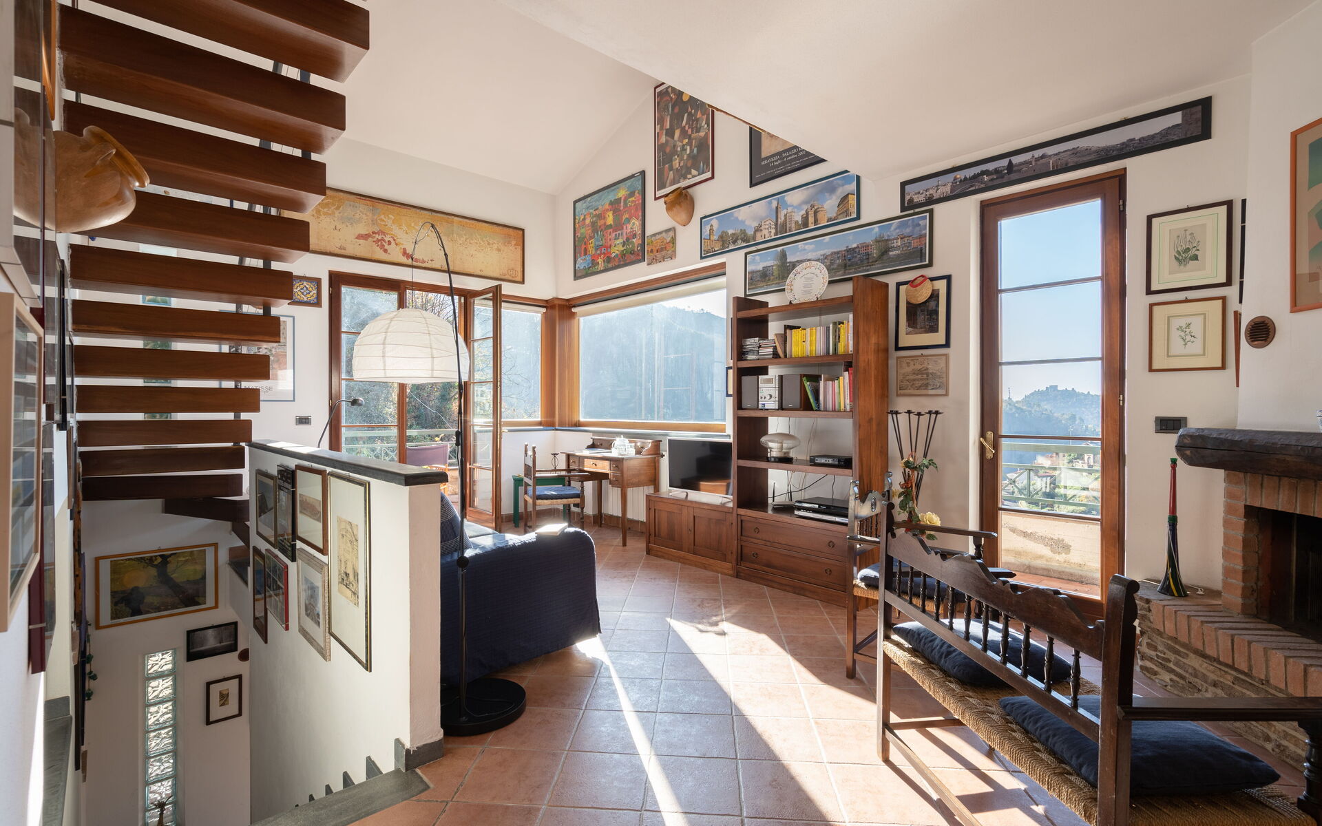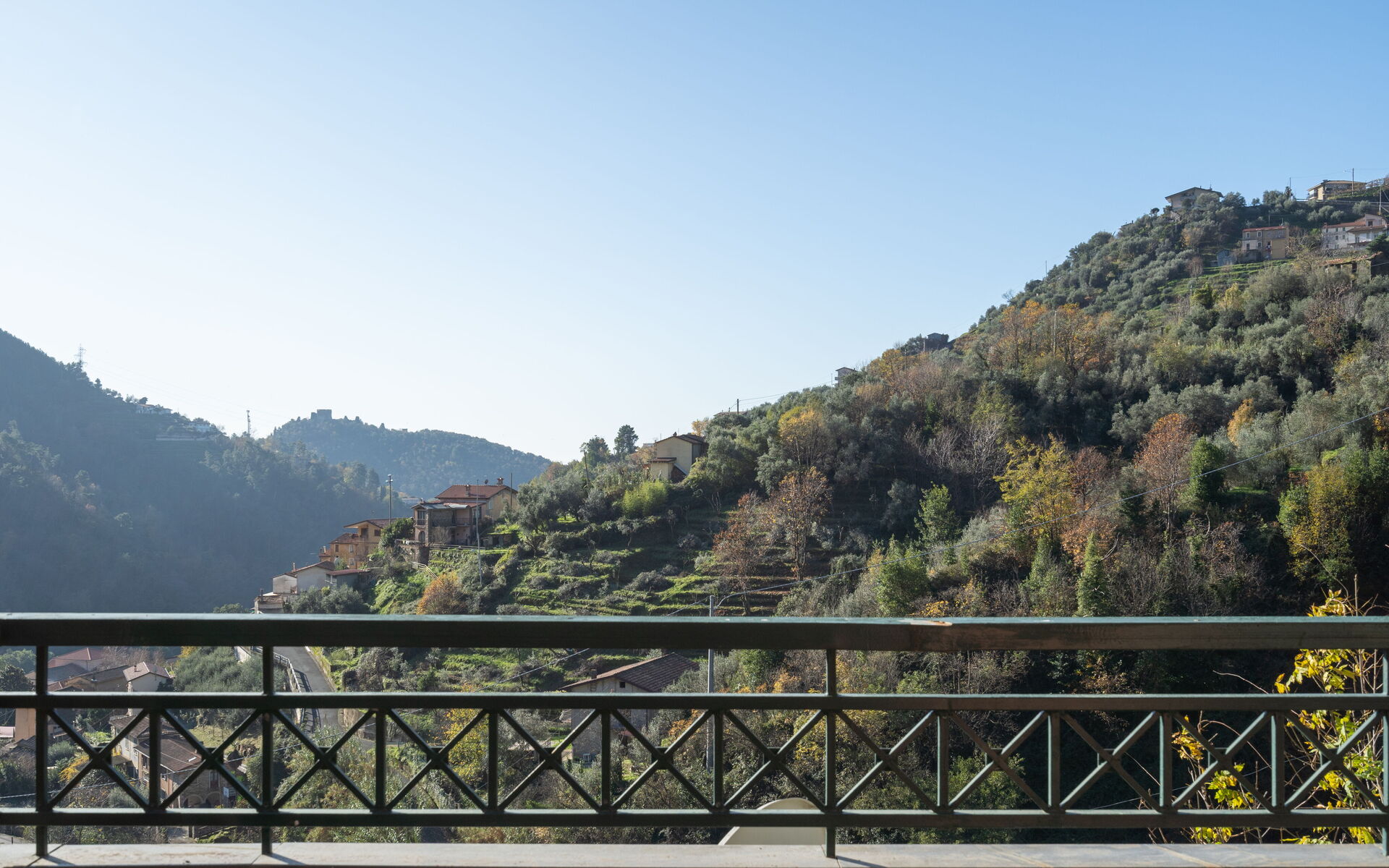 Main entrance, living room with fireplace and panoramic view of the valley, bathroom (bidet, wc) with bath and hydromassage shower, double bedroom with ceiling fan, balcony on two sides.