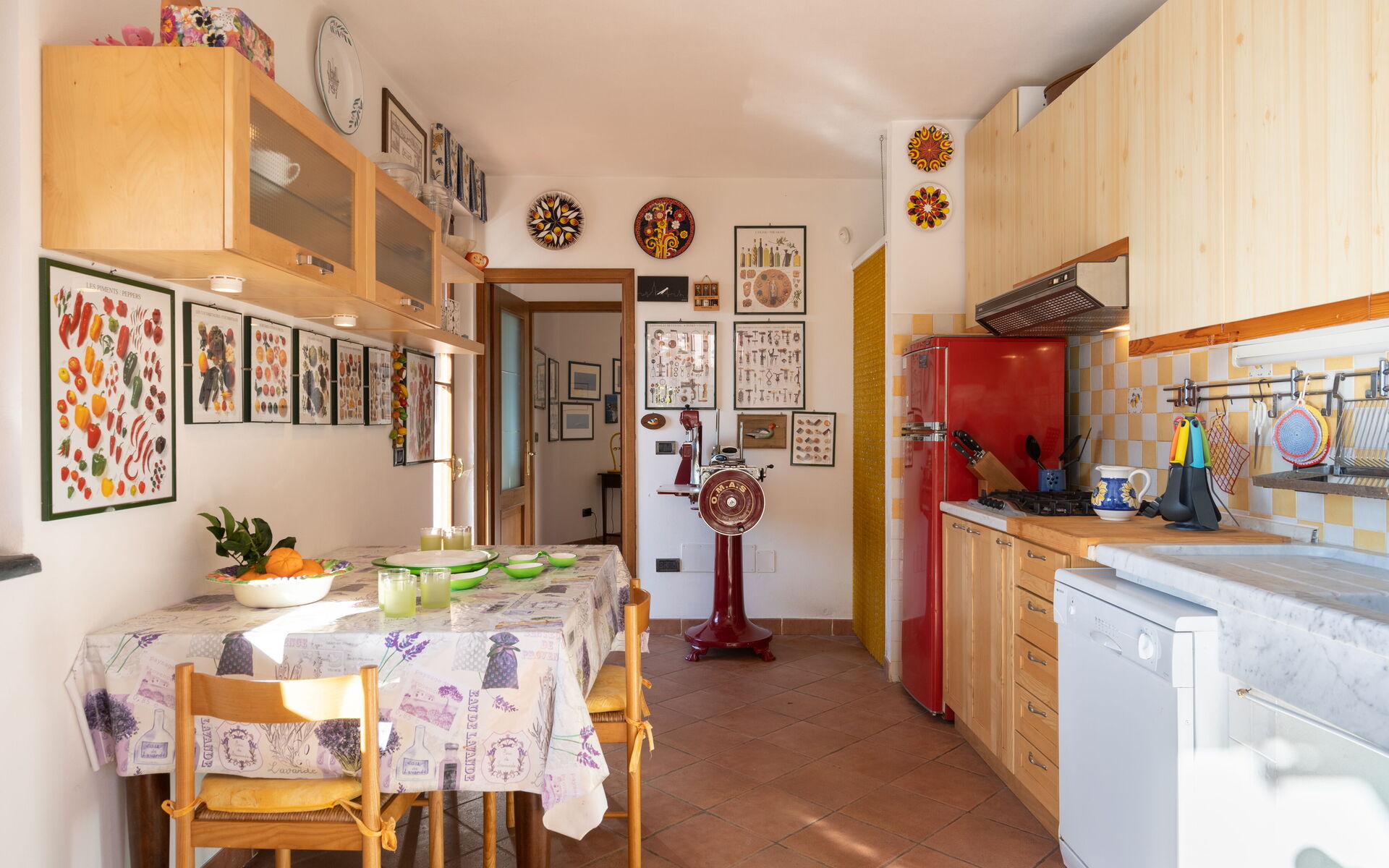 Tiefkühler, Kühlschrank, Spülmaschine, Italienische Kaffeemaschine, Mikrowelle, Herd, Esstisch, Ausgang auf die Terrasse