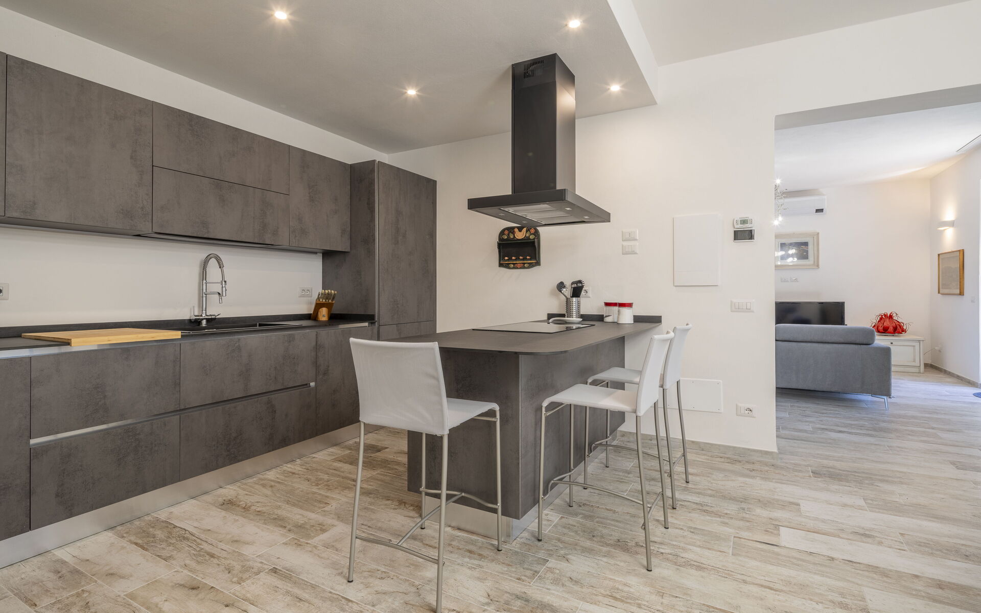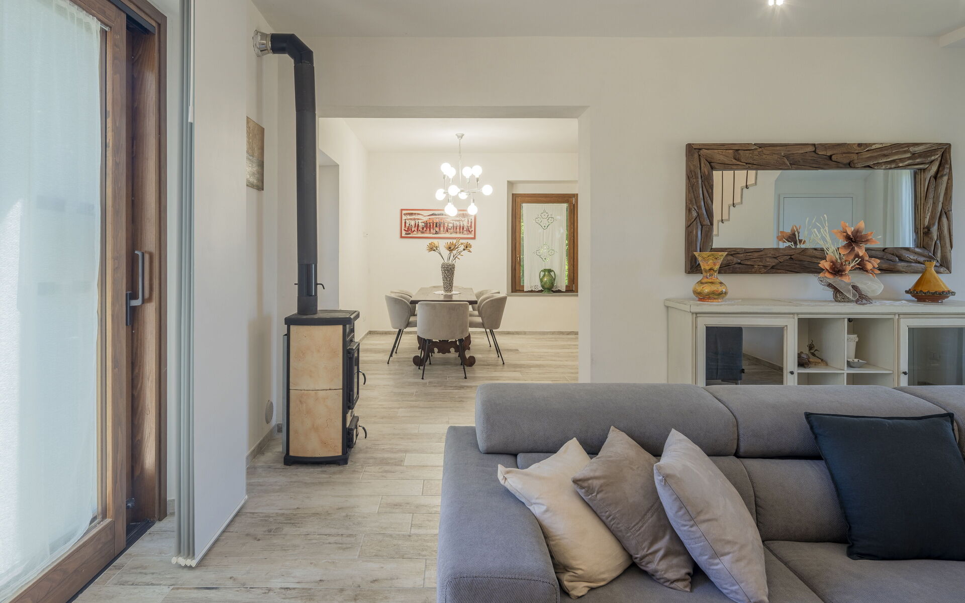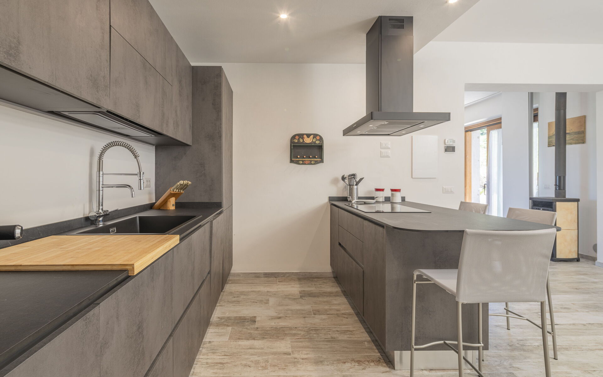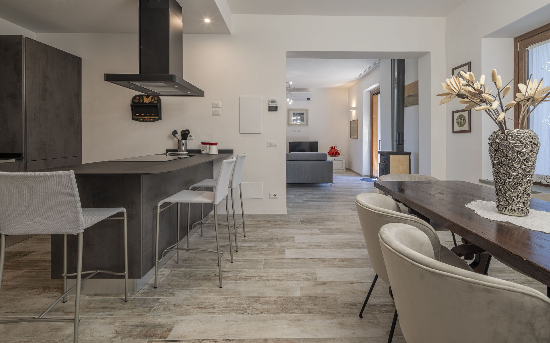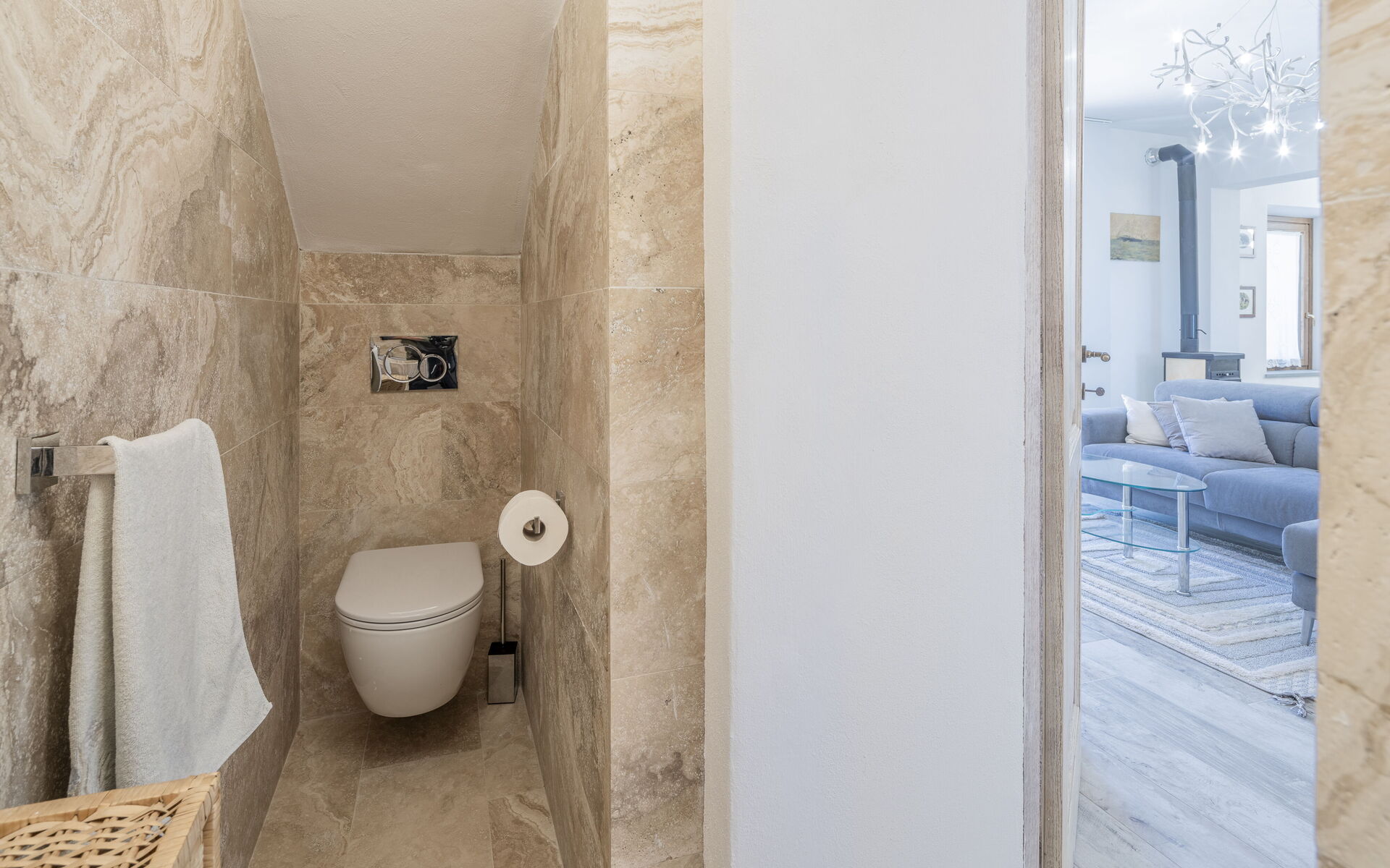 Erdgeschoss mit Küche, ausgestattet mit Kaffeemaschine, Induktionskochfeld und Backofen. Essbereich direkt neben der Küche. Wohnzimmer mit bequemem Sofa und Fernseher. Gäste-WC.