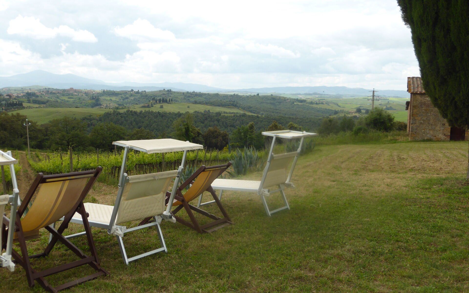 Draußen Rasen mit Stühlen, Liegestühlen, Sonnenschirmen ausgestattet. Etwas weiter unten befinden sich die beiden Schwimmbäder, der Tennisplatz und die ausgestatteten Parks der Fattoria del Colle, die gemeinsam mit den anderen Gästen des Bauernhauses genutzt werden können.