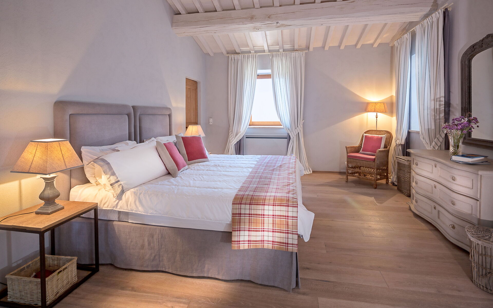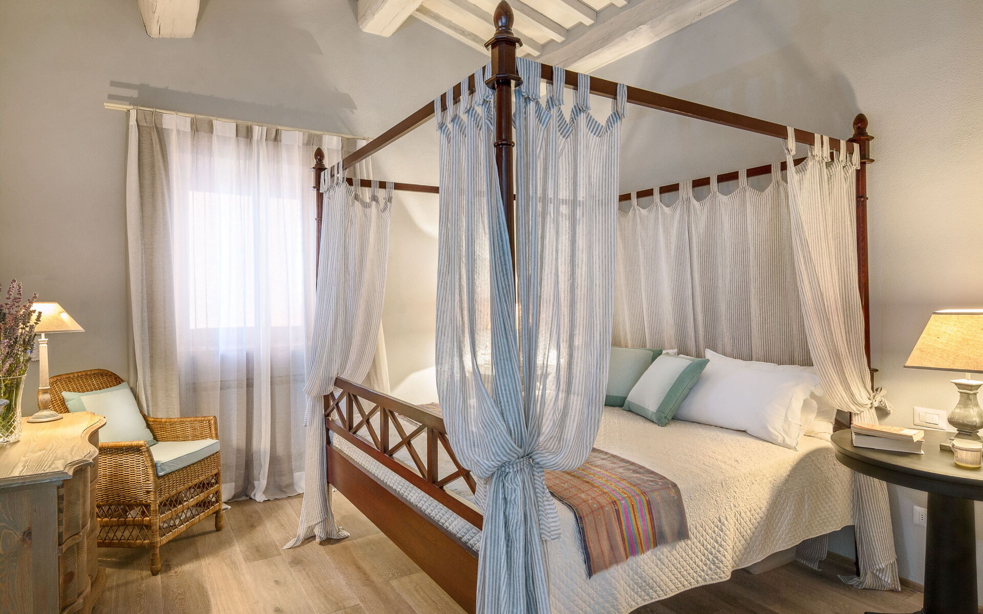 Der Schlafbereich umfasst zwei schöne und geräumige Kingsize-Schlafzimmer, jedes mit eigenem Bad. Ein prächtiges Schlafzimmer mit einem Himmelbett verfügt ebenfalls über ein eigenes Bad und schafft eine einzigartige Atmosphäre.