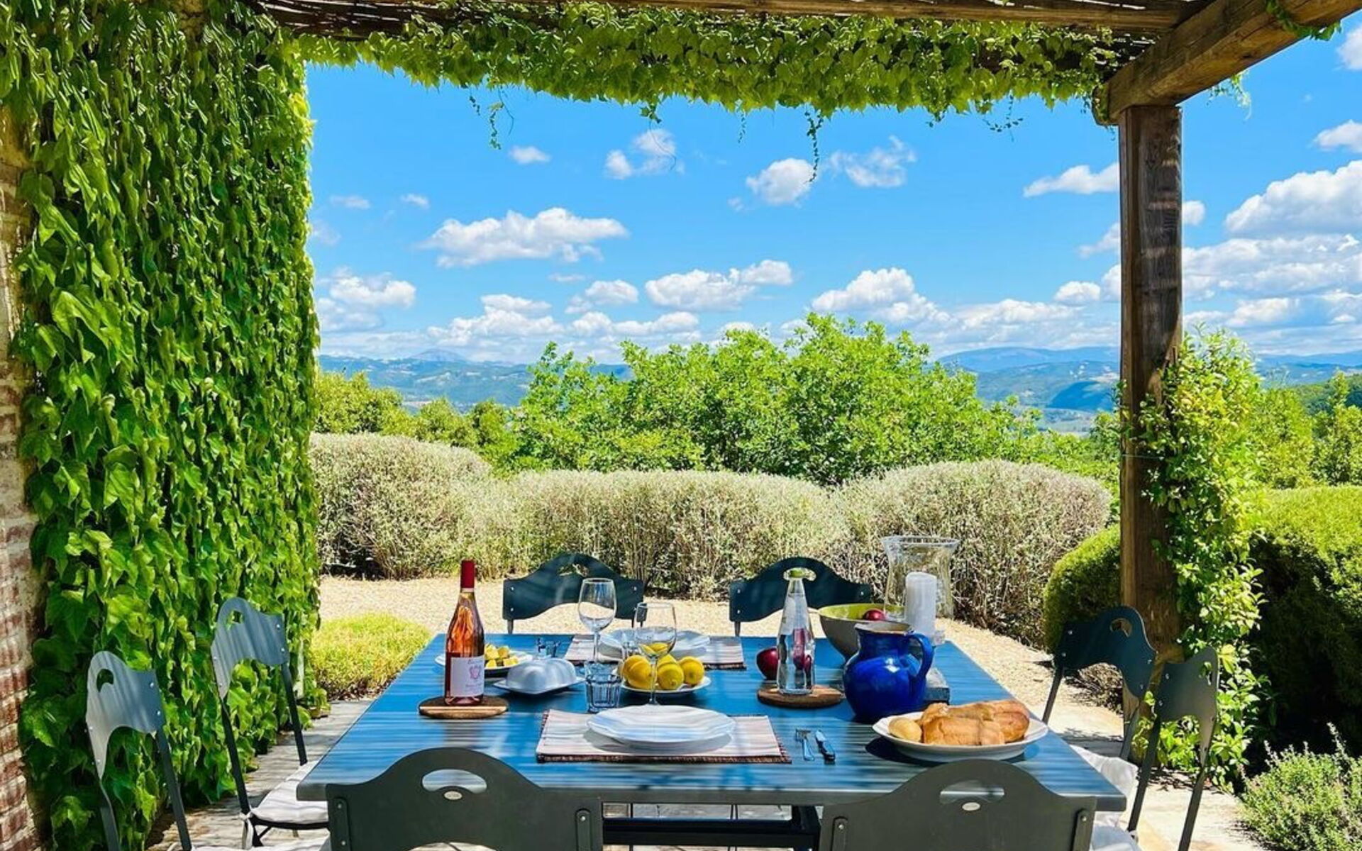 Am Tisch direkt vor der Küche mit Blick auf den Pool können Sie ein köstliches Frühstück genießen. Für ein Abendessen bei Sonnenuntergang unter der romantischen Pergola gibt es einen großen Tisch für 8 Personen.