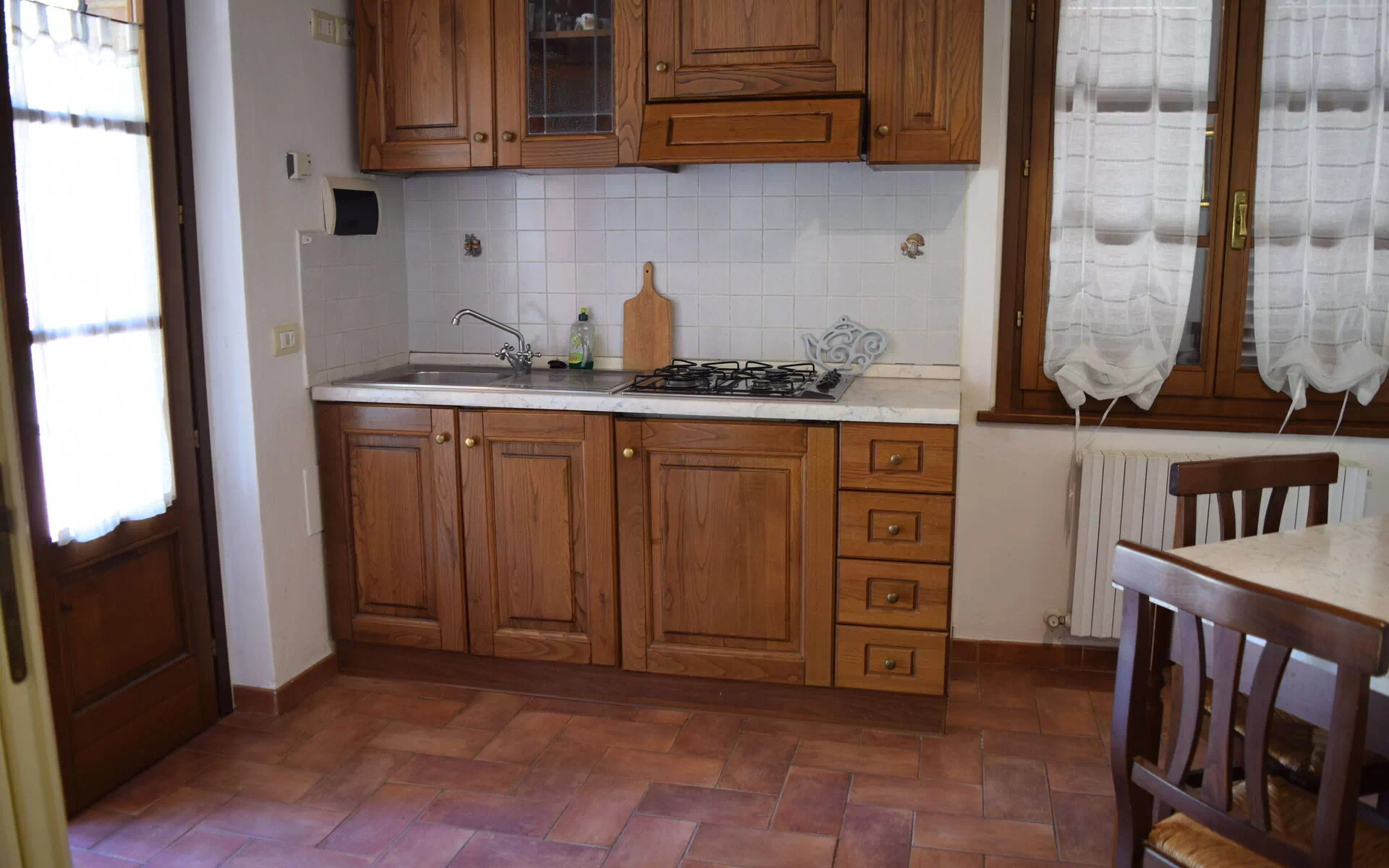 Wohnung mit ausgestatteter Küche mit Doppelschlafcouch im Wohnzimmer, Schlafzimmer mit Doppelbett, Bad und überdachter Veranda