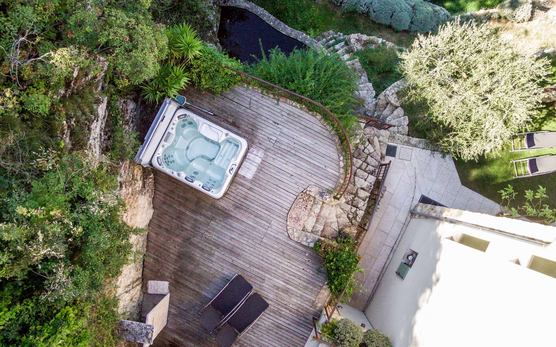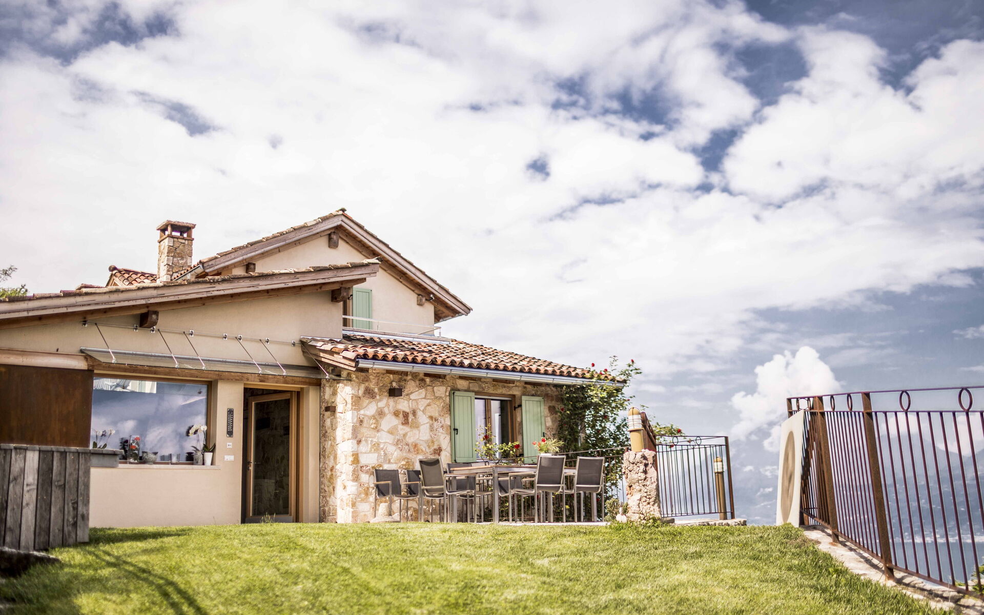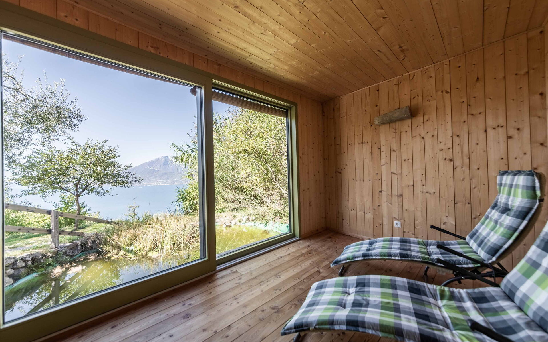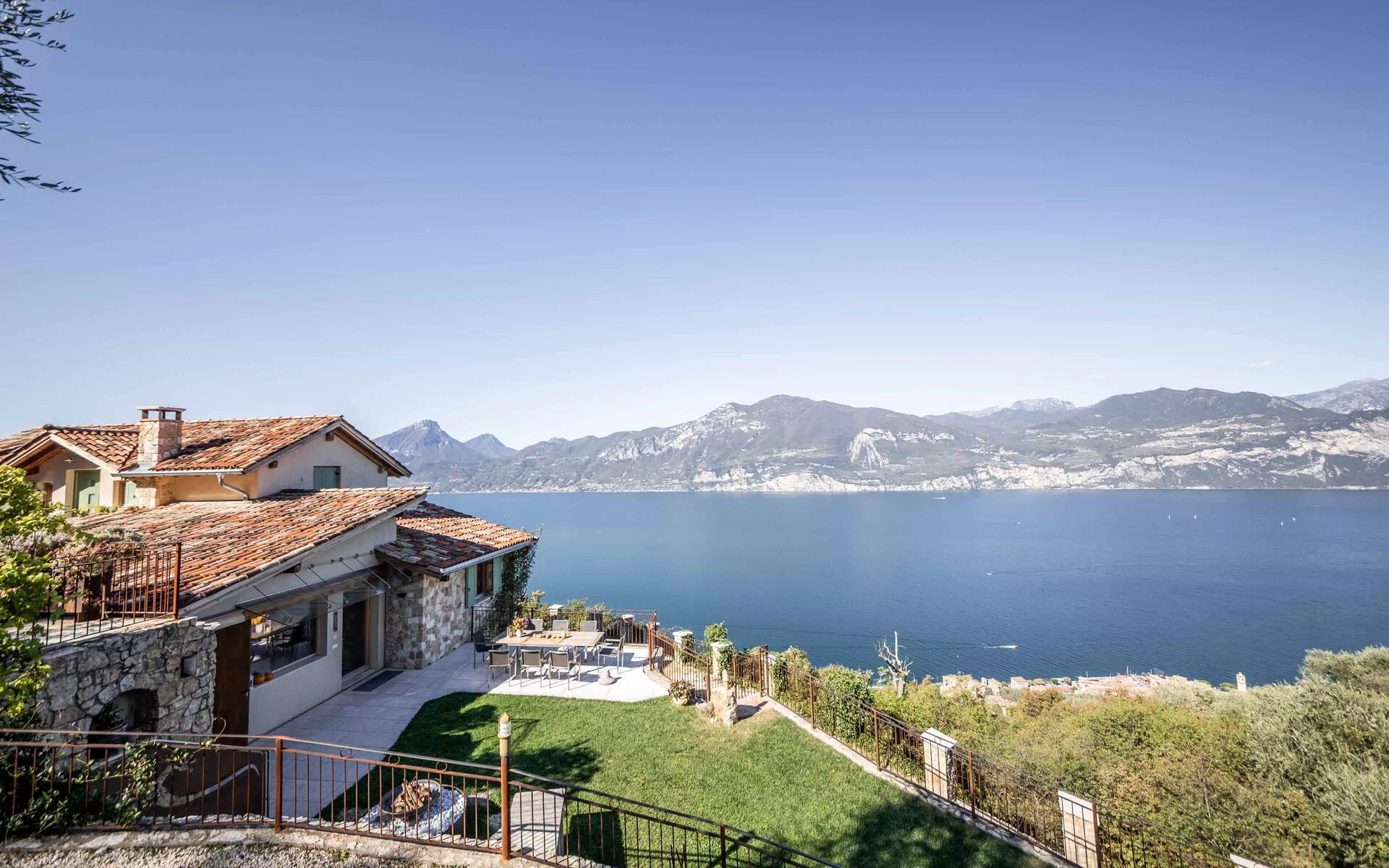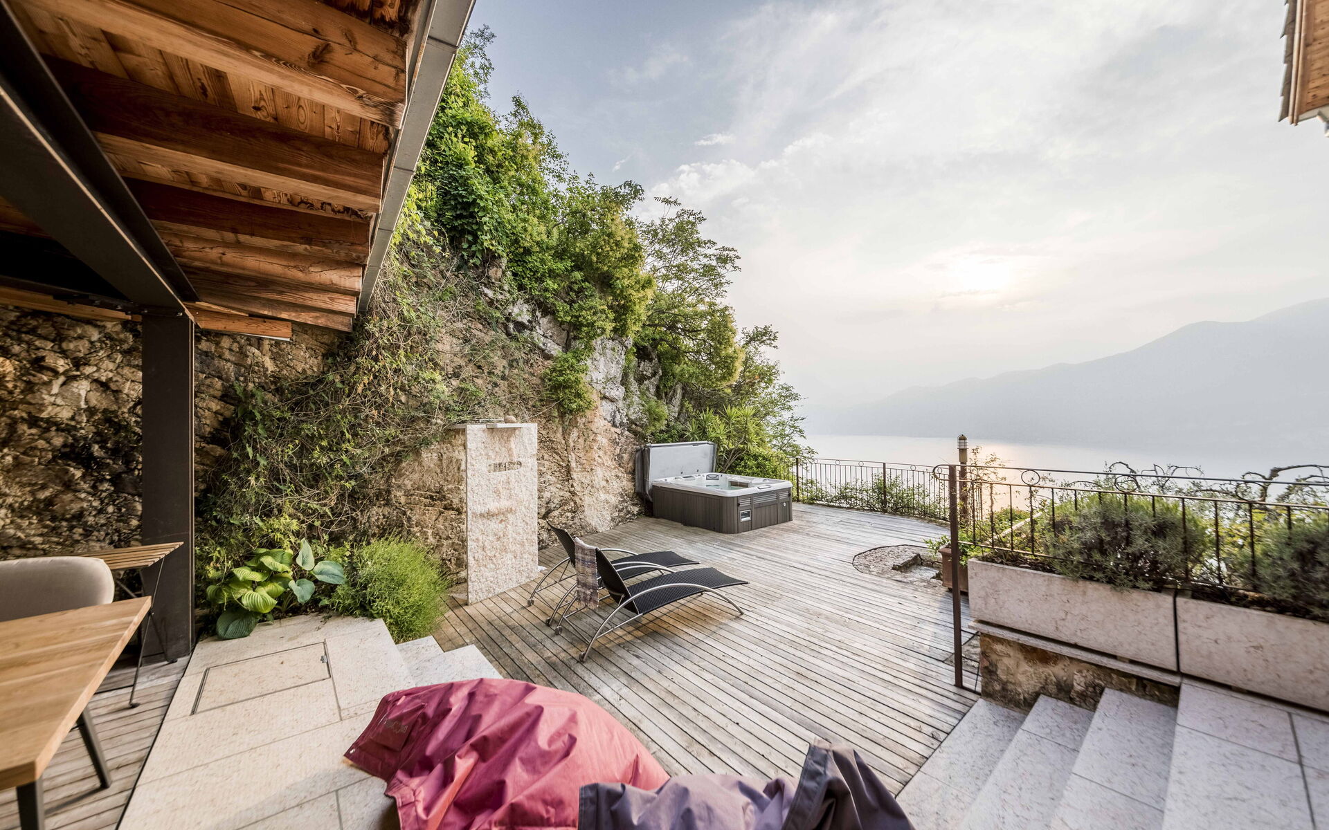 Der große Solariumbereich des Gartens - mit Liegestühlen, Sonnenschirmen und Schaukeln - wird von einem kleinen Schwimmteich bedient, in dem Sie zwischen Seerosen und Wasserpflanzen schwimmen oder im Schatten einer Banane oder anderer tropischer Bäume bleiben können Eine wundervolle Terrasse mit beheiztem Whirlpool, auf der Sie auch an kühleren Tagen und Abenden ein wenig entspannen können. Auf einer anderen Terrasse können Sie jedoch auf einem großen Holztisch mit Stühlen in einer einzigartigen Umgebung direkt über dem Wasser des Gardasees zu Mittag und zu Abend essen. So können Sie den Nervenkitzel genießen, wirklich zwischen Himmel und Erde zu schweben. Eine Ecke des Paradieses, in der Sie auch einen Grillplatz finden, den Sie besonders bei Einbruch der Dunkelheit für einen Aperitif oder einen Gruppengrill genießen können.