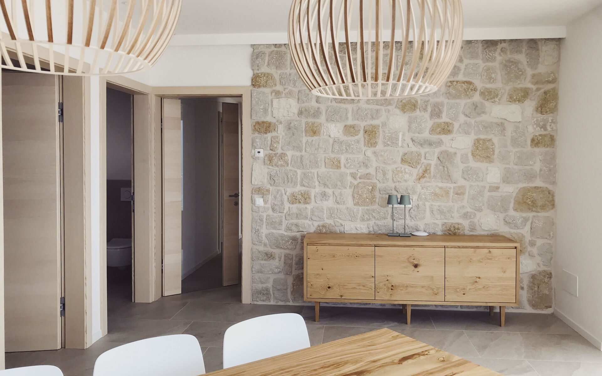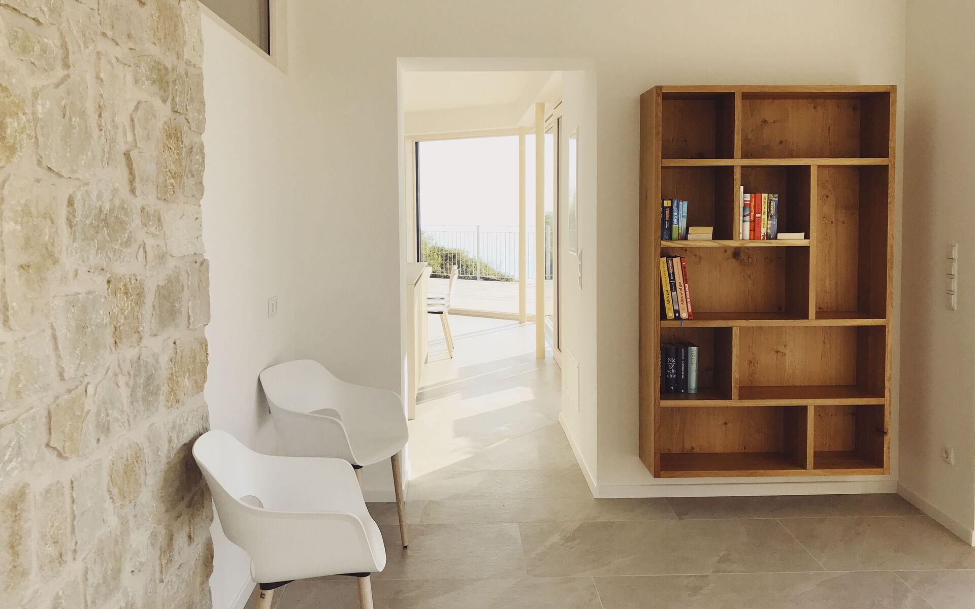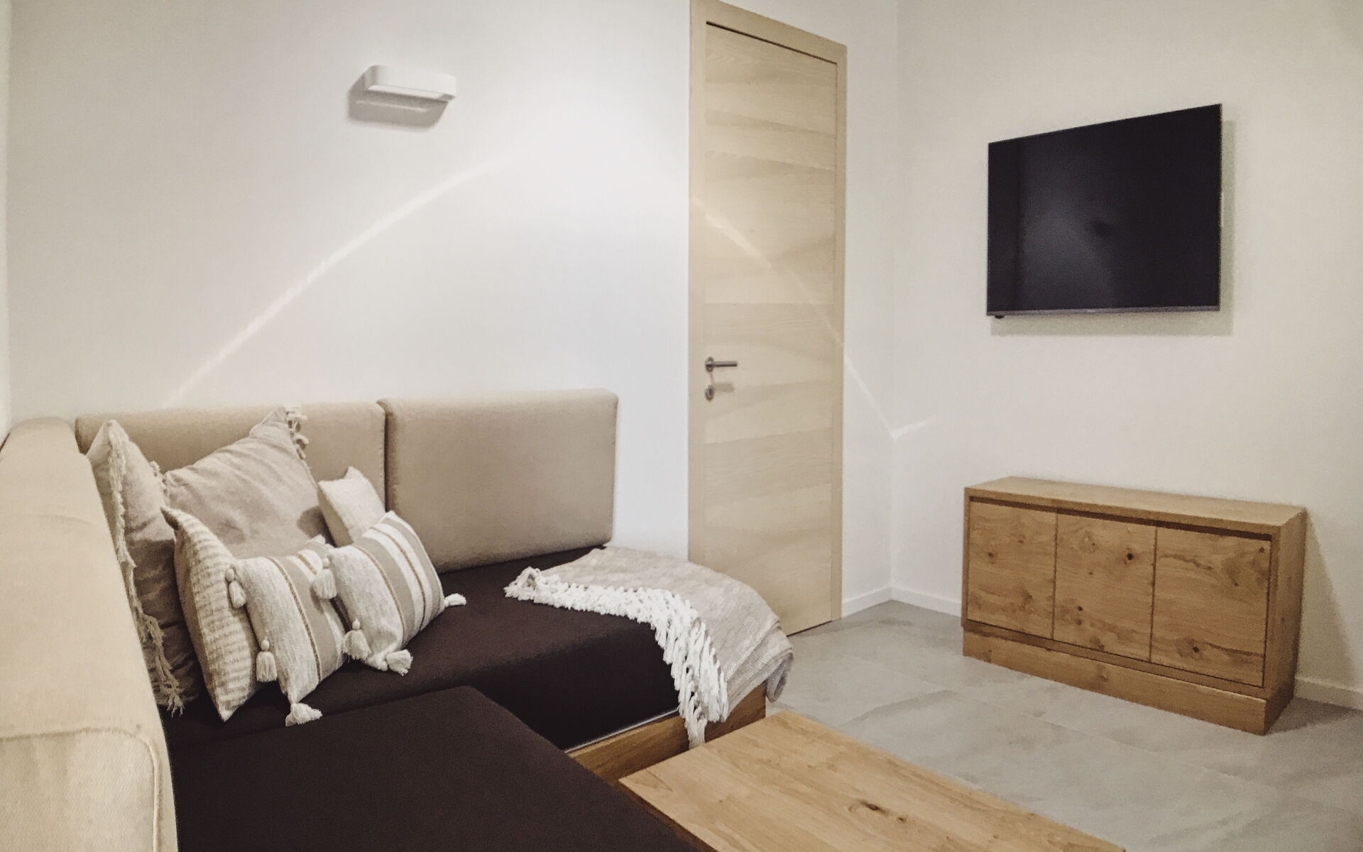 Die Lage ist modern und die Einrichtung ist sehr minimal, aber beeindruckend. Die Zimmer sind in der Tat von Holzmöbeln und neutralen Farben dominieren zusammengesetzt. Das große Wohnzimmer mit Sofa hat Zugang zur Terrasse und ermöglicht es Ihnen, das herrliche Panorama zu genießen.