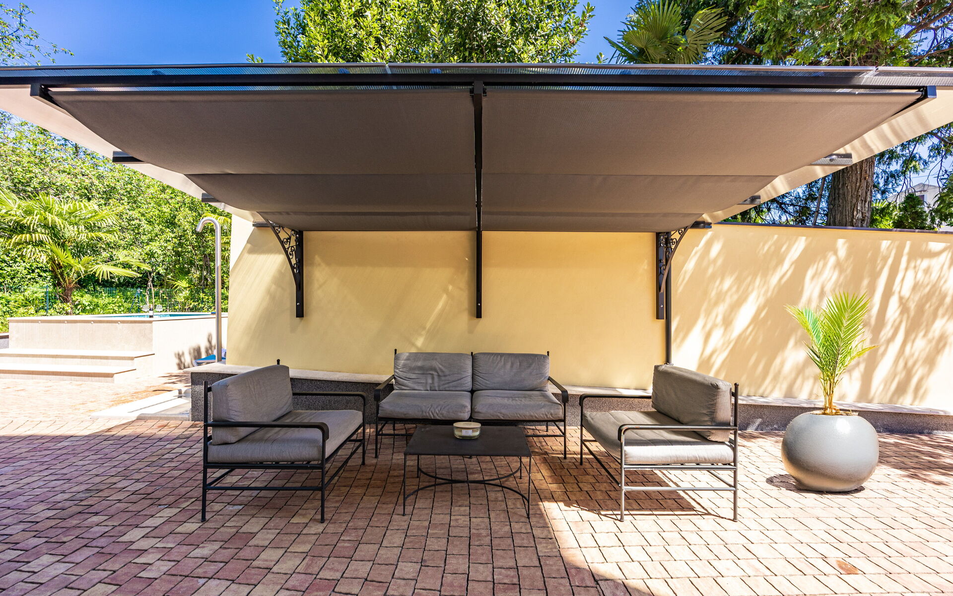 Im Außenbereich bietet die Villa Momente purer Entspannung: einen beheizten Whirlpool, einen privaten Pool, eine von Grün umgebene Lounge-Zone, einen Gasgrill sowie eine wunderschöne Panorama-Dachterrasse – ideal für Aperitifs bei Sonnenuntergang oder intime Abendessen unter dem Sternenhimmel. Das Anwesen ist vollständig eingezäunt und bietet 3–4 private Parkplätze, wodurch Privatsphäre und Sicherheit jederzeit gewährleistet sind.