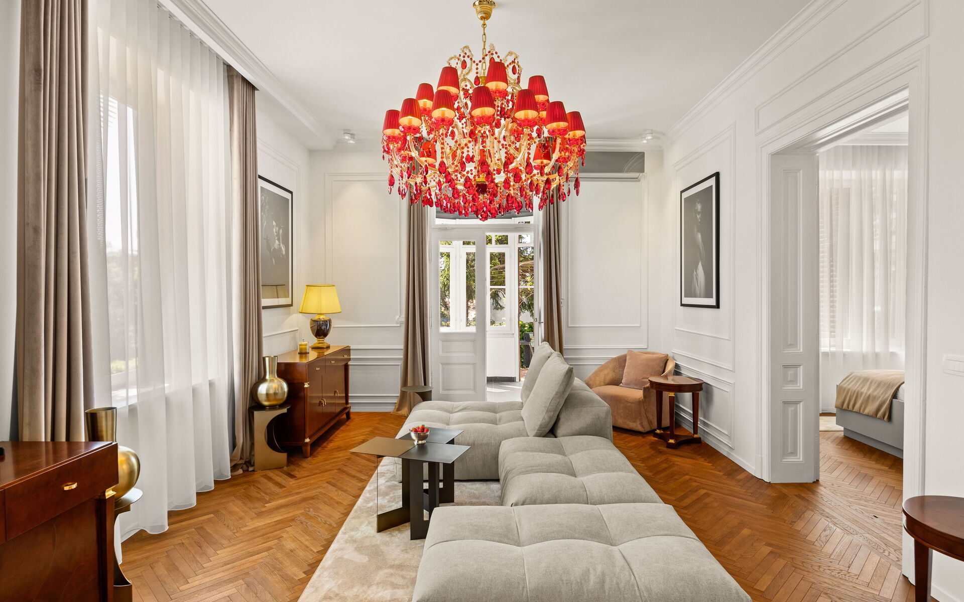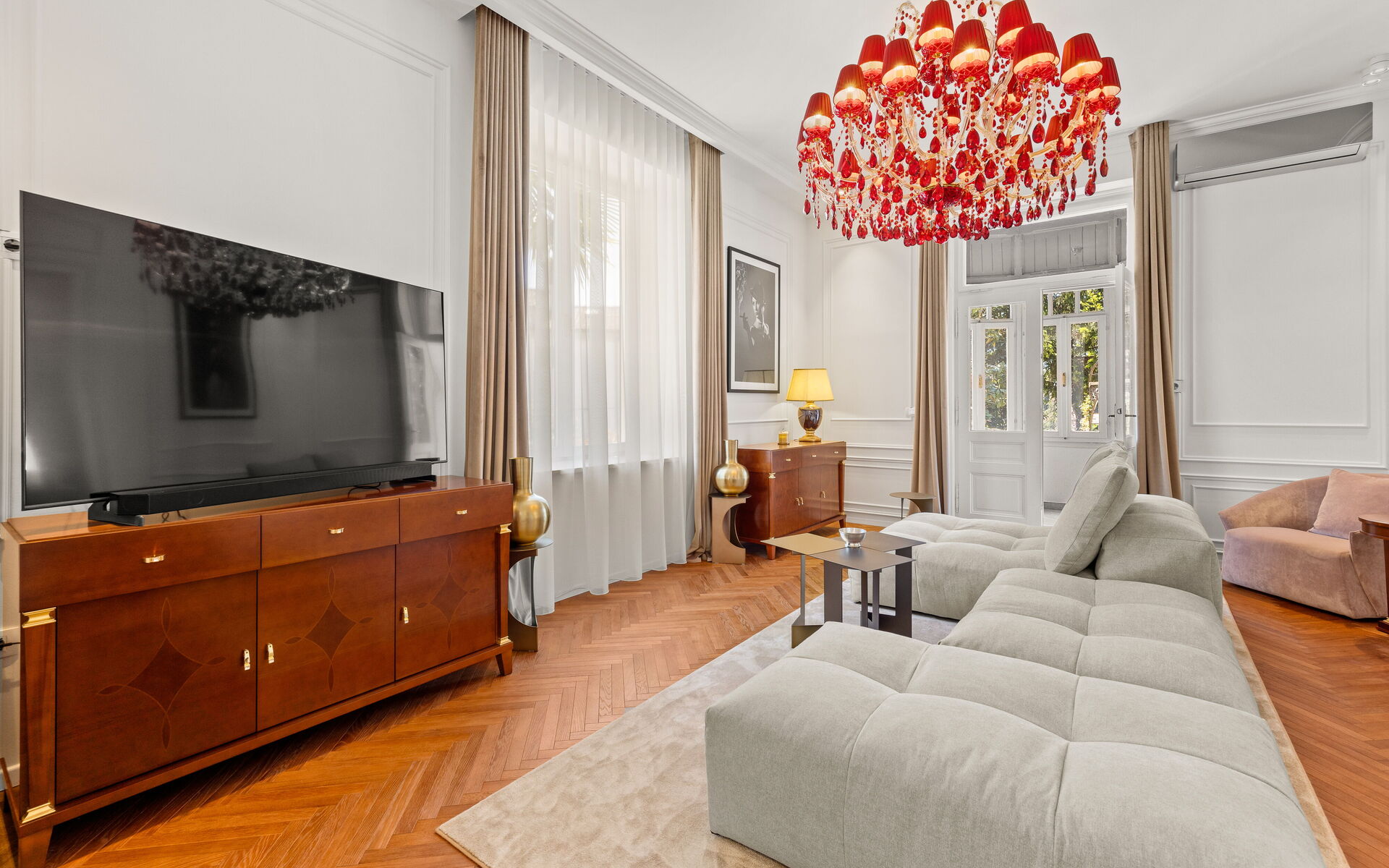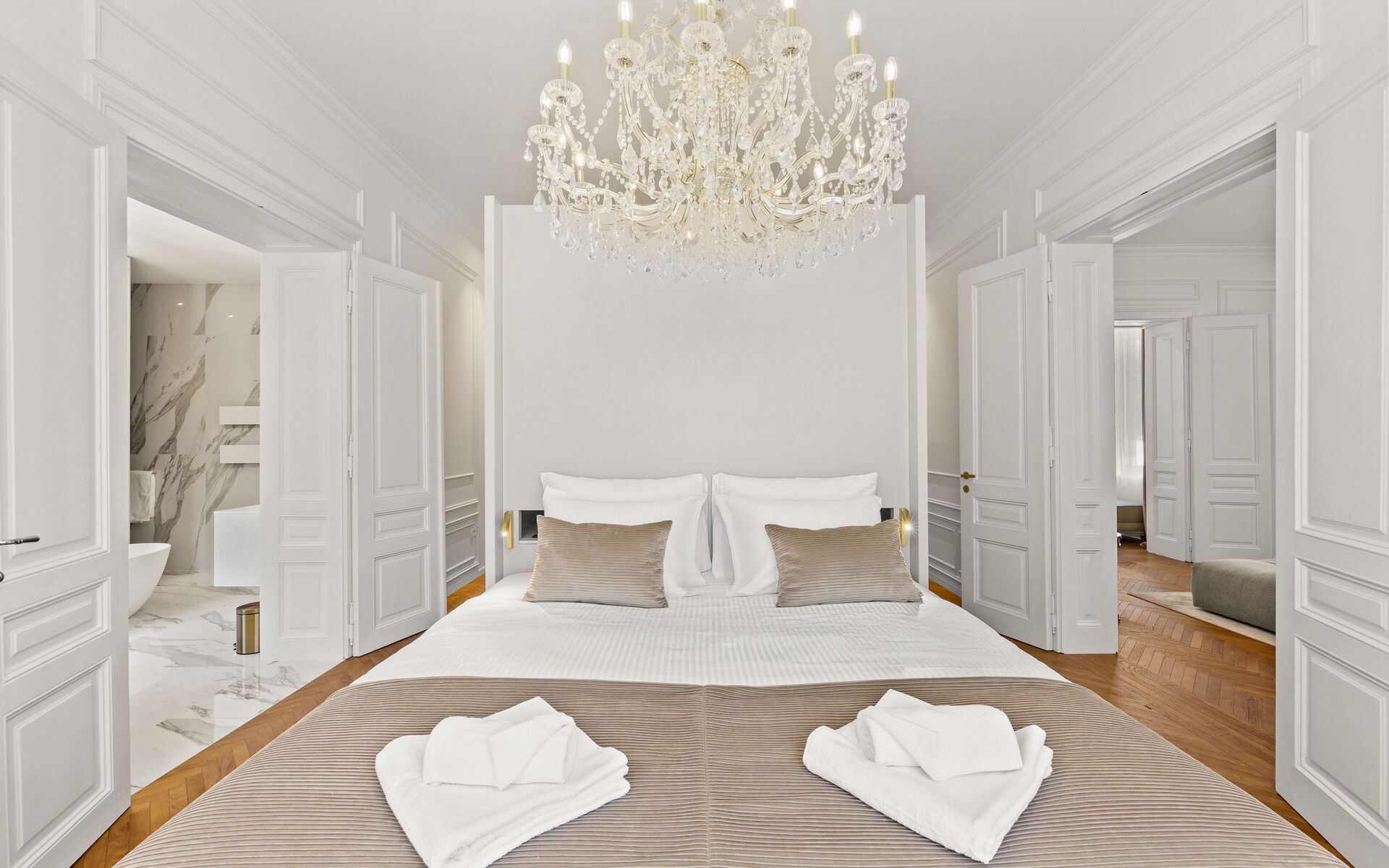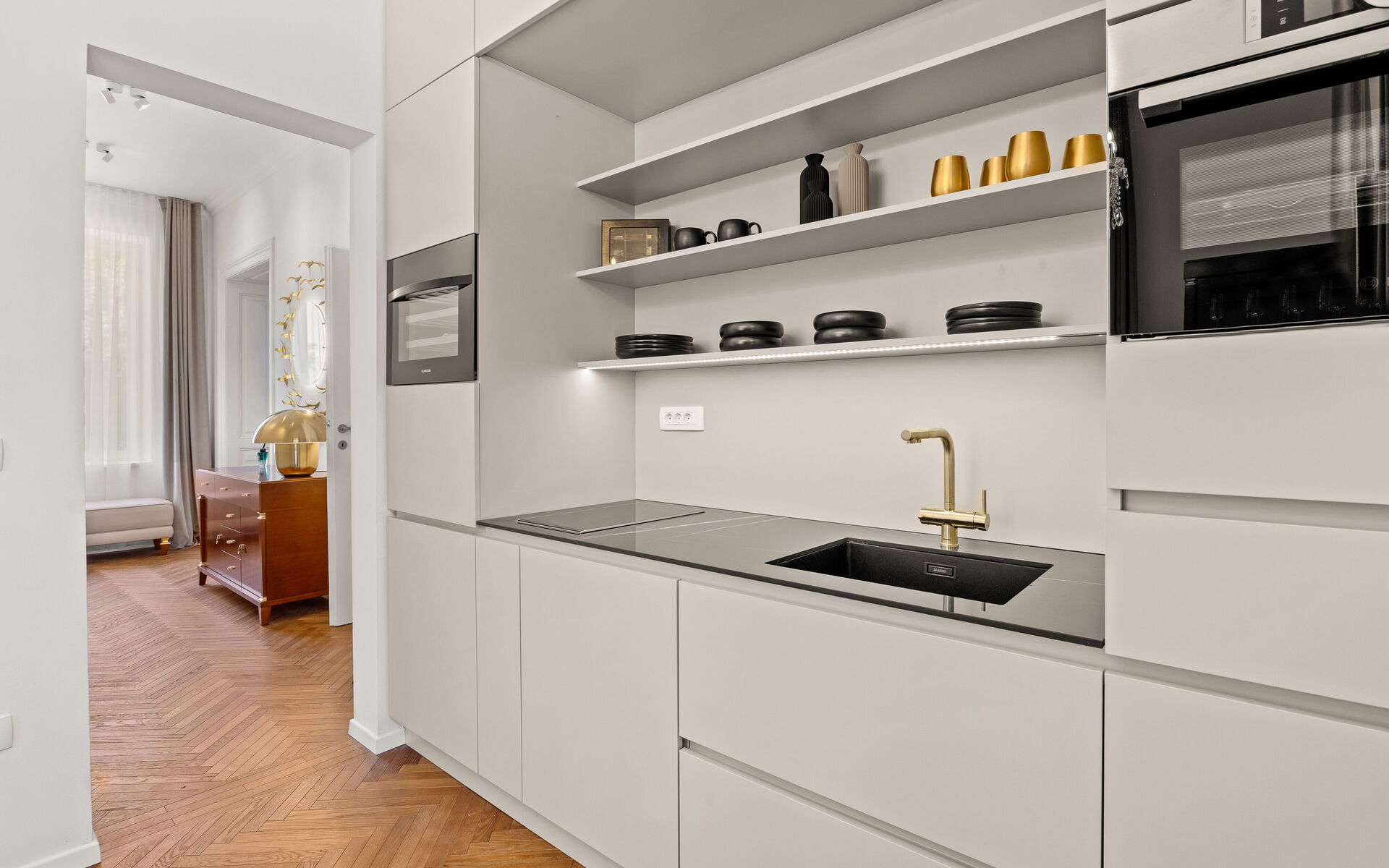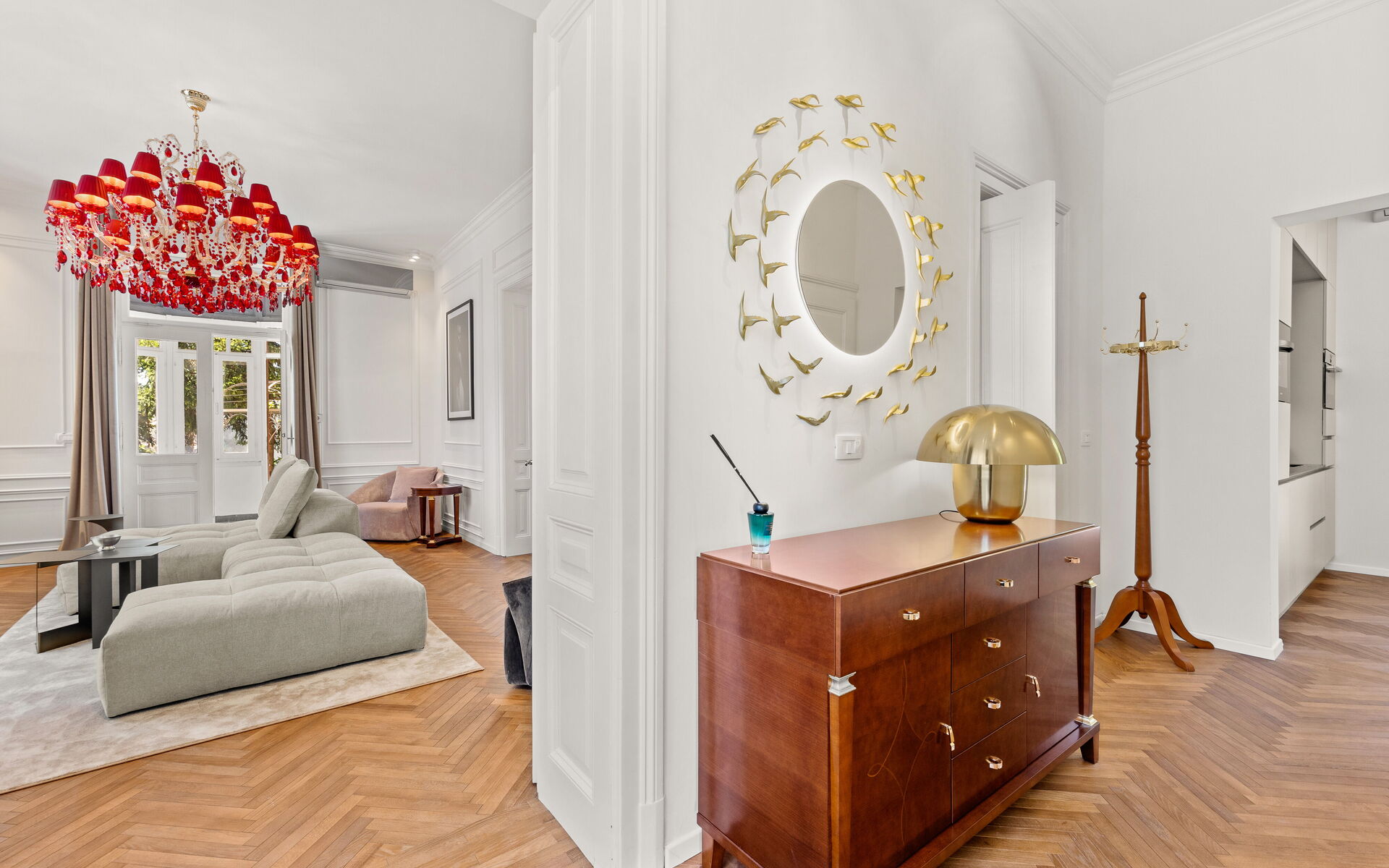 Helle Veranda. Wohnzimmer im klassischen Stil eingerichtet. Die maßgefertigte Küche mit klaren Linien und neutraler Farbpalette ist mit modernsten Geräten ausgestattet. Das Doppelzimmer bietet eine Oase der Ruhe und Intimität, während das Highlight der Wohnung das Designerbad ist, verkleidet mit Marmor in Calacatta-Optik, mit goldenen Details, einem großen hinterleuchteten Spiegel, einer freistehenden Badewanne und Bademänteln für die Gäste.