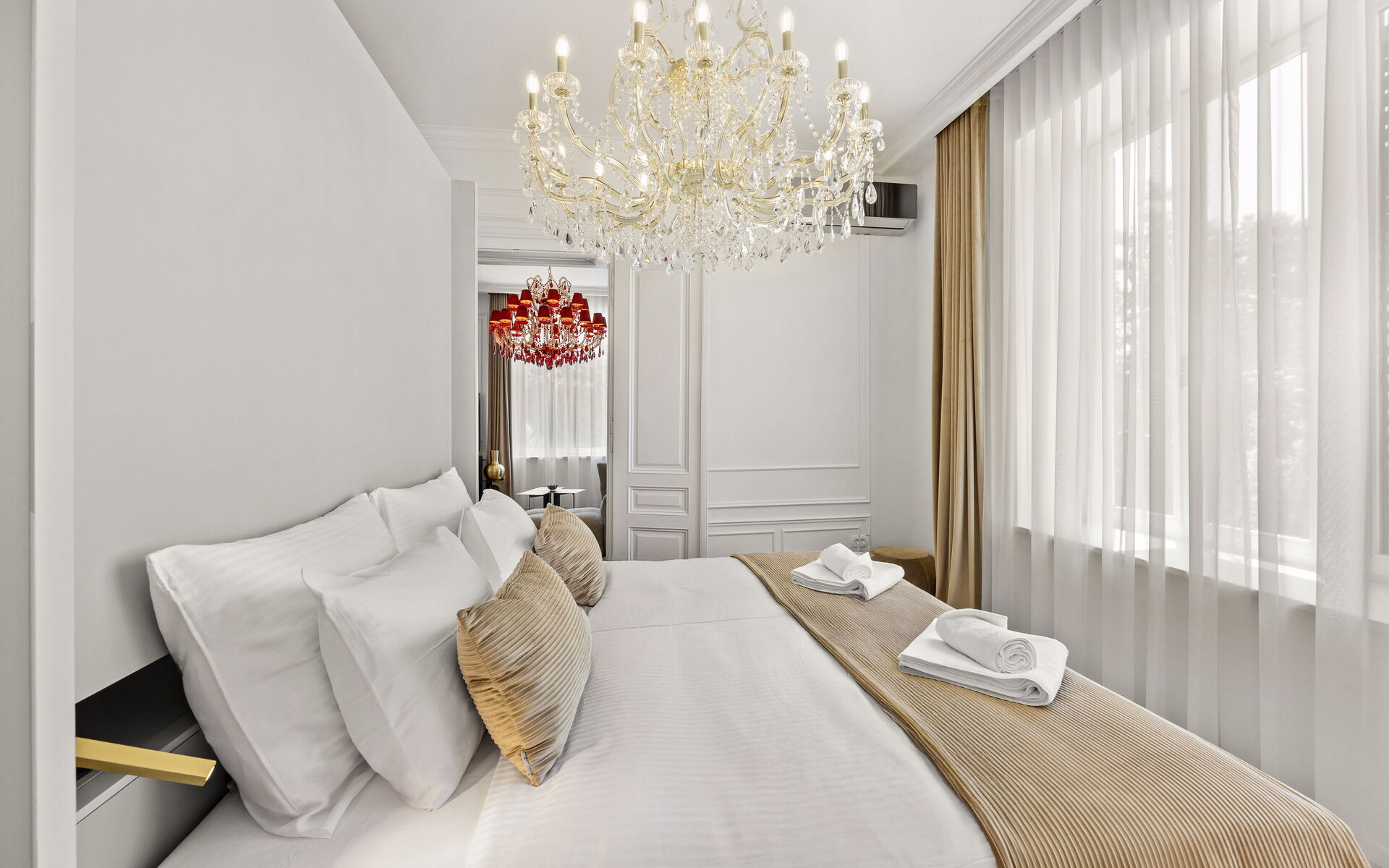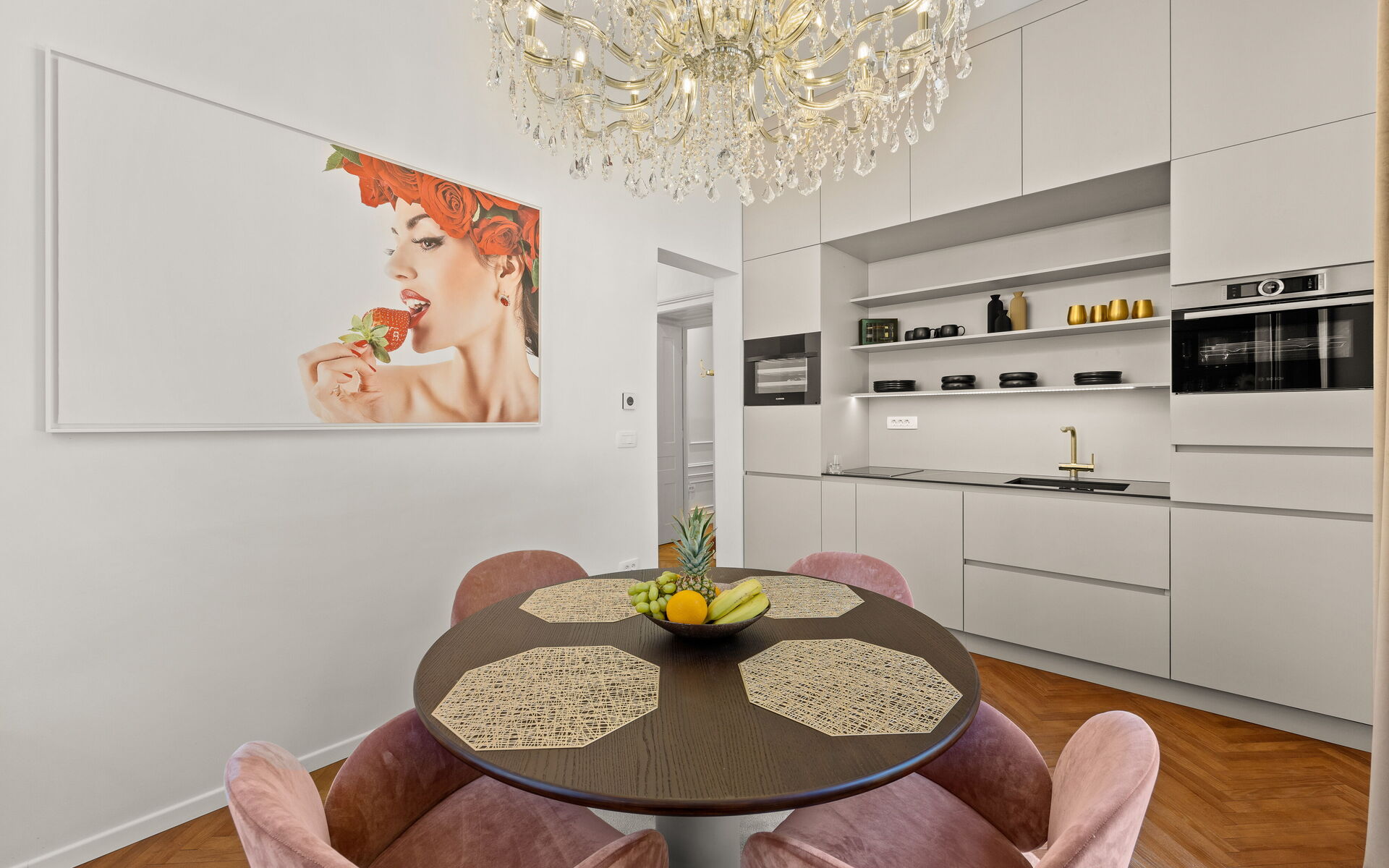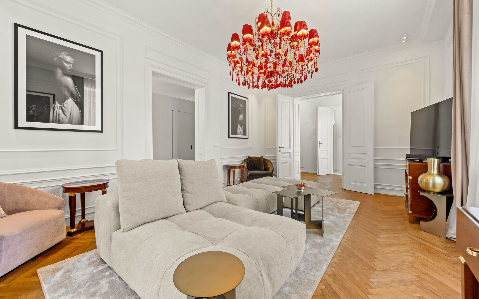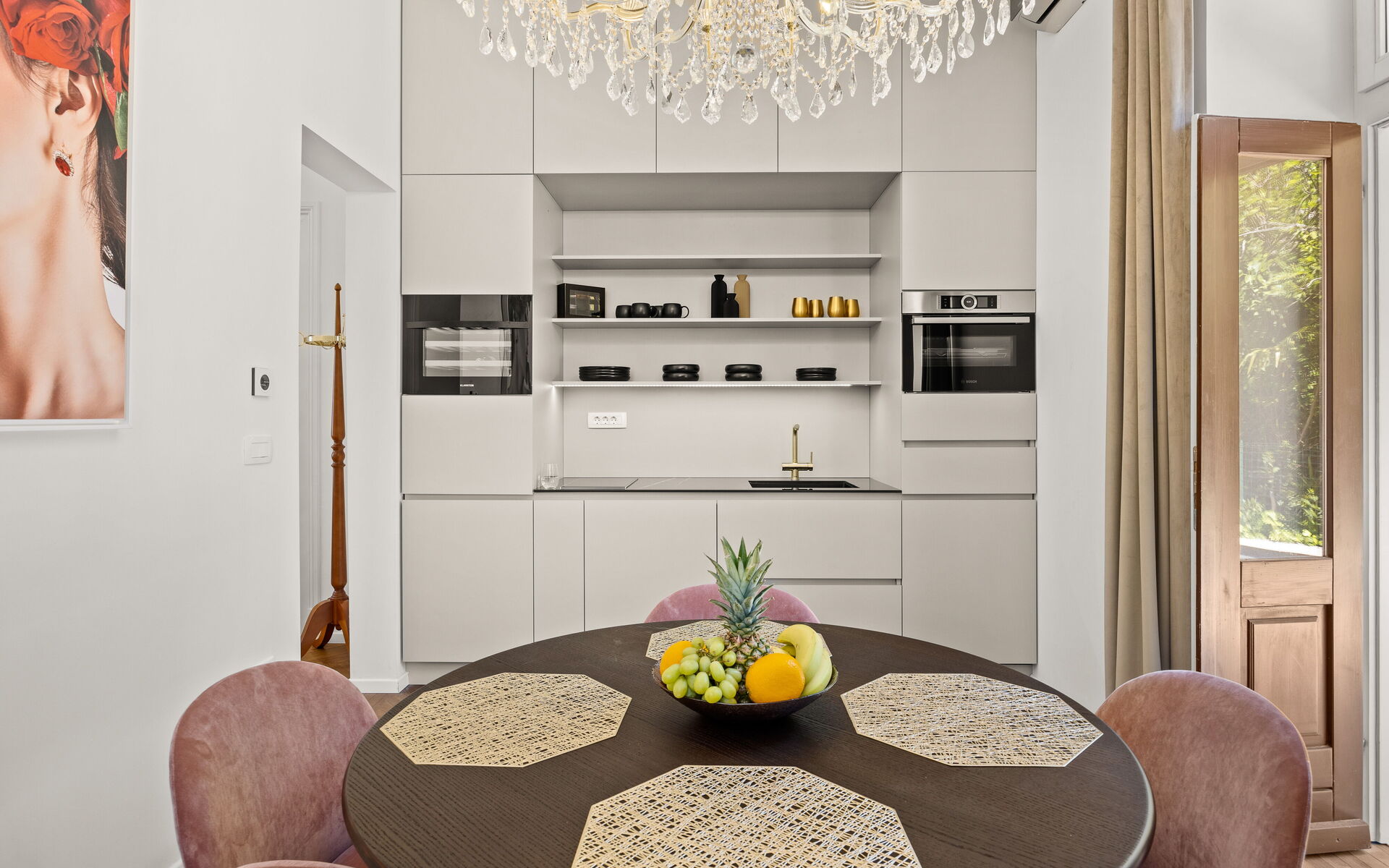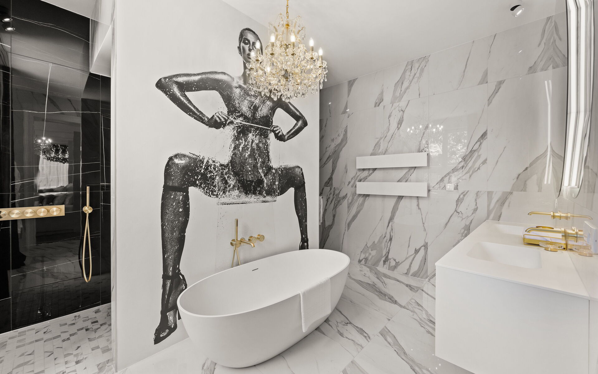 Helle Veranda. Wohnzimmer im klassischen Stil eingerichtet. Die maßgefertigte Küche mit klaren Linien und neutraler Farbpalette ist mit modernsten Geräten ausgestattet. Das Doppelzimmer bietet eine Oase der Ruhe und Intimität, während das Highlight der Wohnung das Designerbad ist, verkleidet mit Marmor in Calacatta-Optik, mit goldenen Details, einem großen hinterleuchteten Spiegel, einer freistehenden Badewanne und Bademänteln für die Gäste.