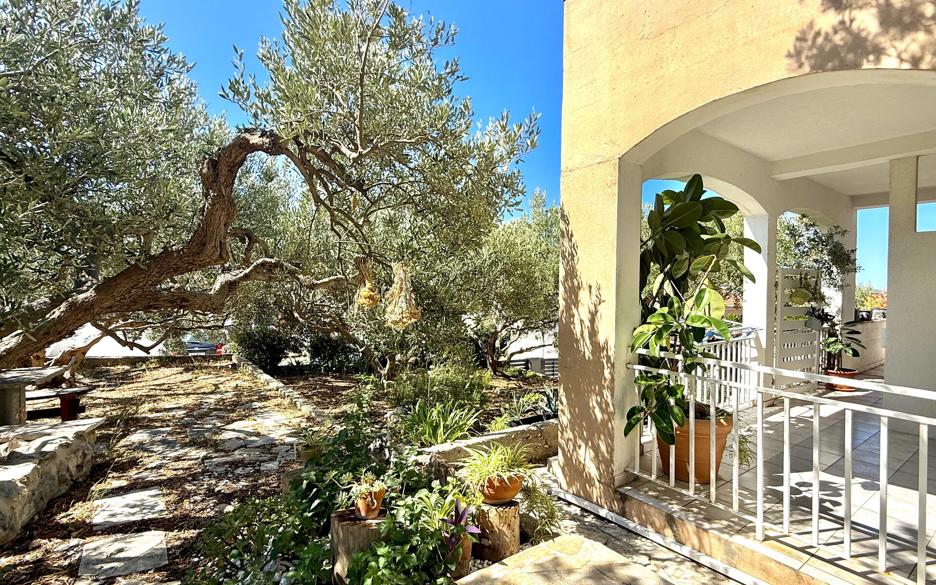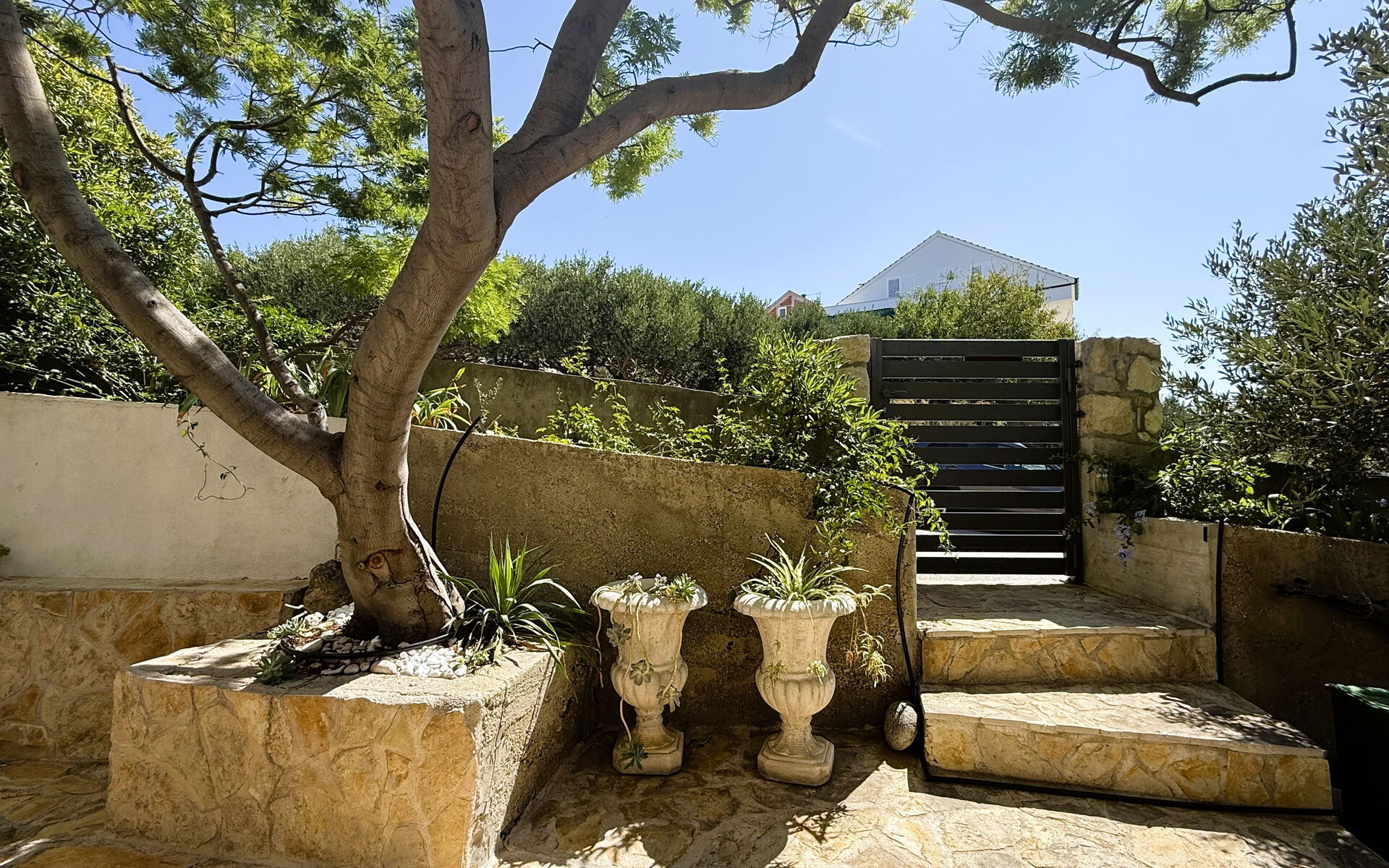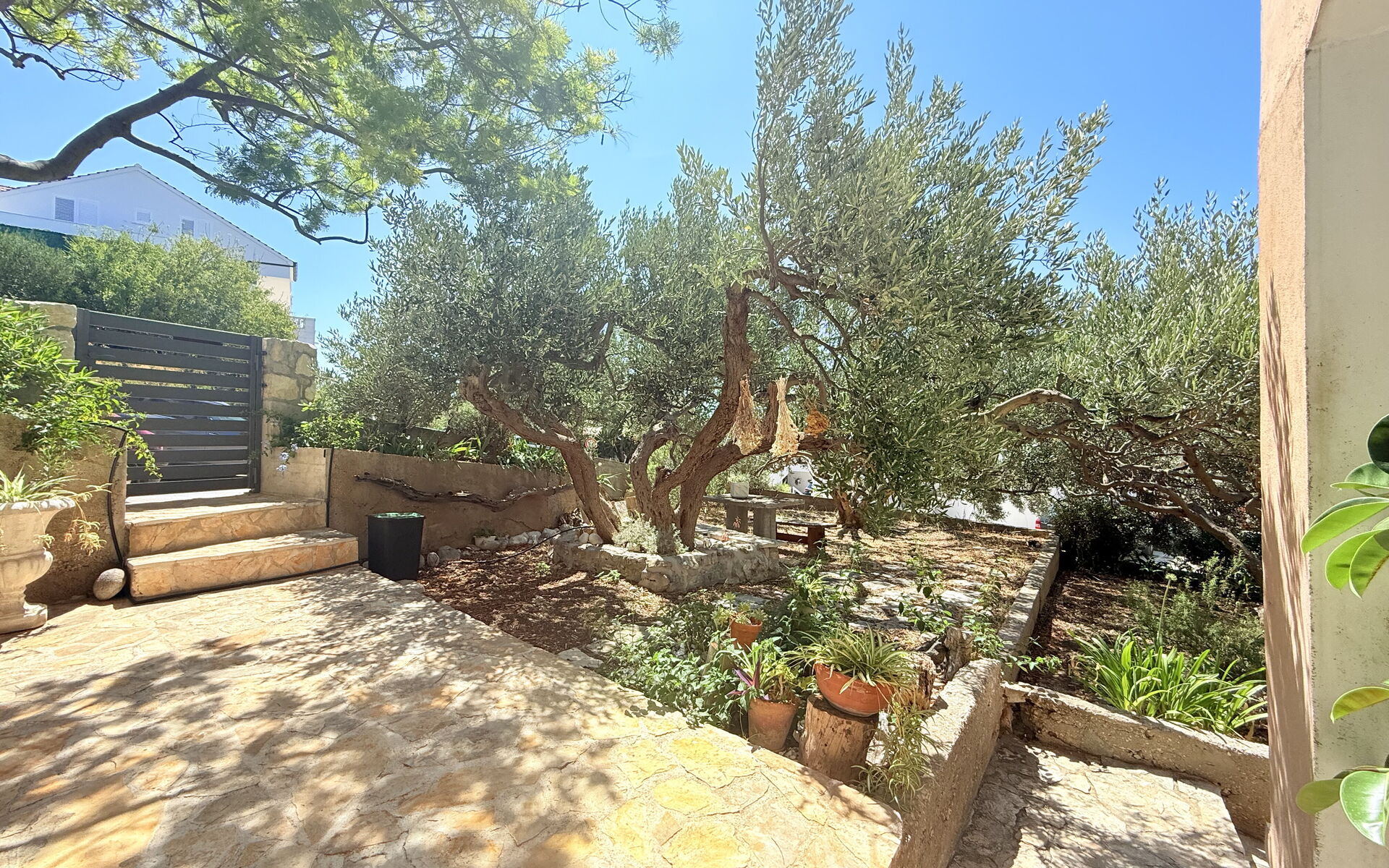 Die Wohnung Olive Garden besteht aus einem Wohnzimmer mit einem Schlafsofa und einem Fernseher mit allen Satellitenprogrammen. Die Küche ist in einem authentischen mediterranen Stil eingerichtet und verfügt über einen Esstisch und eine voll ausgestattete Küche mit Backofen, Kühlschrank, Geschirrspüler und allen anderen notwendigen Utensilien. Es gibt ein Schlafzimmer mit einem Doppelbett und einem eigenen Zugang zum Garten. Handtücher und Bettwäsche stehen den Gästen zur Verfügung.