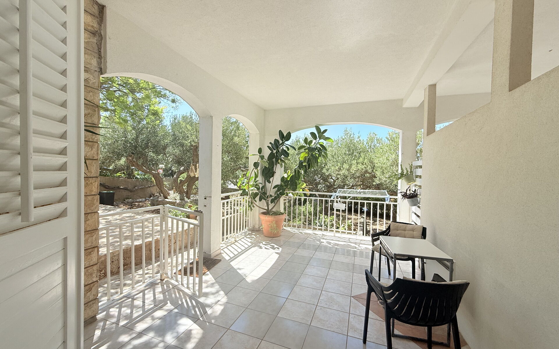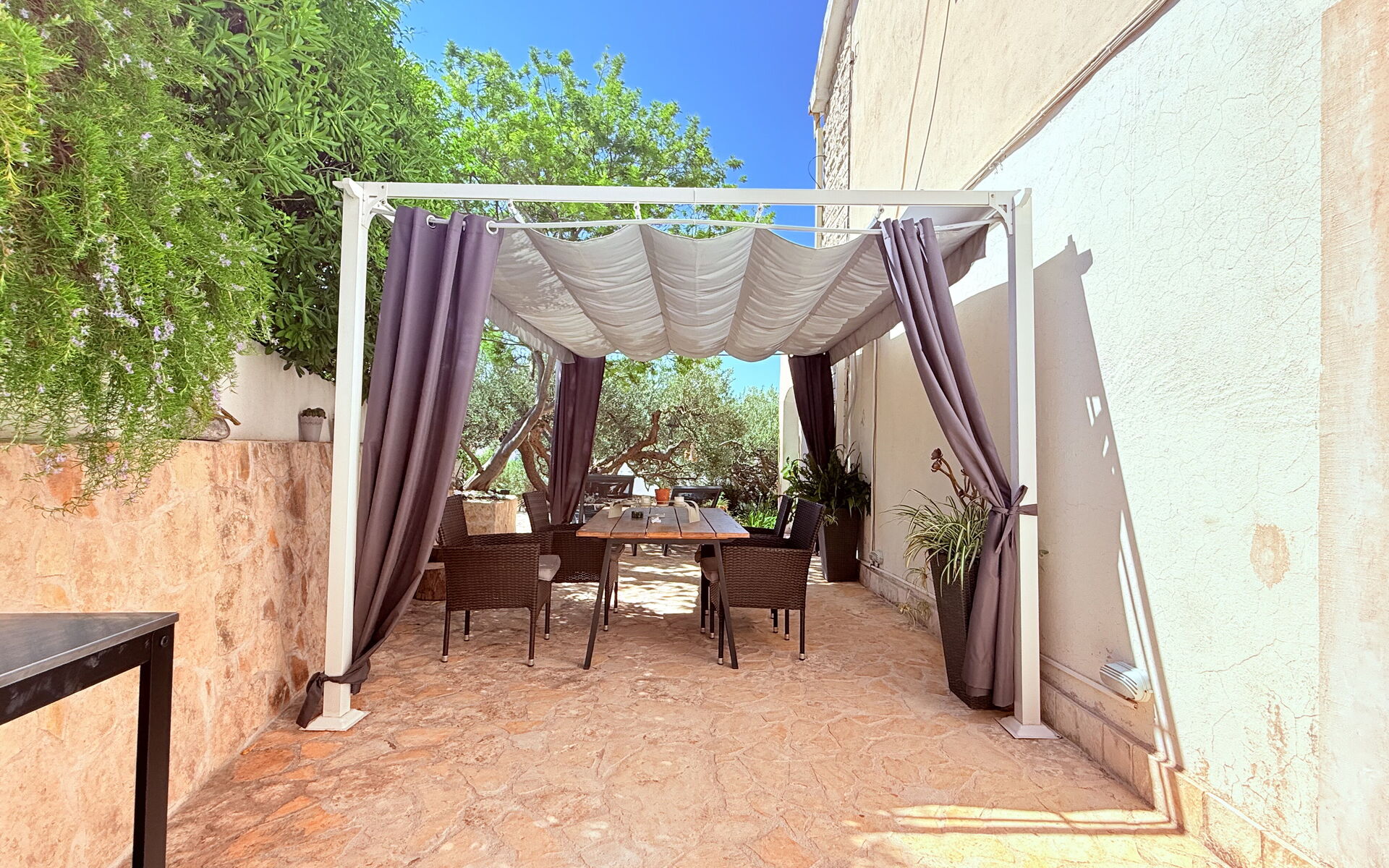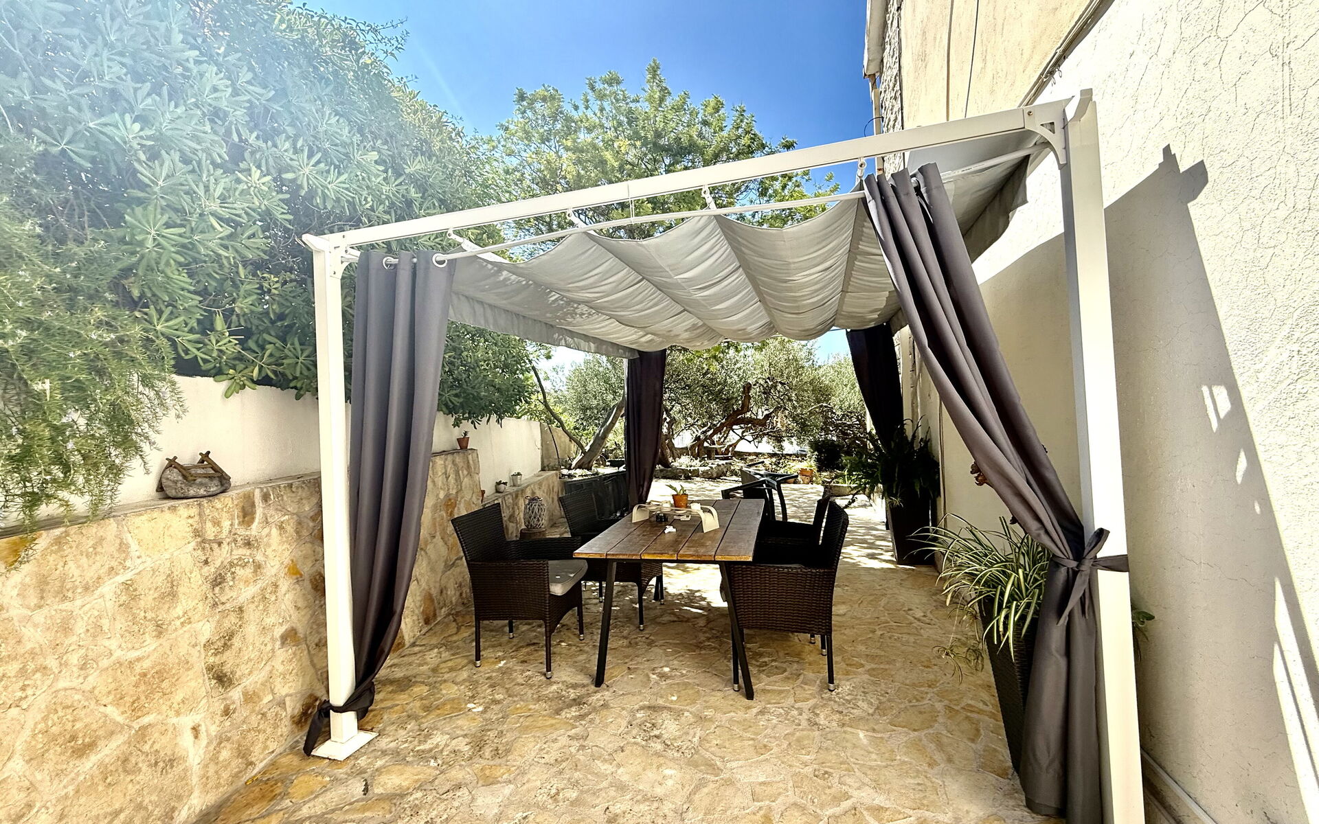 Die Wohnung Olive Garden besteht aus einem Wohnzimmer mit einem Schlafsofa und einem Fernseher mit allen Satellitenprogrammen. Die Küche ist in einem authentischen mediterranen Stil eingerichtet und verfügt über einen Esstisch und eine voll ausgestattete Küche mit Backofen, Kühlschrank, Geschirrspüler und allen anderen notwendigen Utensilien. Es gibt ein Schlafzimmer mit einem Doppelbett und einem eigenen Zugang zum Garten. Handtücher und Bettwäsche stehen den Gästen zur Verfügung.