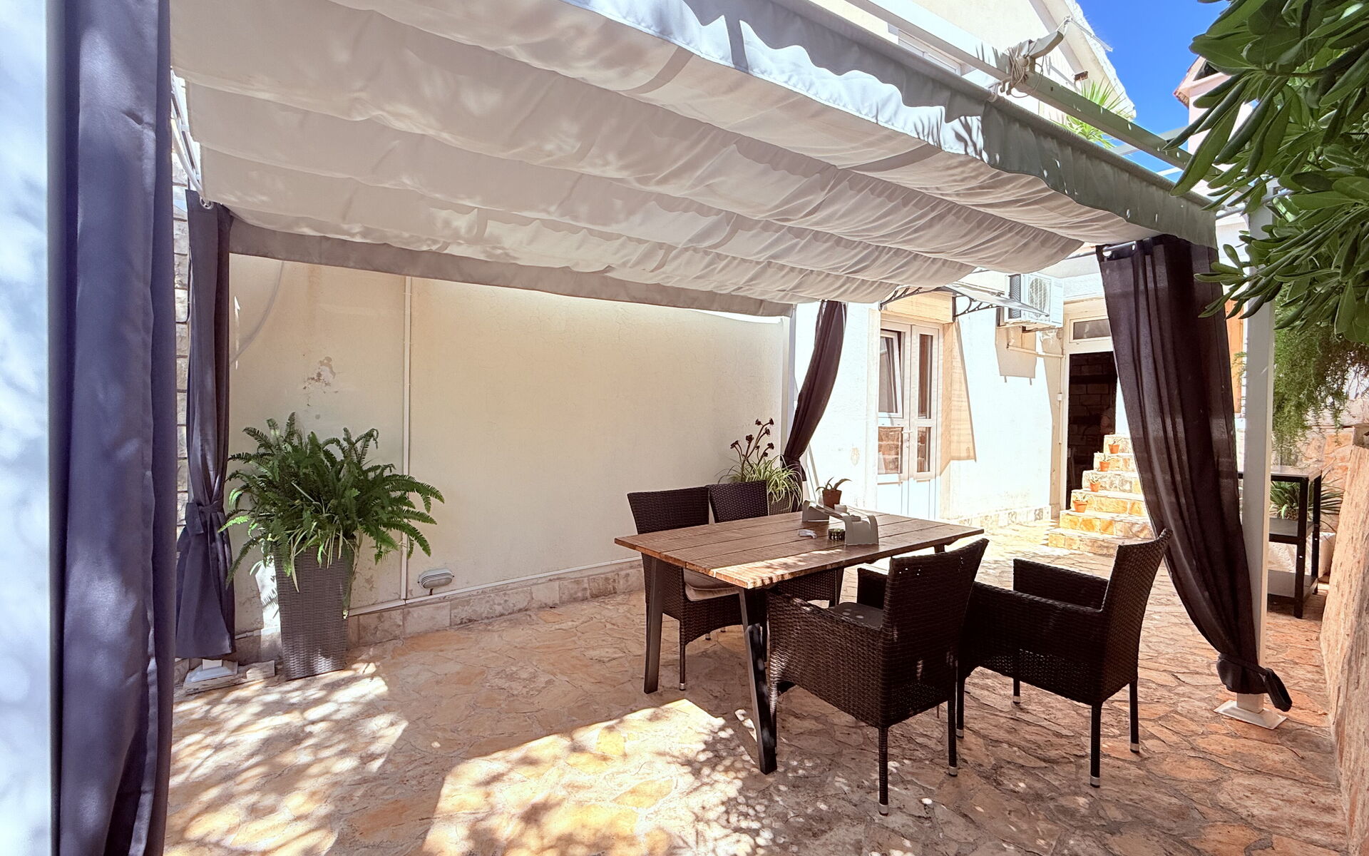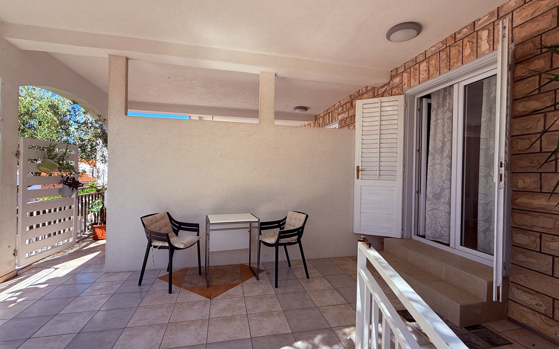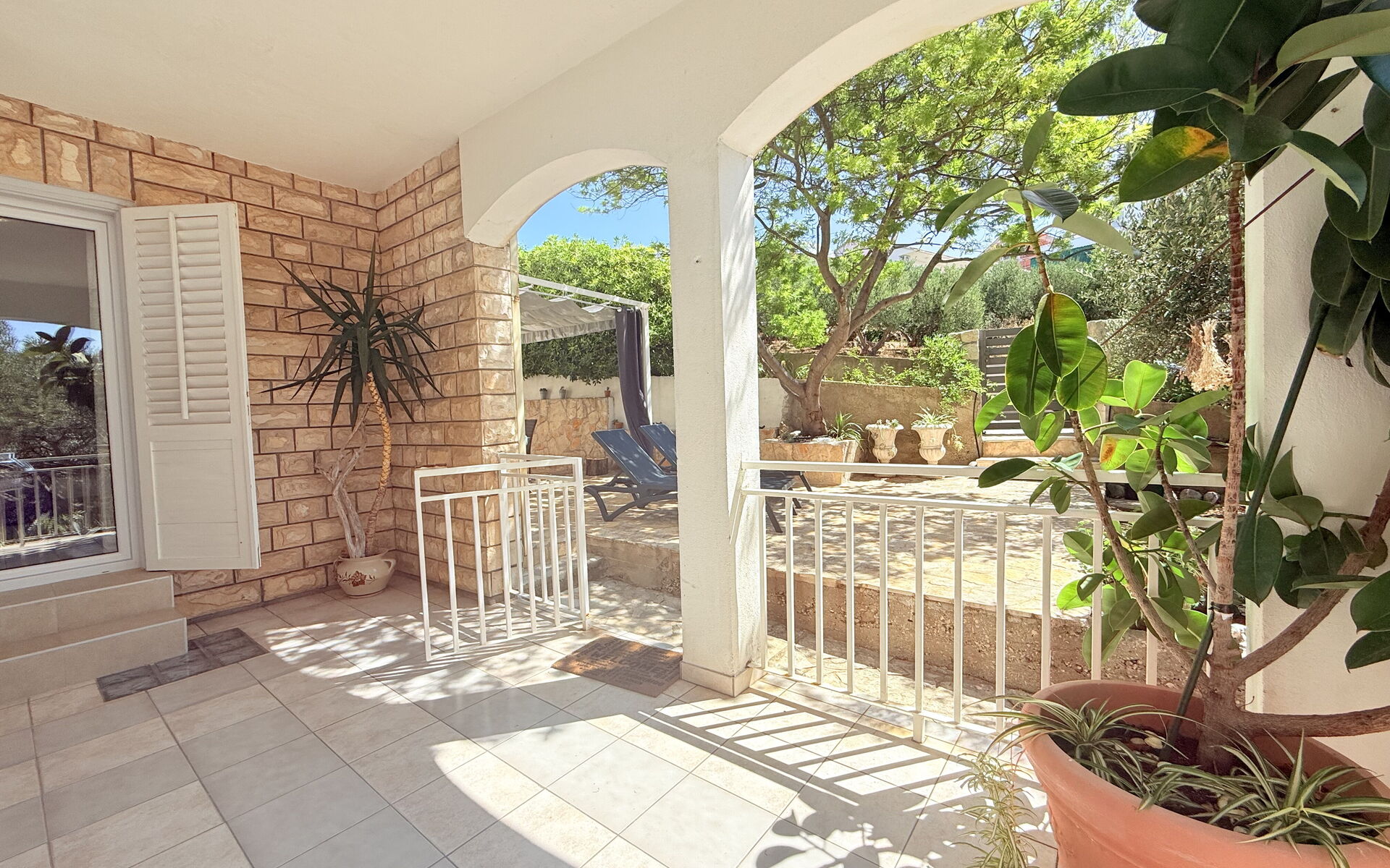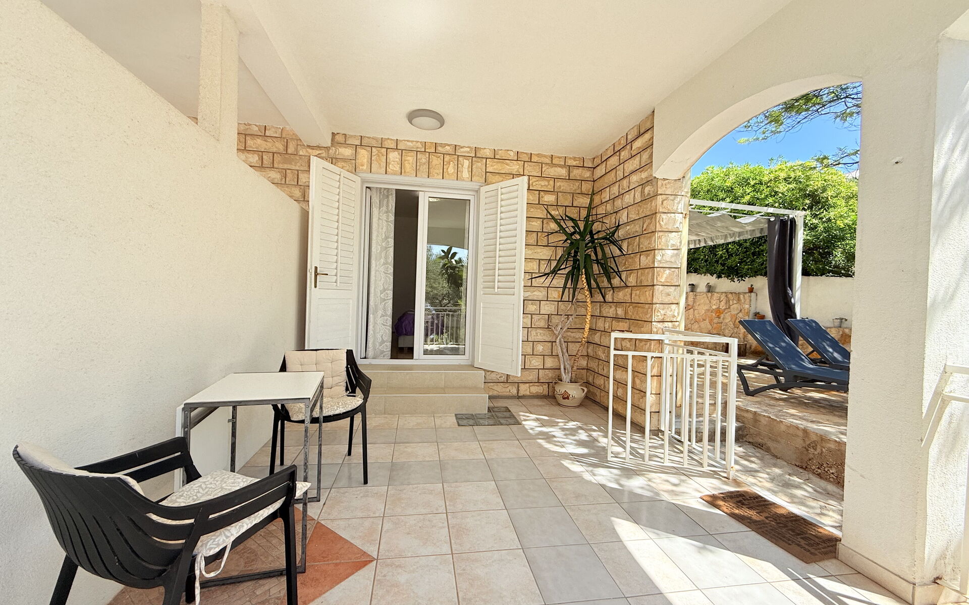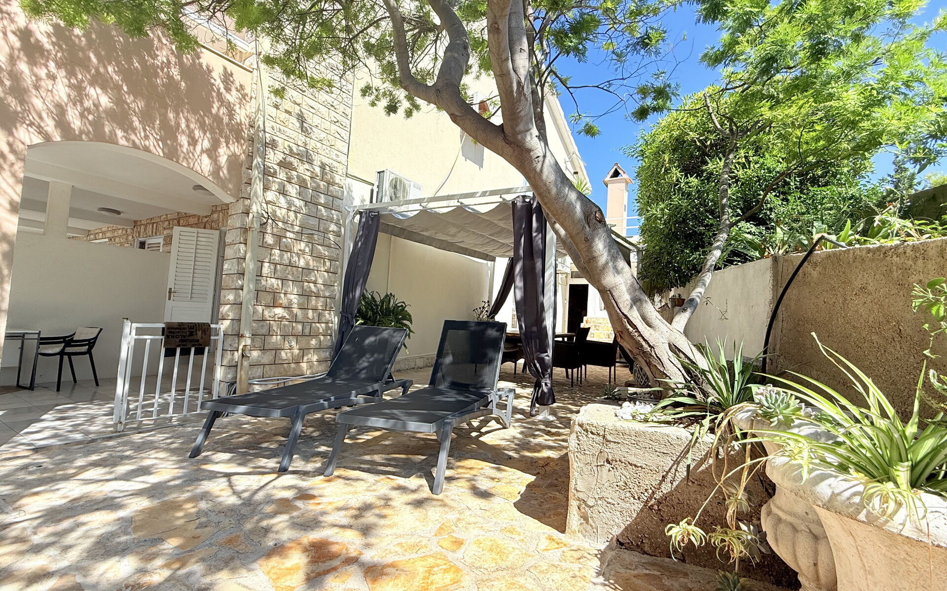 Die Wohnung ist von einem großen Garten und einem eingezäunten Innenhof umgeben, wodurch sie auch für Reisende mit Haustieren geeignet ist. Von der Terrasse aus blickt man auf einen Garten mit inseltypischen Pflanzen, der an heißen, sonnigen Tagen viel Schatten spendet und Privatsphäre und Entspannung garantiert. Der Außenbereich ist mit bequemen Liegestühlen und Gartenmöbeln ausgestattet. Den Gästen steht ein Grill zur Verfügung. In der Nähe gibt es eine Bäckerei, ein Lebensmittelgeschäft und ein Restaurant, um Ihren Urlaub noch angenehmer zu gestalten.