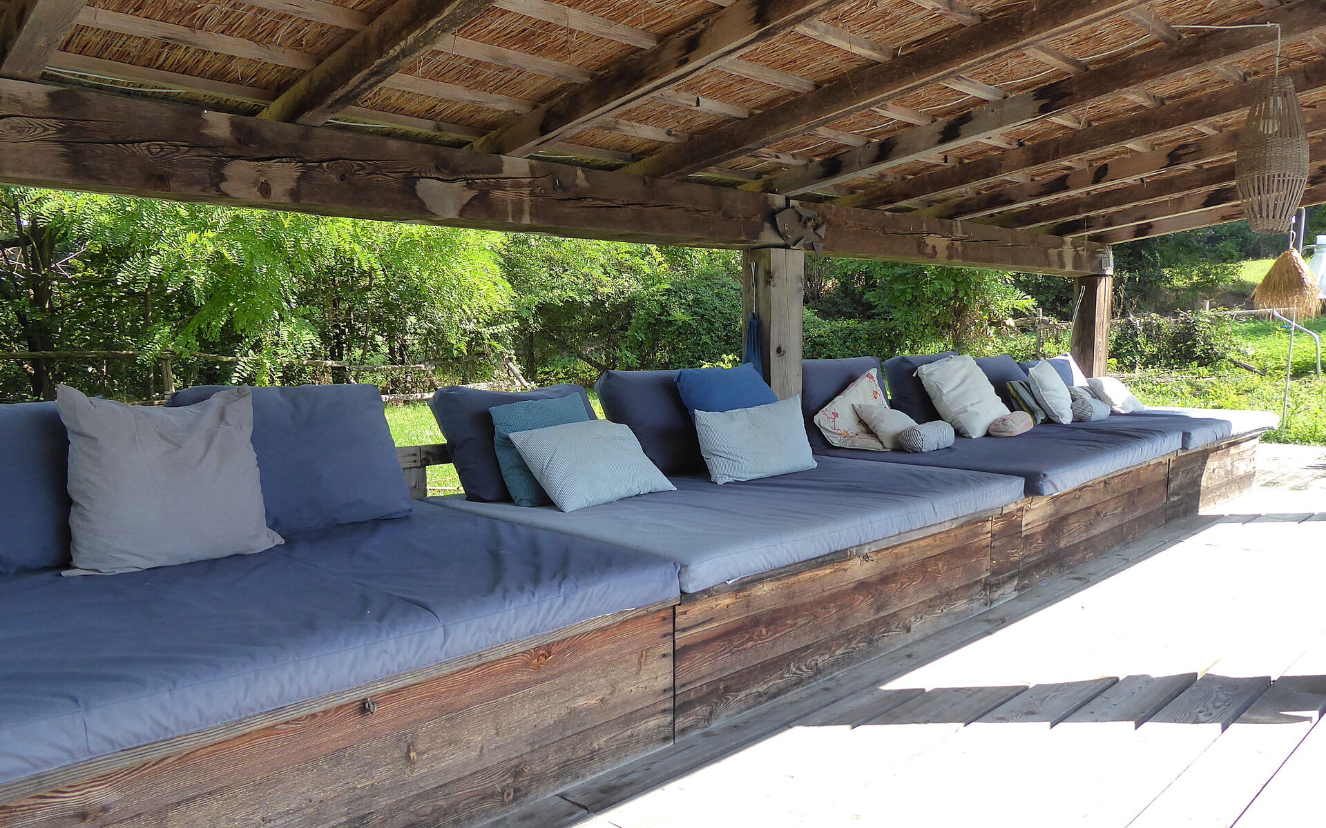 La piscine et le sauna ont été réalisés dans le même style que la maison, afin de se fondre harmonieusement dans l’environnement naturel. Le grand espace couvert à côté de la piscine, agrémenté de canapés et de tables, deviendra votre endroit préféré pour passer de longues journées d’été en toute détente.