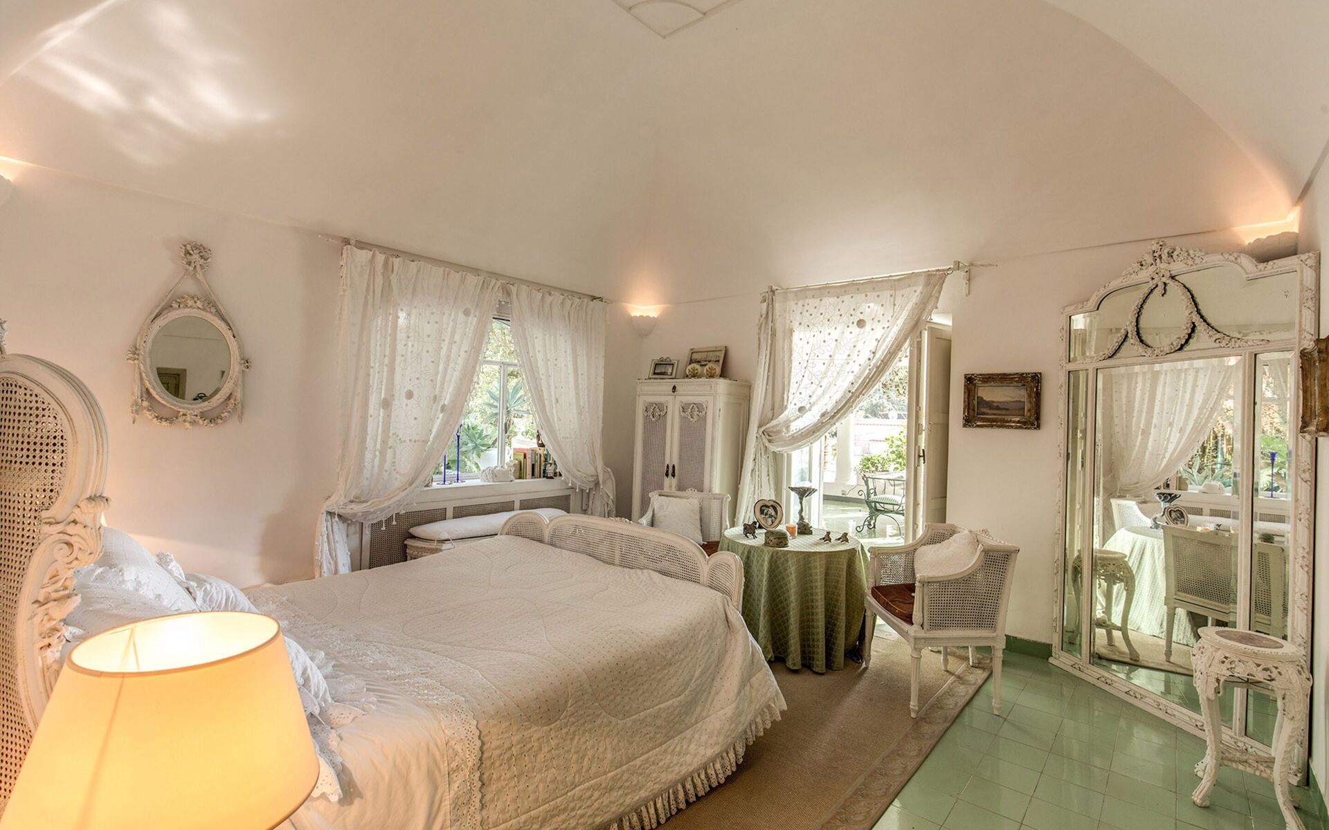 En traversant les jardins luxuriants et en descendant un large escalier, on arrive à l’entrée de la dépendance. Cet appartement indépendant dispose également d’un accès séparé directement depuis la route principale.