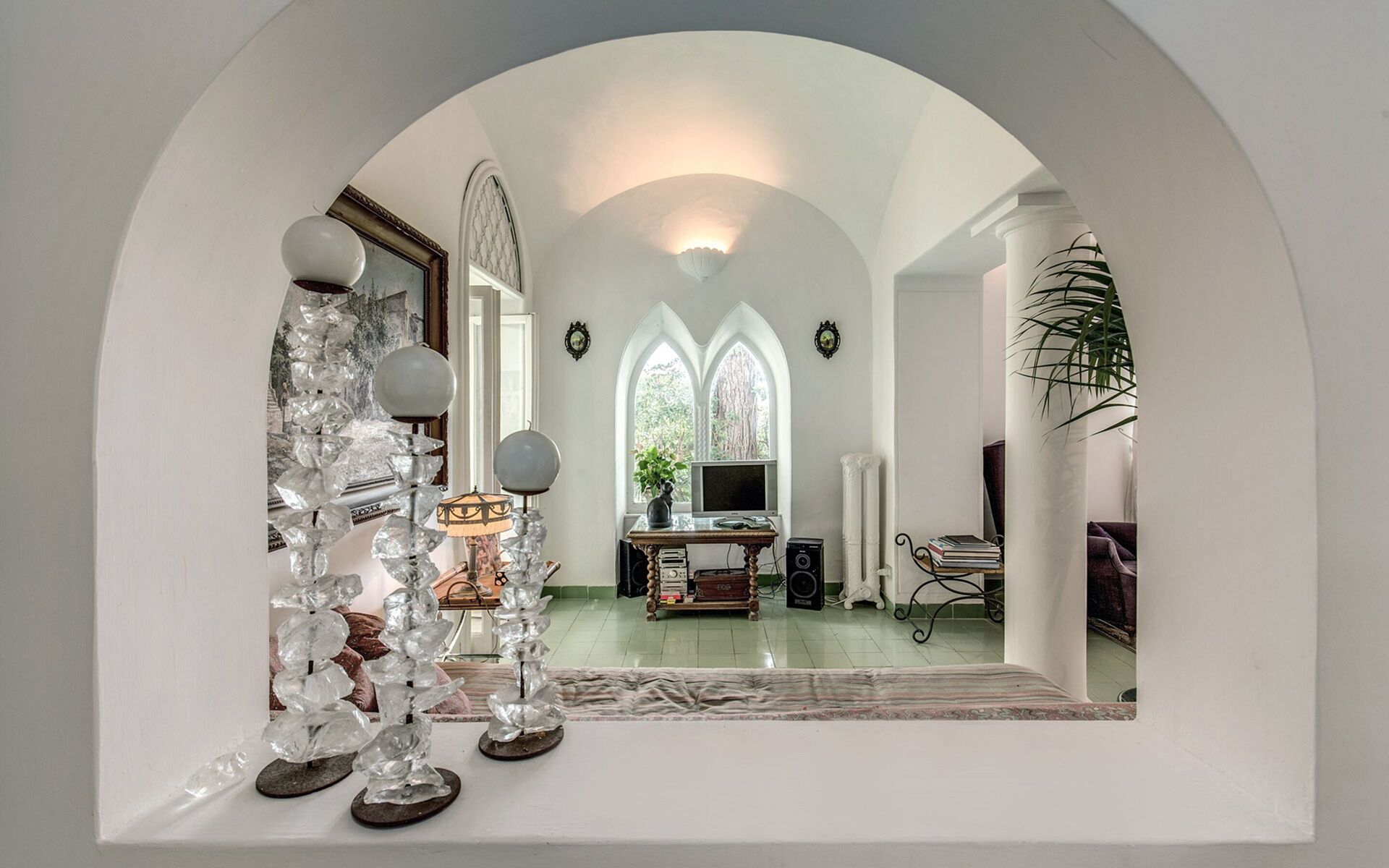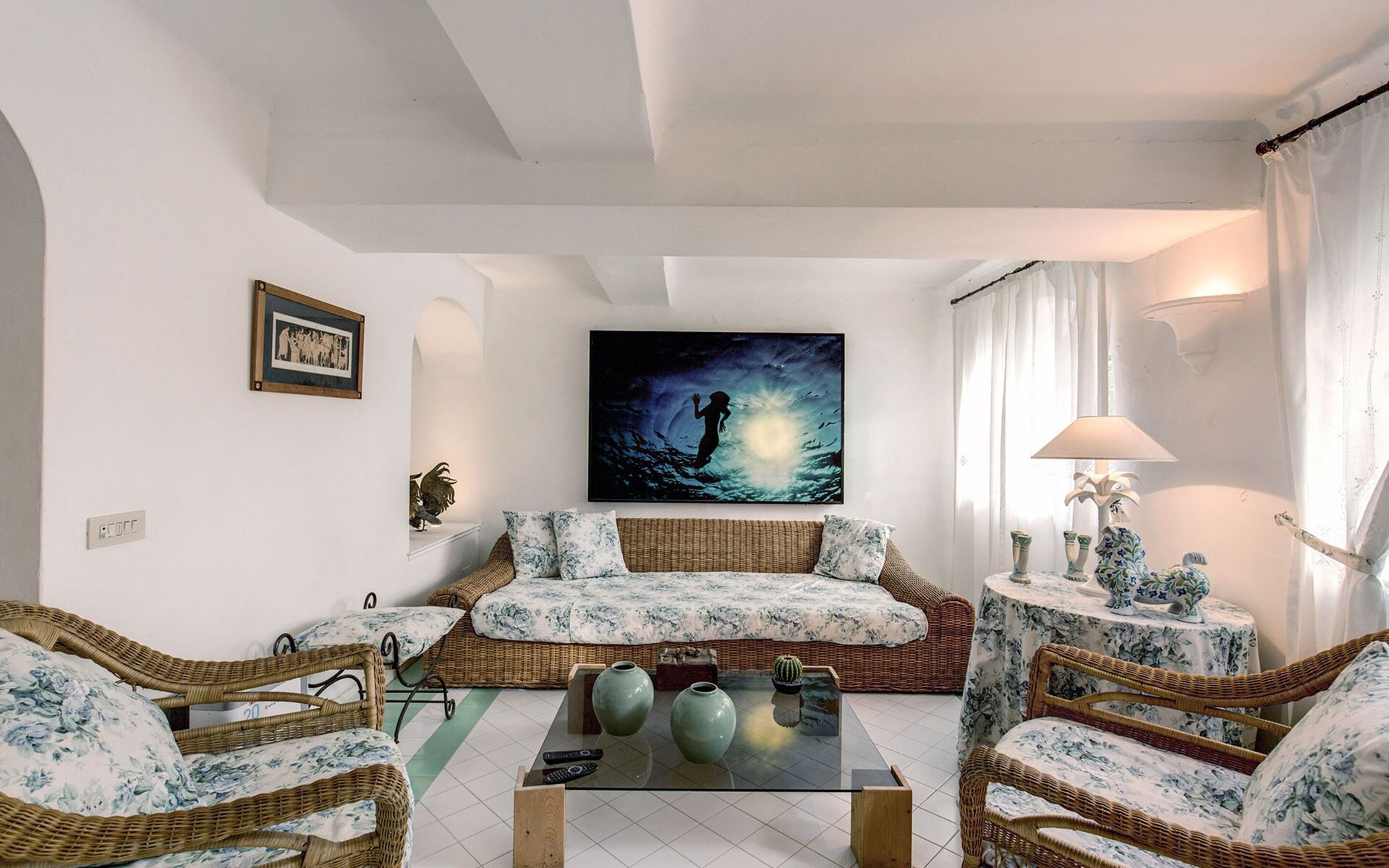 Par le couloir, on accède au grand salon avec plafonds voûtés, canapés et portes-fenêtres ouvrant sur la terrasse meublée offrant une splendide vue sur la mer. Juste derrière le salon principal, une série d’arcs et de colonnes mène à la salle à manger, qui peut accueillir confortablement jusqu’à huit personnes autour d’une luxueuse table en bois ancien. À côté du salon se trouve également une petite salle avec télévision et canapés, donnant elle aussi sur la terrasse lumineuse.
