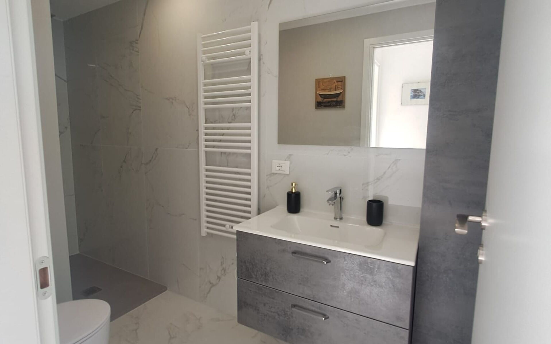 La partie nuit comprend deux chambres doubles : une avec un lit double et une avec un lit français, ainsi qu'une élégante salle de bains avec douche.
