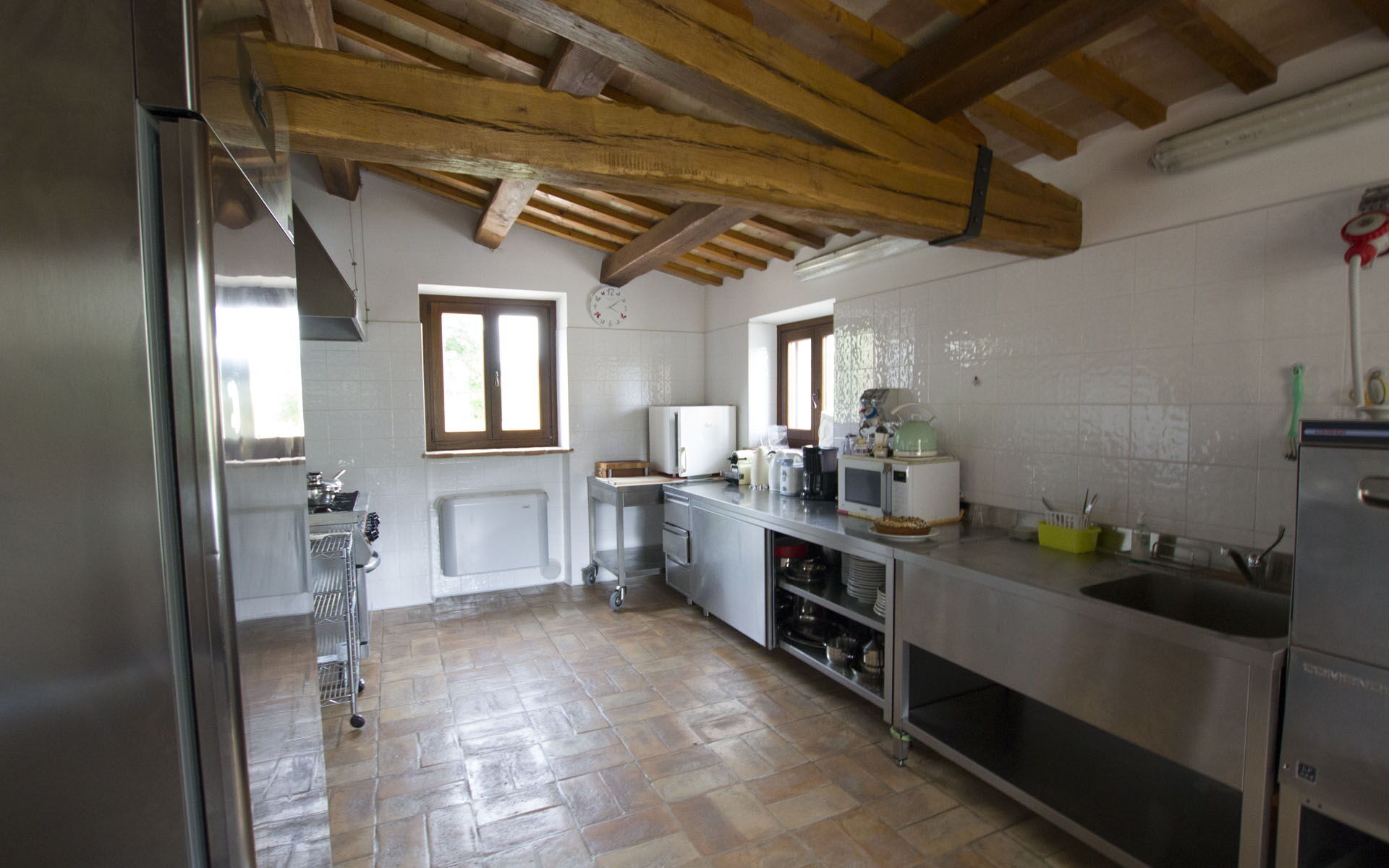 une cuisine spacieuse avec une longue table à manger pour tous les invités.