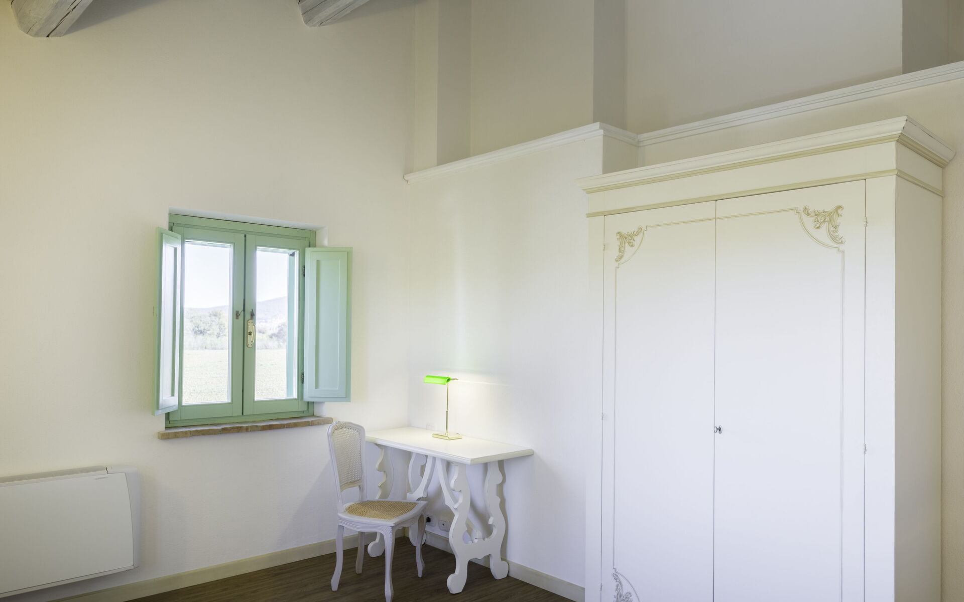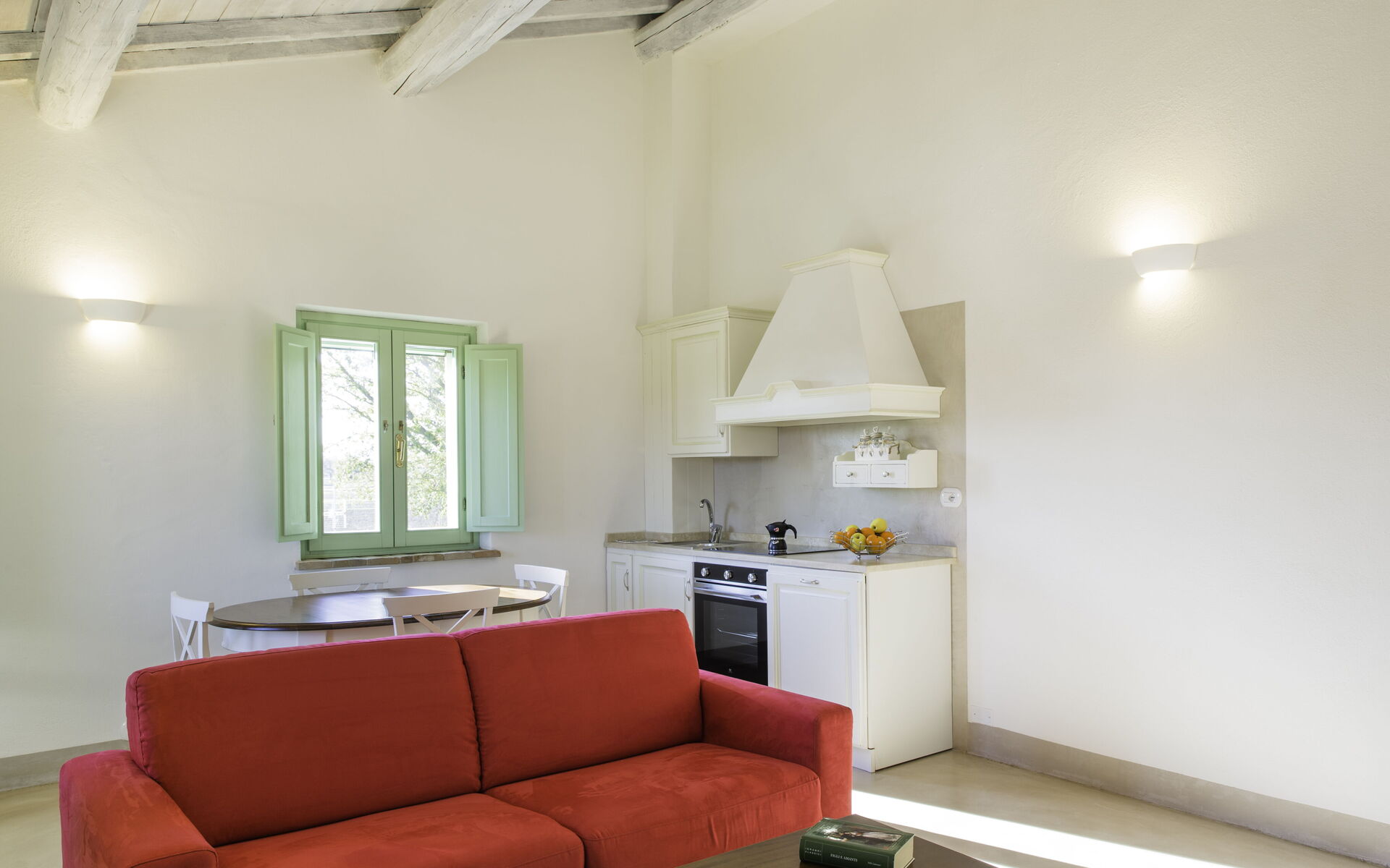 La plus petite ferme, très intime, dispose d'un séjour/entrée avec kitchenette, antichambre, chambre double avec jacuzzi située sous une grande fenêtre donnant sur la campagne plantée de blé ou de tournesols, salle de bain attenante avec douche-baignoire turque.