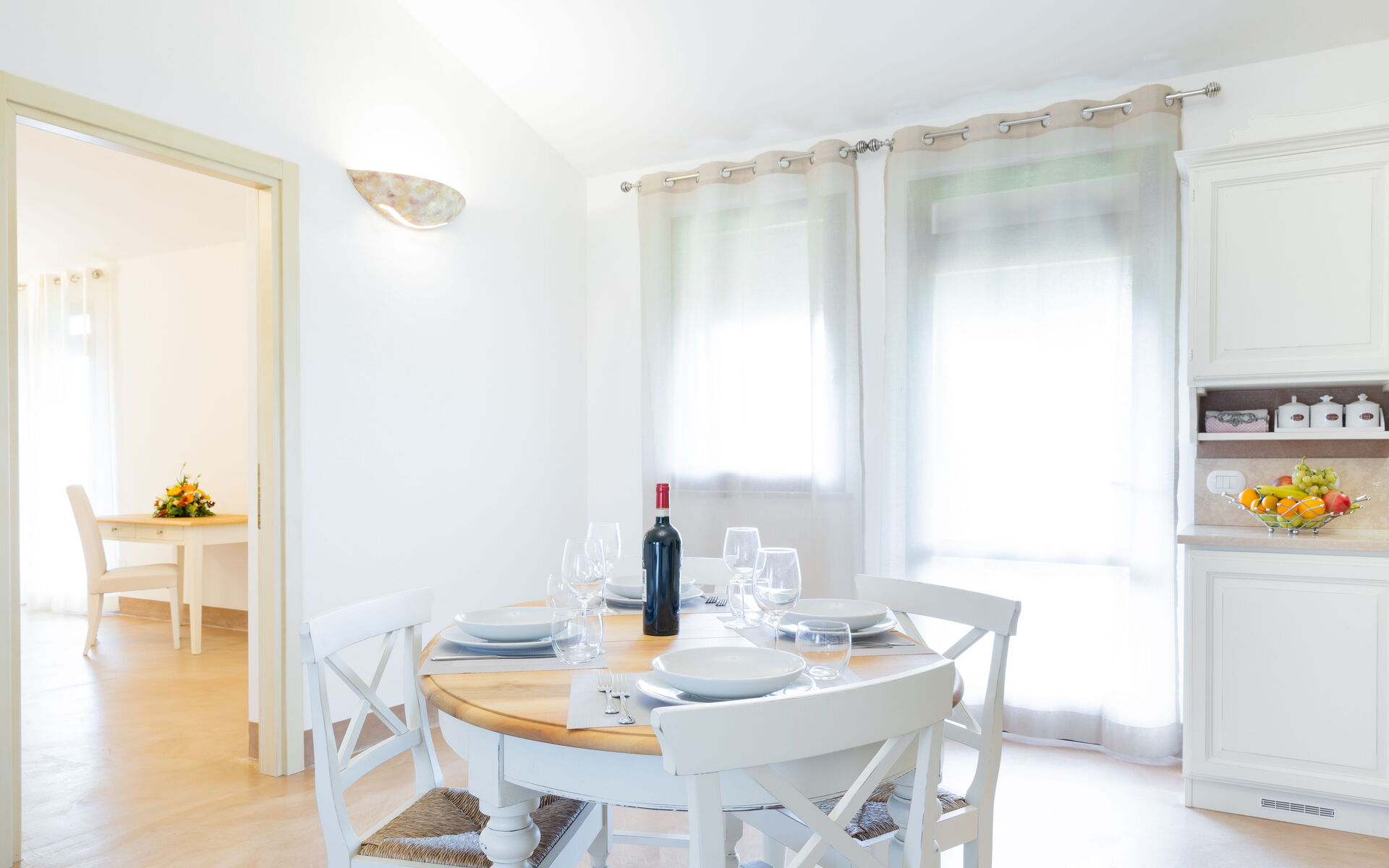 Au premier étage, accessible soit par l'escalier extérieur, soit par un ascenseur intérieur, nous trouvons une suite avec deux chambres doubles avec salle de bains privative et un salon avec kitchenette.