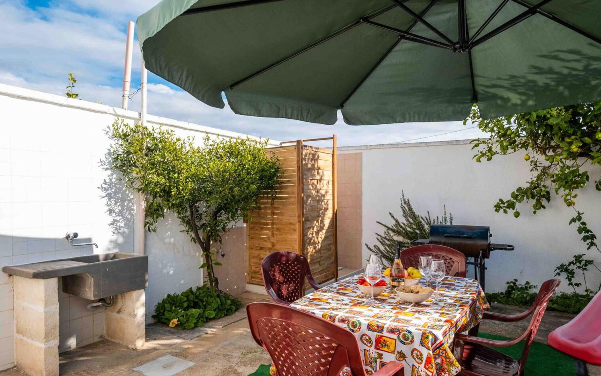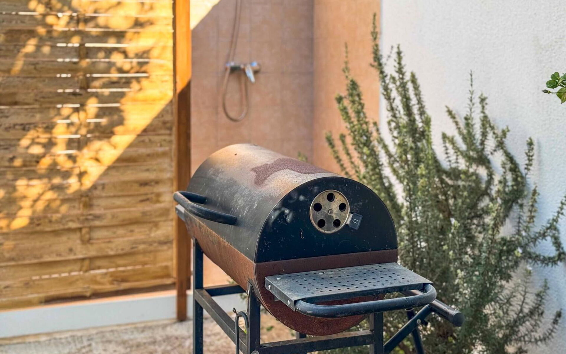 Meuble de jardin, Barbecue, Douche, Espace extérieur pour les repas en plein air, Aire de jeux pour les enfants, table à manger