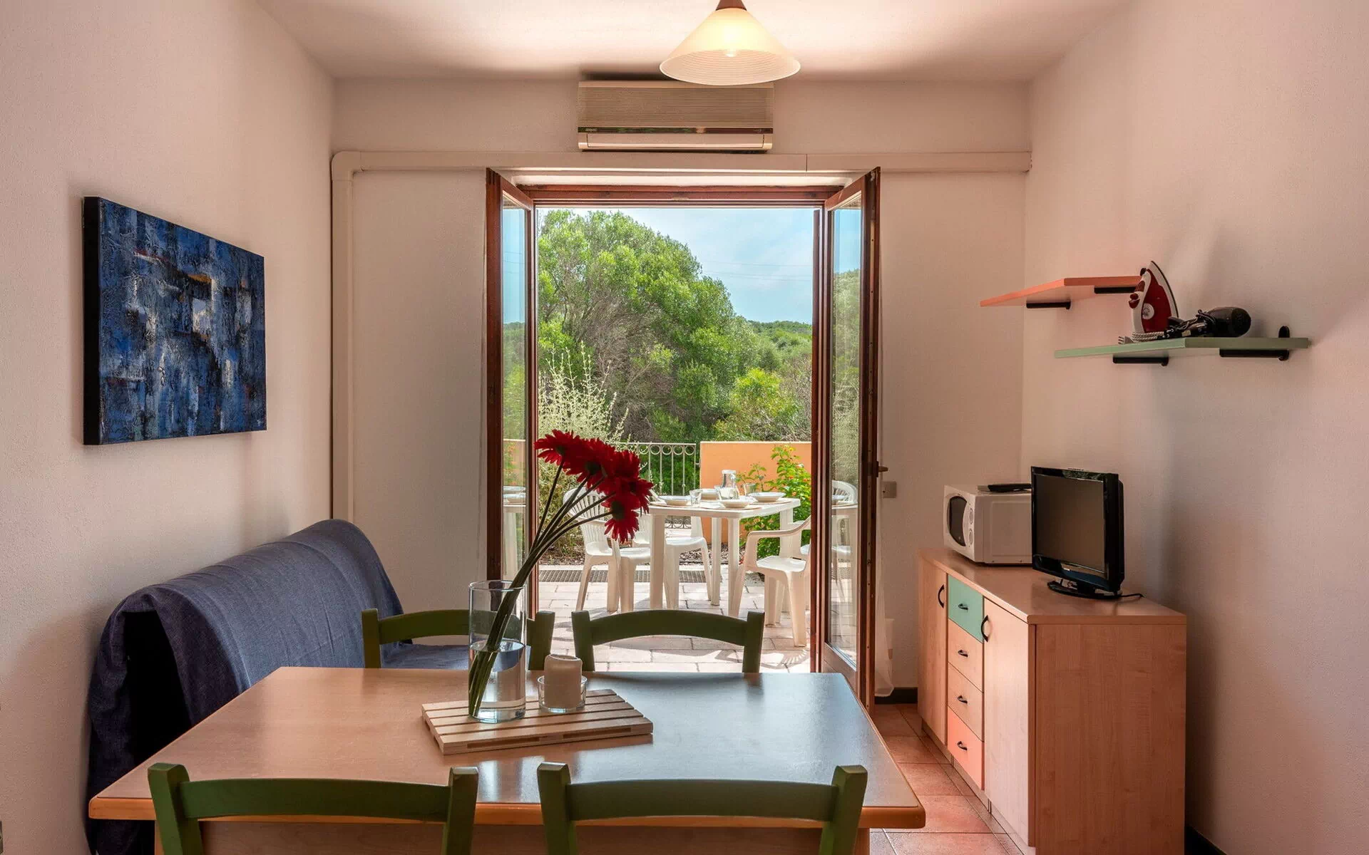 Les appartements se composent d'une chambre double, d'un salon avec kitchenette, d'un canapé-lit double, d'une salle de bain avec douche, d'un balcon ou d'un patio équipé, de l'air conditionné, d'un four à micro-ondes et d'un accès Internet sans fil.Les animaux domestiques sont les bienvenus moyennant un supplément. Bien qu'ils appartiennent au même type, ils peuvent différer en termes d'ameublement et d'équipement.NB : 50 euros pour l'absence de nettoyage de la kitchenette et 50 euros pour l'absence d'élimination des déchets à payer sur place. MACHINE À CAFÉ AMÉRICAIN : 2,00 € par nuit.