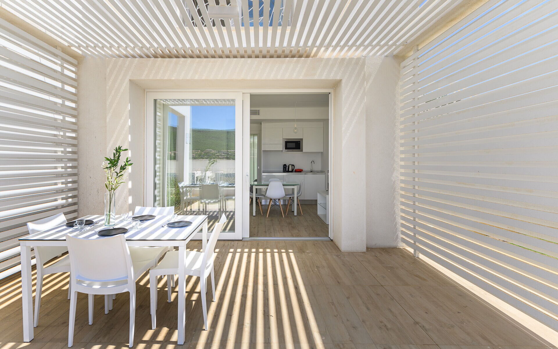 résidence se compose de 56 appartements répartis en 5 groupes. Ils sont situés soit au rez-de-chaussée avec terrasse, soit au premier étage avec terrasse, équipés de table et de chaises. Au sein de la structure, il y a des installations communes comme une piscine, un barbecue et une aire de jeux.