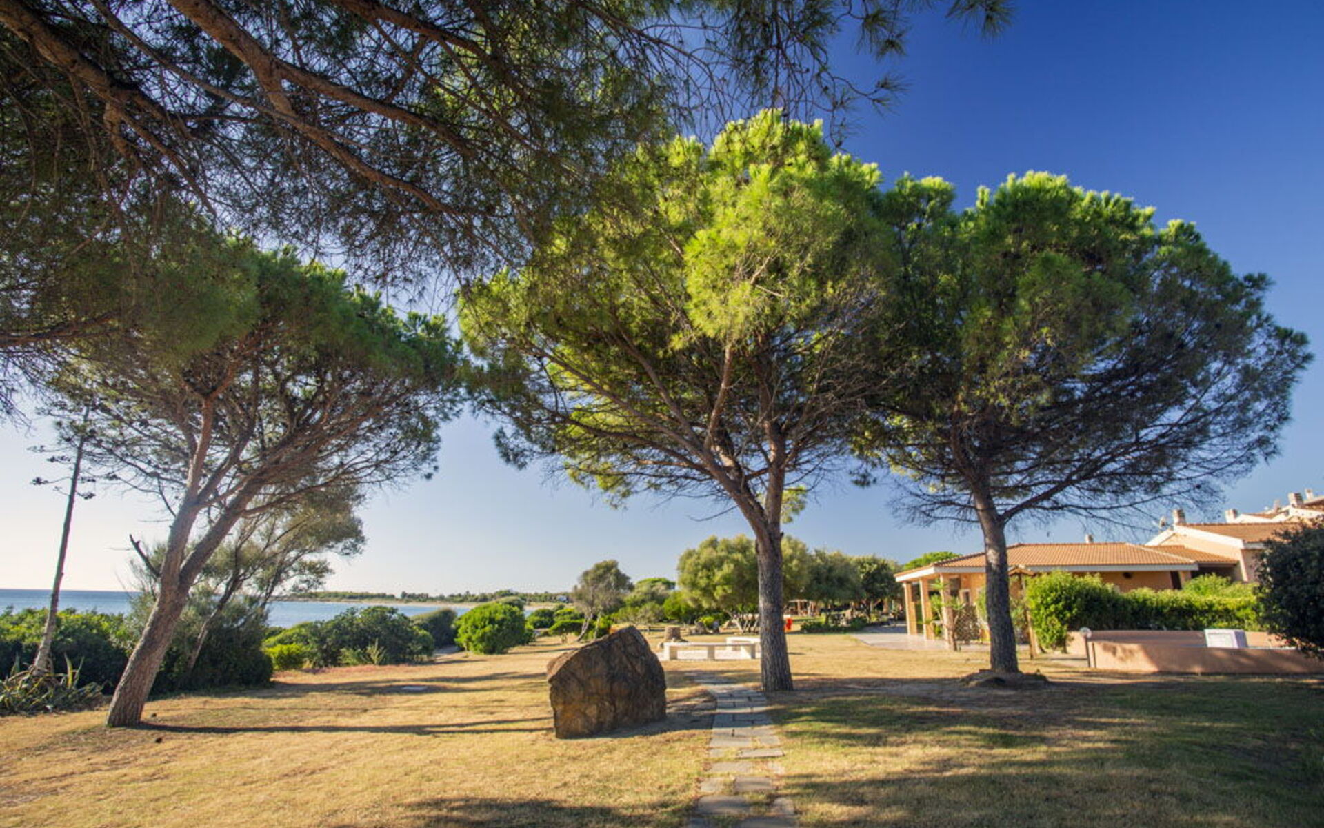 Appartements résidentiels en bord de mer à Villaputzu, sur la côte sud-est de la Sardaigne, près de Costa Rei. Plage de sable fin avec un fond marin en pente.