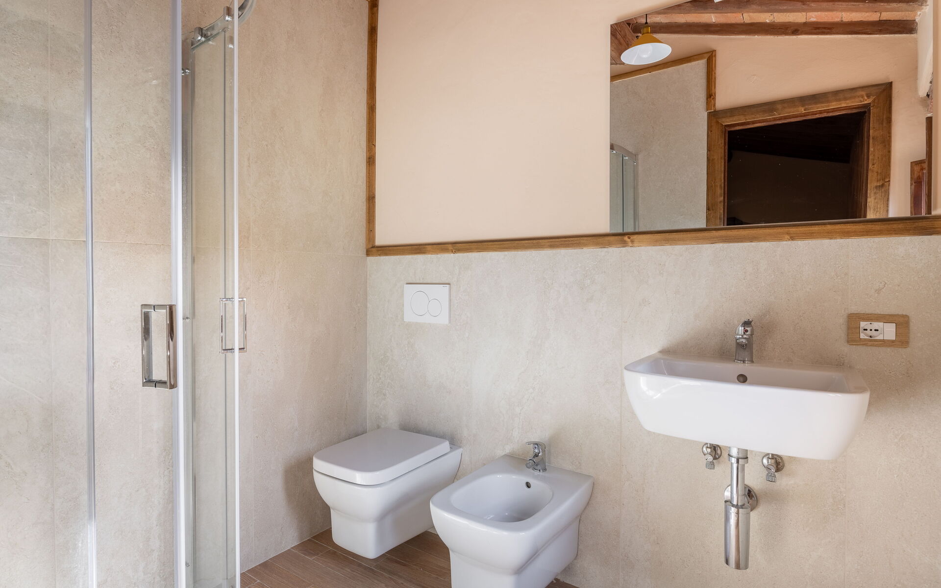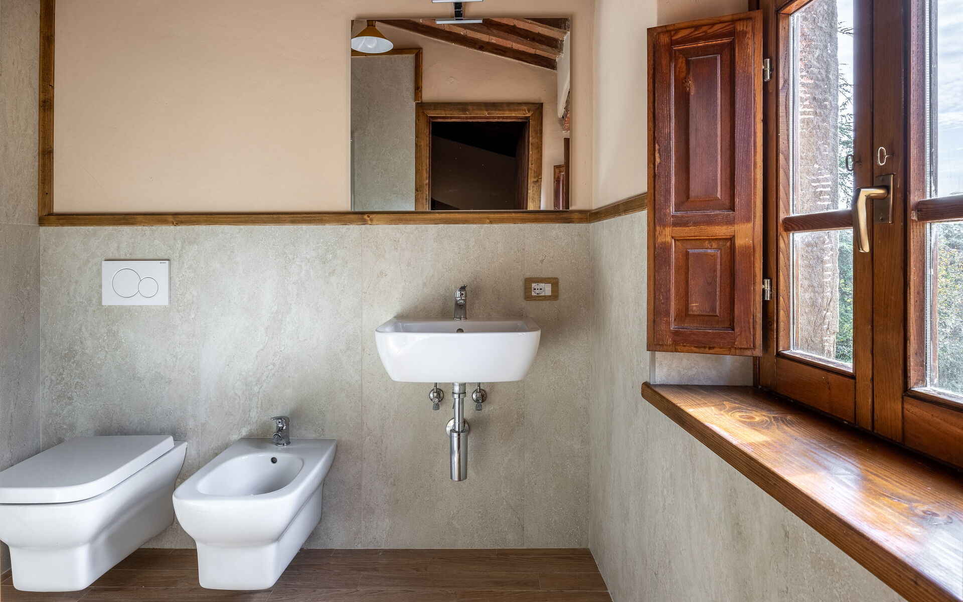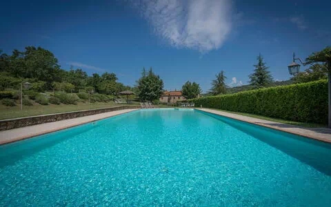 L'accès à la maison se fait par un chemin naturel de 100 mètres. L'ameublement est confortable et de style rustique toscan. Au sous-sol, il y a deux salles avec des plafonds bas, l'une avec une table de ping-pong et l'autre avec une table de billard.