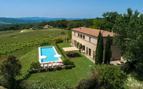 La Villa se dresse sur une colline dans la vallée intacte de la rivière Ombrone et bénéficie d'une vue suggestive sur quelques vignobles et châteaux typiques qui veillent sur l'horizon.