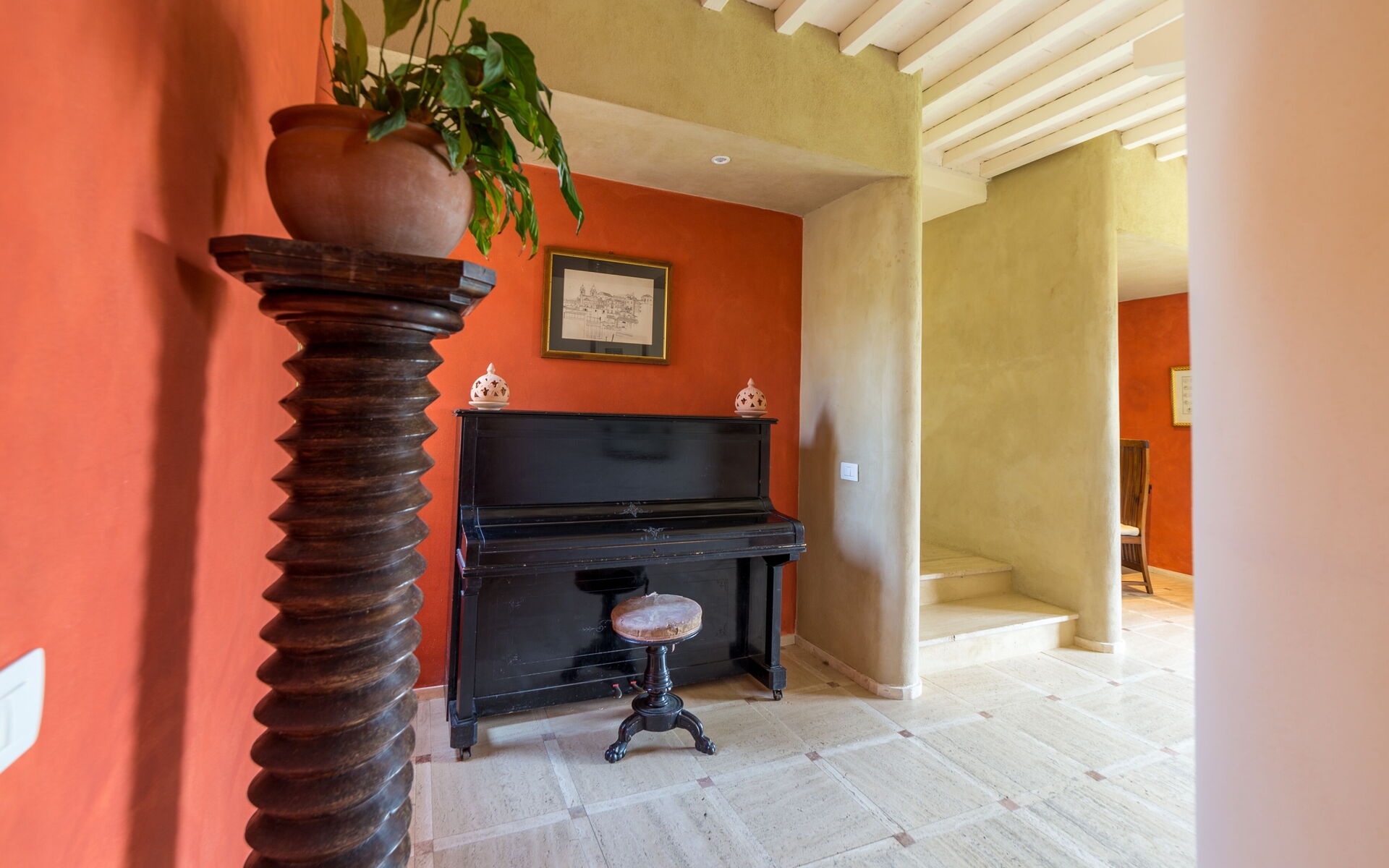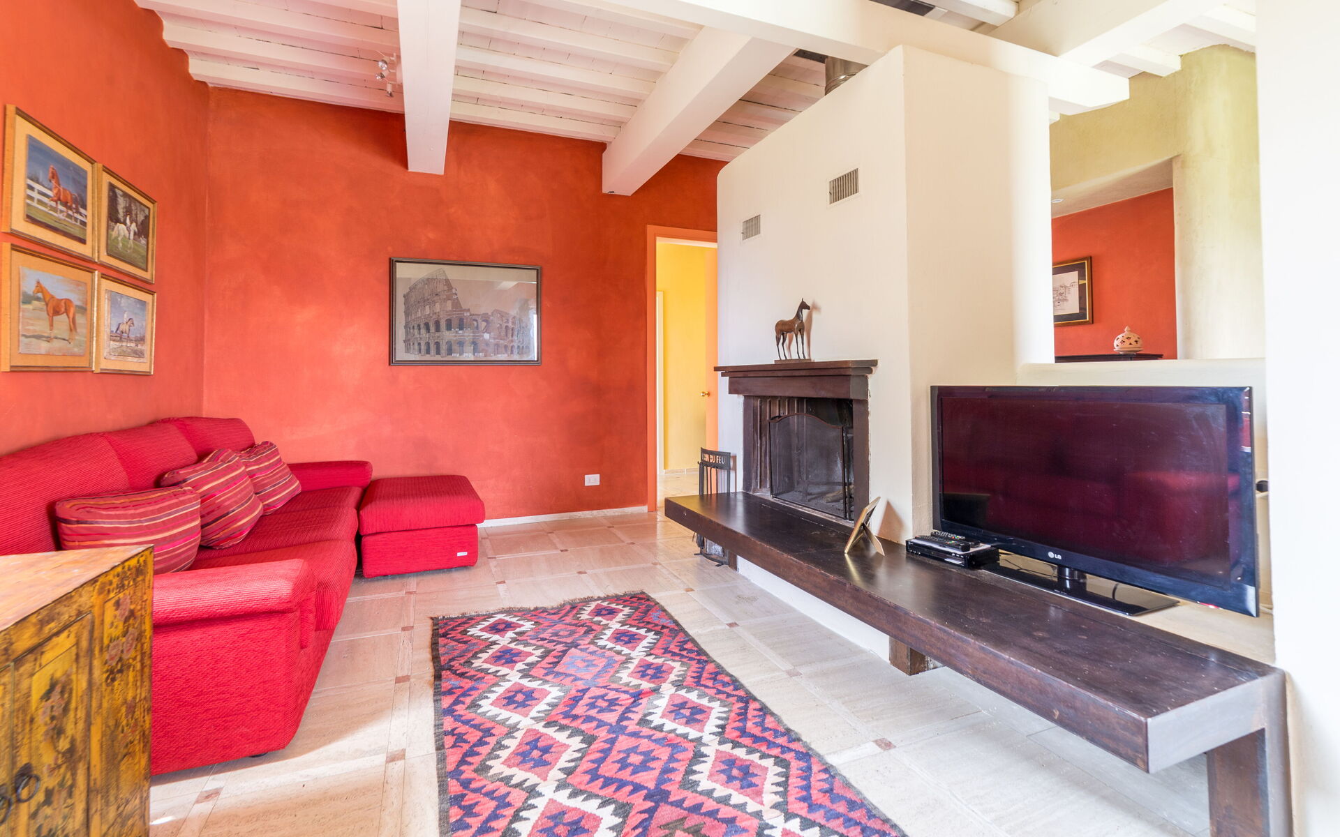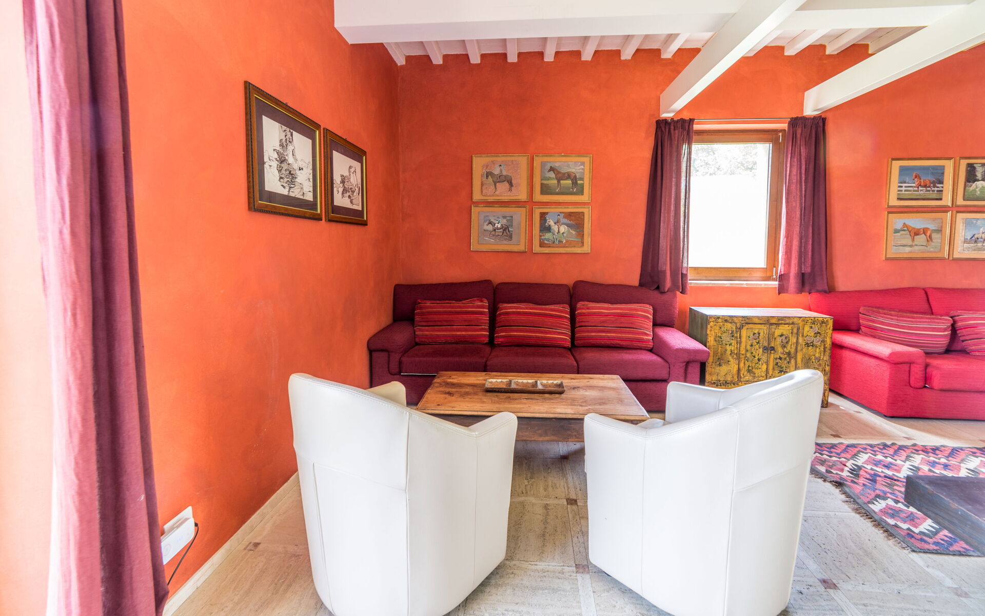 Dans le salon, avec des canapés rouges et des murs teintés d'orange, une cheminée cosy et un coin lecture avec des fauteuils de couleur claire qui se marient bien avec les poutres blanches apparentes. Il y a aussi un piano droit. Les ouvertures apportent une grande luminosité dans toute la maison et permettent de sortir facilement dans le jardin.