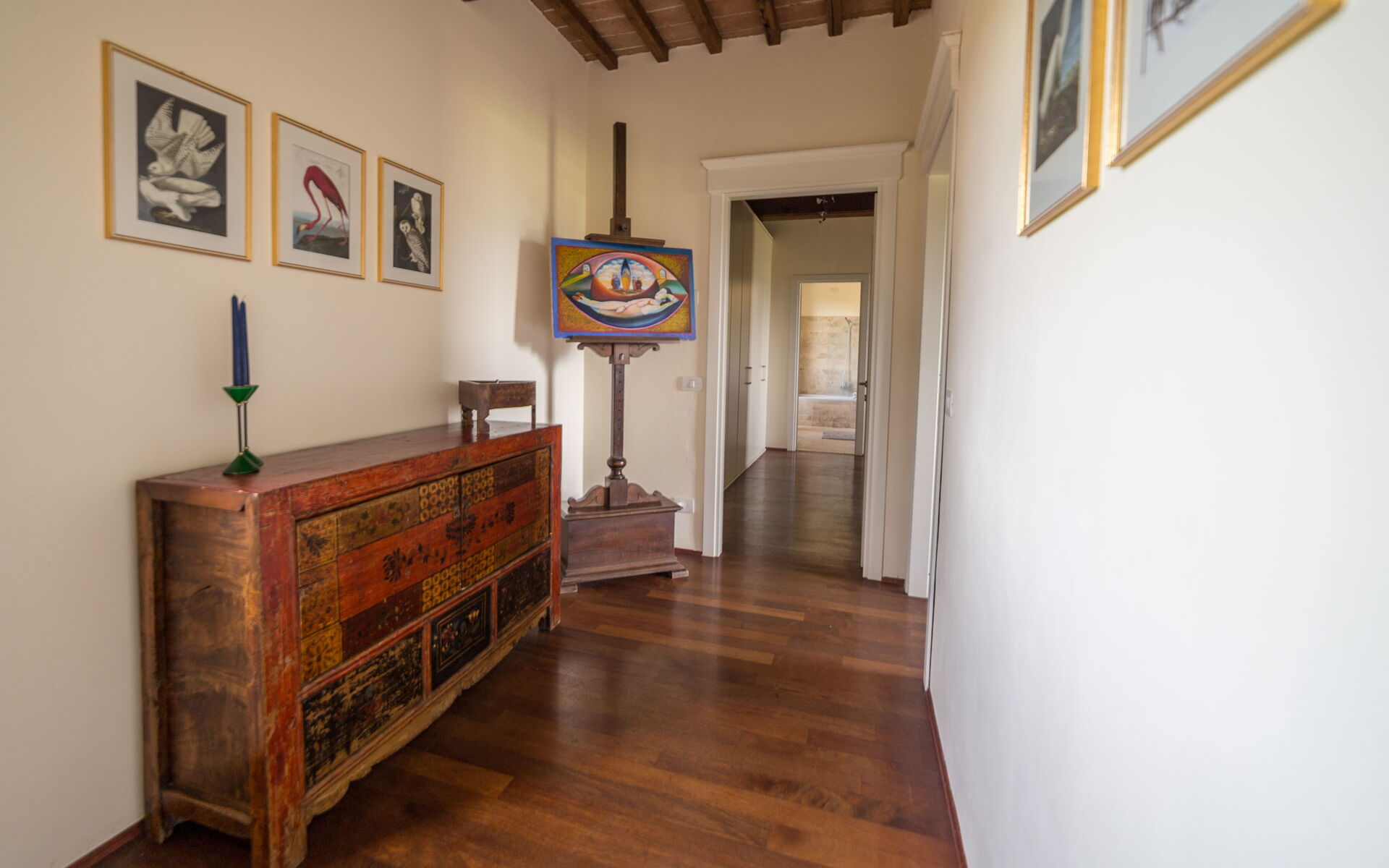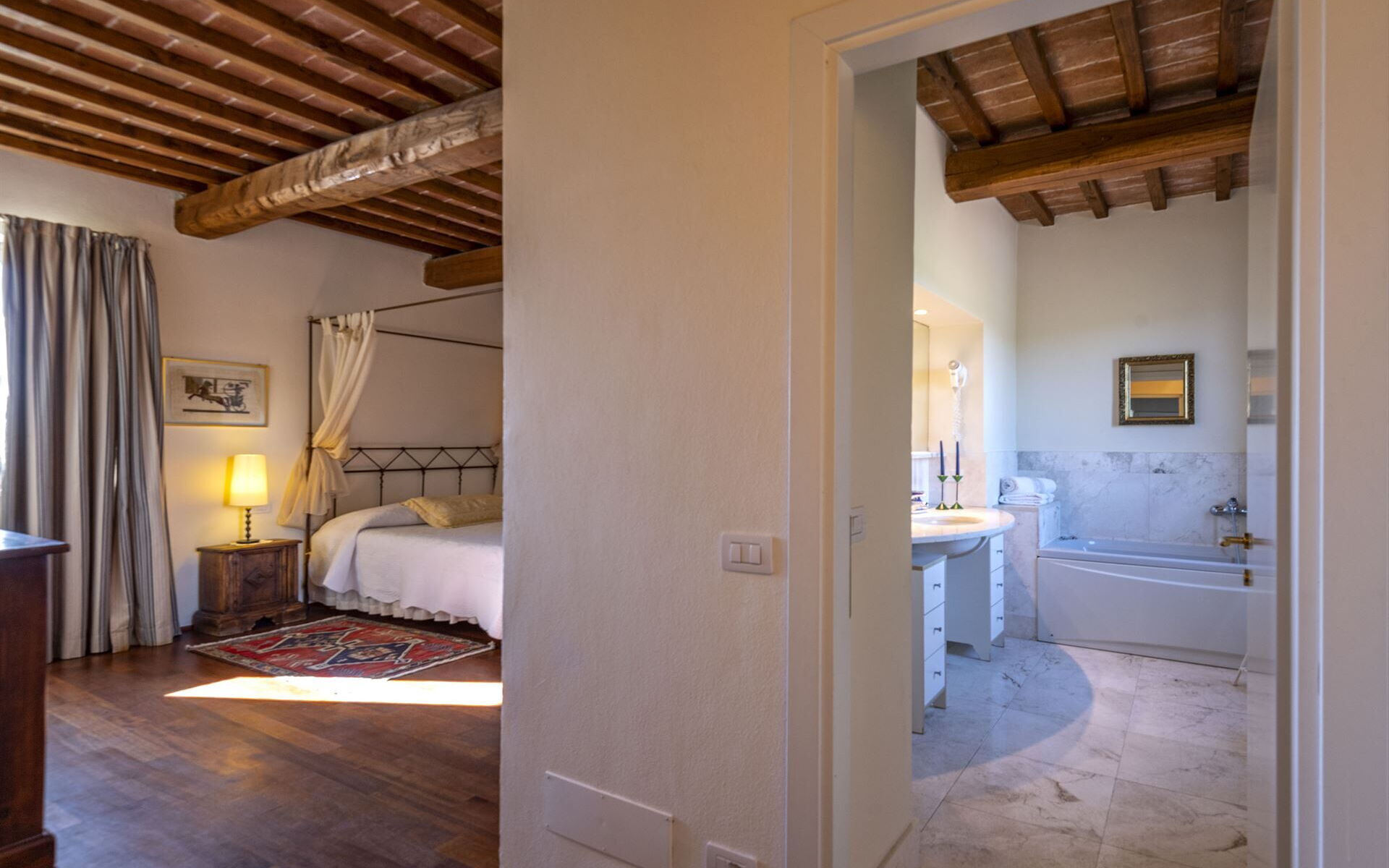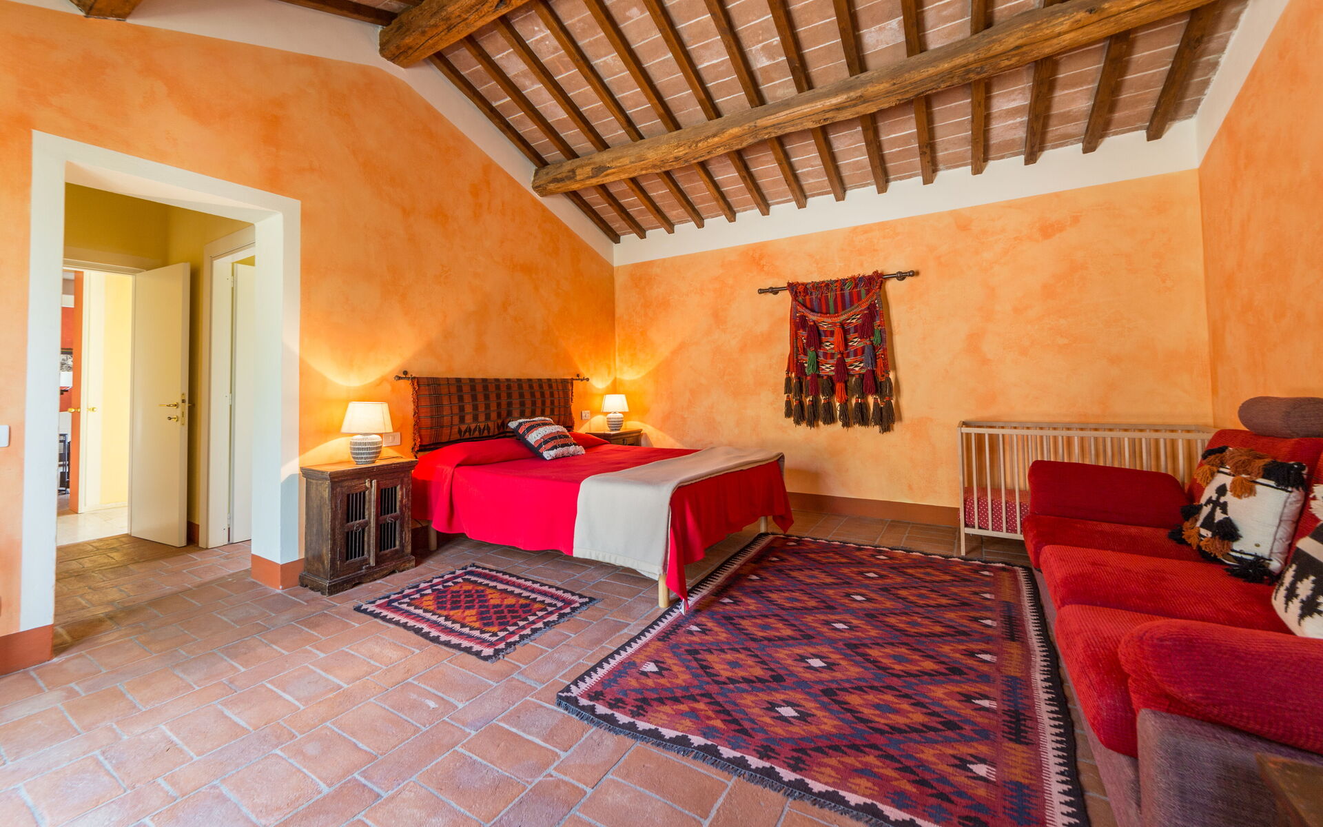 Les chambres de la zone nuit sont nobles avec des meubles anciens, des détails fins, des poutres apparentes, du parquet mais aussi des terres cuites et des pièces ethniques que les propriétaires ont insérées à l'intérieur de la maison après avoir parcouru le monde. Ici donc vous trouverez la chambre africaine avec coussins berbères et lampes marocaines ou la chambre thaï avec éléphant thaï et tête de lit de style asiatique. Deux des chambres ont un accès direct à un grand balcon en pierre.