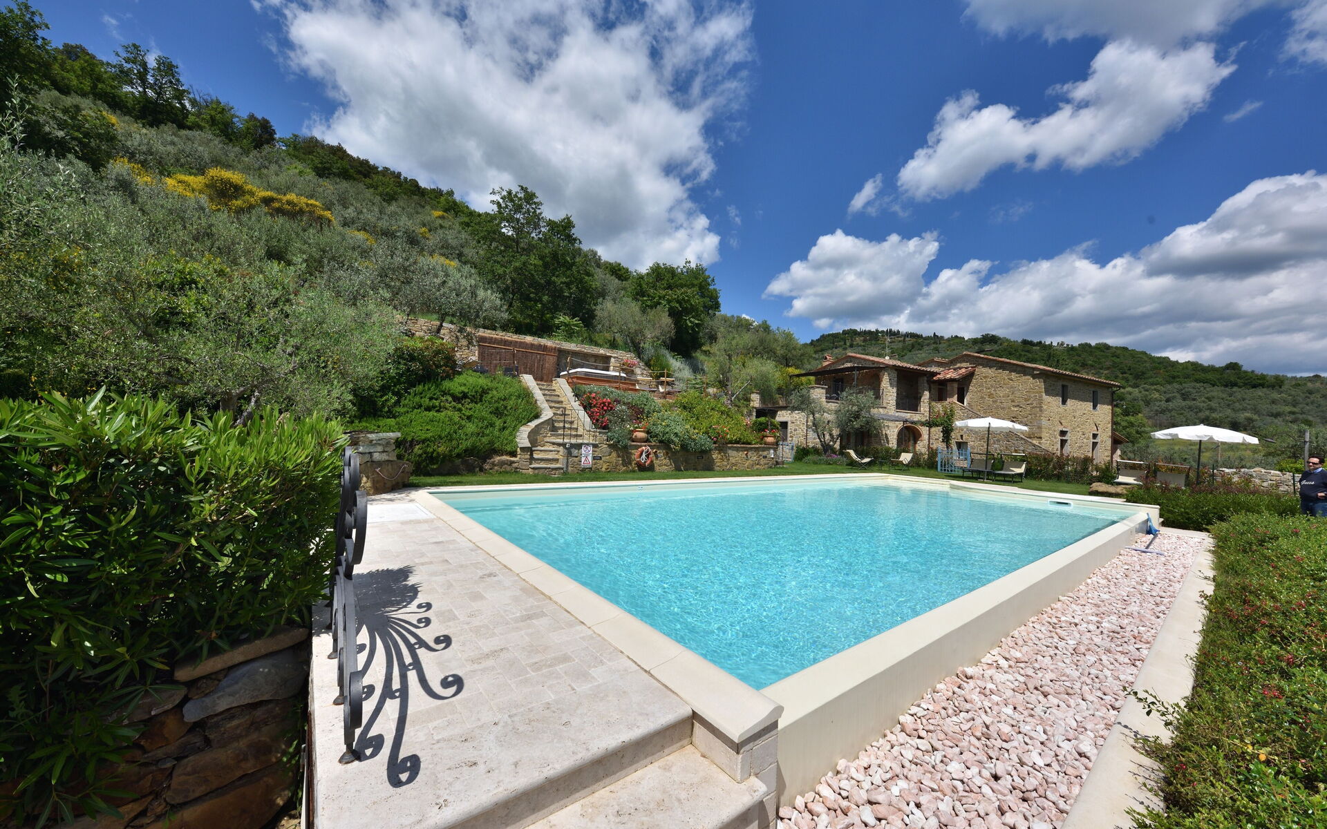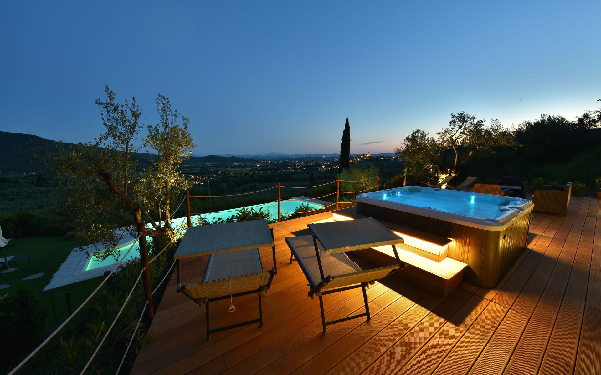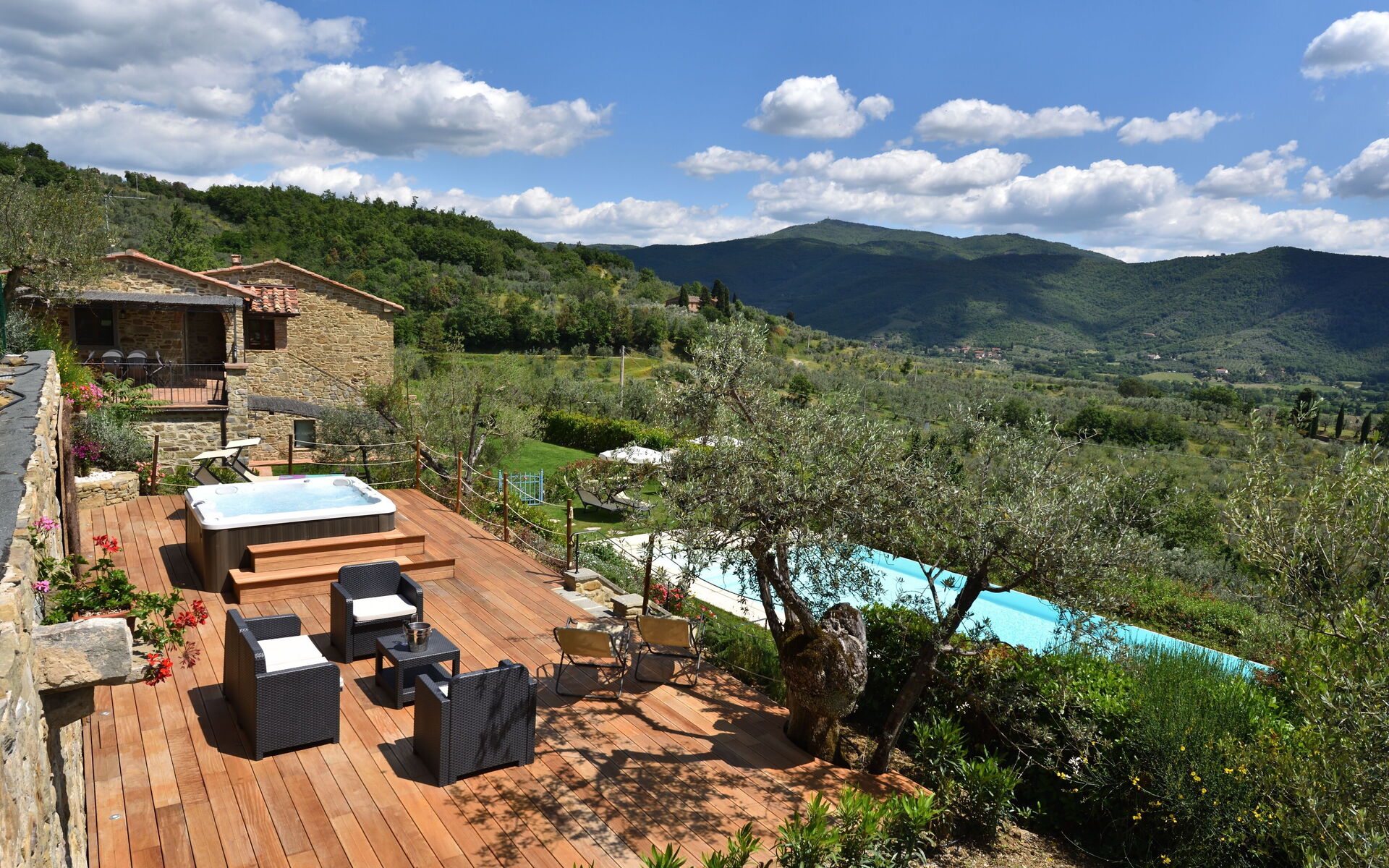A l'extérieur, le jardin encadre la splendide piscine de 6 mètres de large sur 12 mètres de long, avec une cascade, une zone de faible profondeur pour les enfants et un bord à débordement qui laisse libre la vue sur la vallée en contrebas. De plus, à l'extérieur, une grande terrasse pavée de bois avec un bain à remous chauffé et des chaises longues ainsi qu'un coin avec canapé et fauteuils et une petite table pour lire un livre ou pour une pause cocktail. Des chaises longues et des parasols sont également disponibles au bord de la piscine dans un jardin verdoyant où vous pourrez marcher pieds nus pour ensuite profiter d'un plongeon dans l'eau. Toute la zone est éclairée, ce qui permet de l'utiliser même la nuit. Également à l'extérieur, vous trouverez également un four à bois couvert par un toit et un espace barbecue pour griller en plein air et pour cuire de savoureuses pizzas.