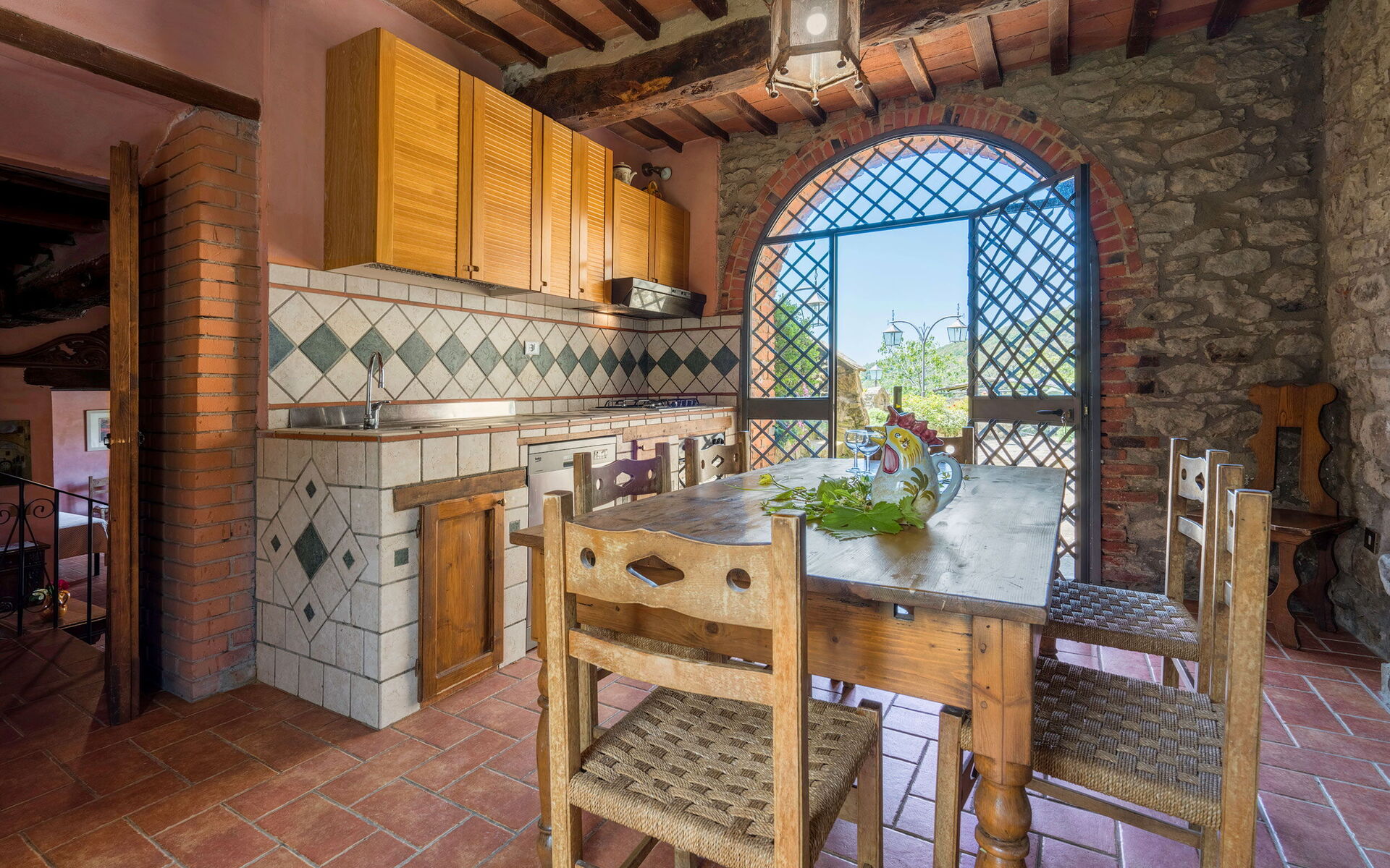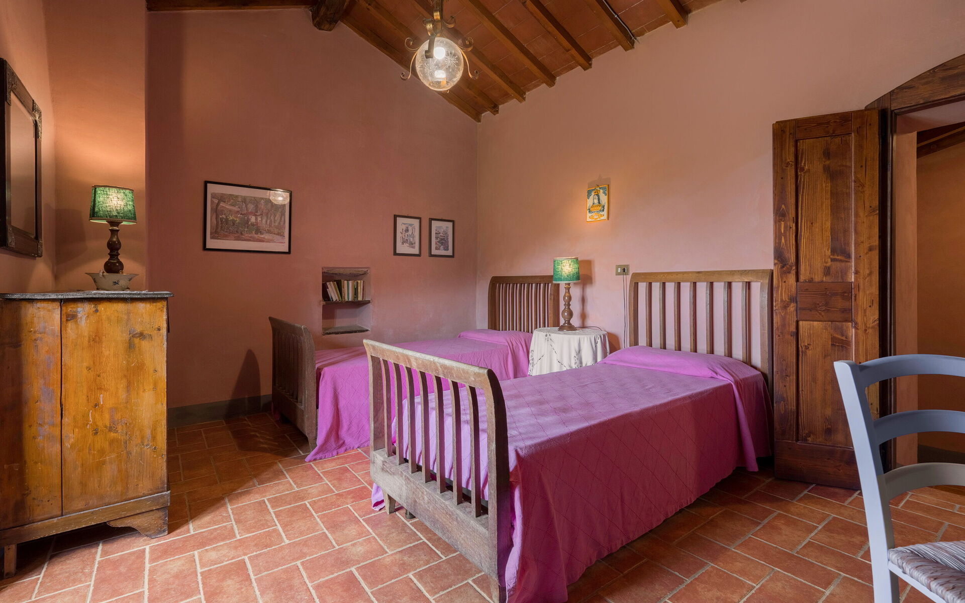 Il est également possible de visiter Cortona avec ses magnifiques galeries d’art, ses restaurants typiques et ses boutiques artisanales, ainsi qu’Arezzo ou le lac Trasimène, à seulement 20 km. Les espaces extérieurs avec porches et vérandas sont parfaits pour vos repas en plein air.