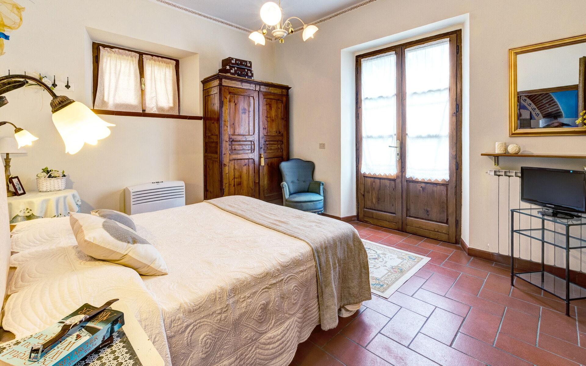 Équipé d’un magnifique patio extérieur avec une vue imprenable sur le jardin et la colline cortonaise, l’appartement, complètement indépendant, permet aux clients de préserver leur intimité et profiter de moments de détente absolue. Les intérieurs préservent le style traditionnel toscan avec des sols en terre cuite, des poutres apparentes en bois et des murs de pierre qui, combinés à des éléments modernes, donnent un charme incontesté à l’environnement. La cuisine est entièrement équipée et dispose d’un salon adjacent et avec canapé (transformable en canapé-lit) et tv.