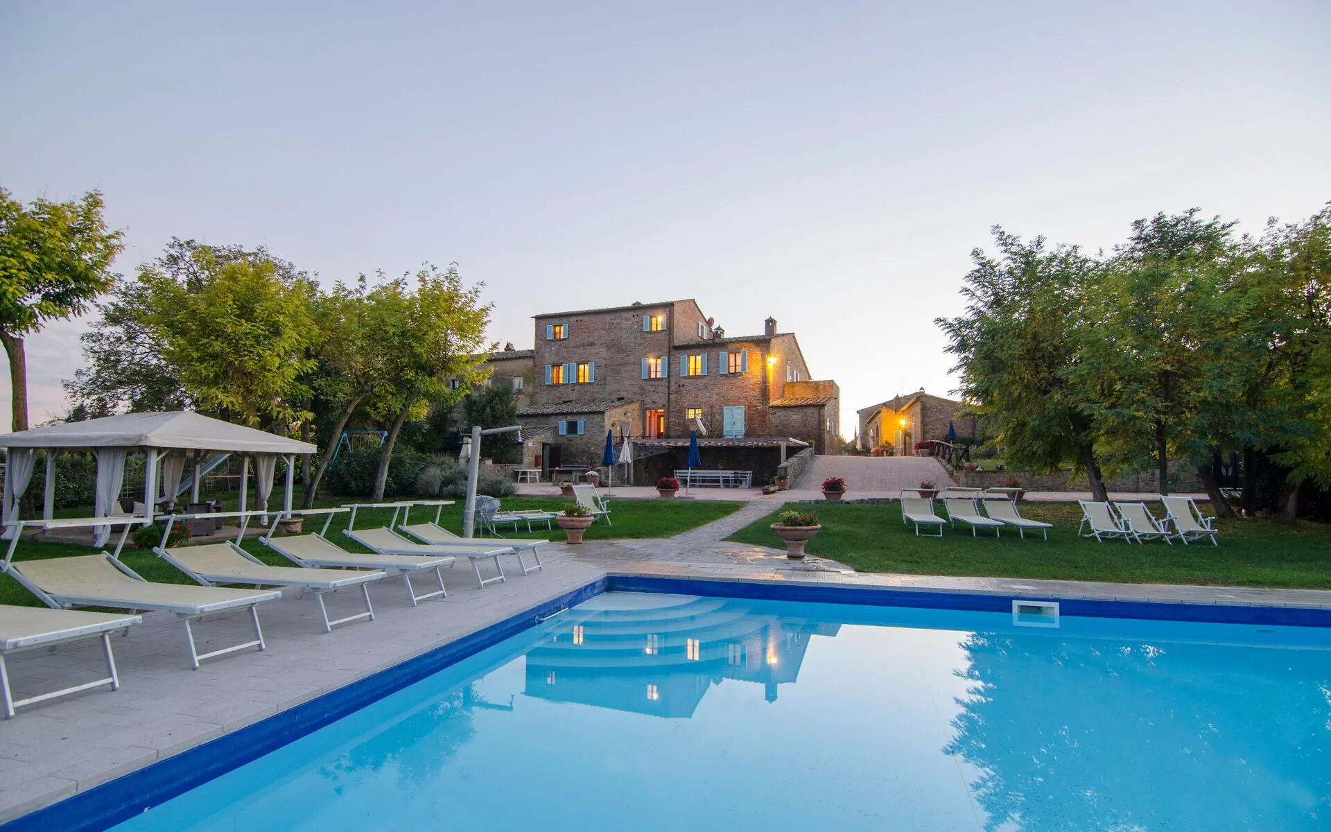 Meuble de jardin, Barbecue, pavillon, Internet WiFi, Piscine, Espace extérieur pour les repas en plein air, Chaise longue, Aire de jeux pour les enfants, table à manger